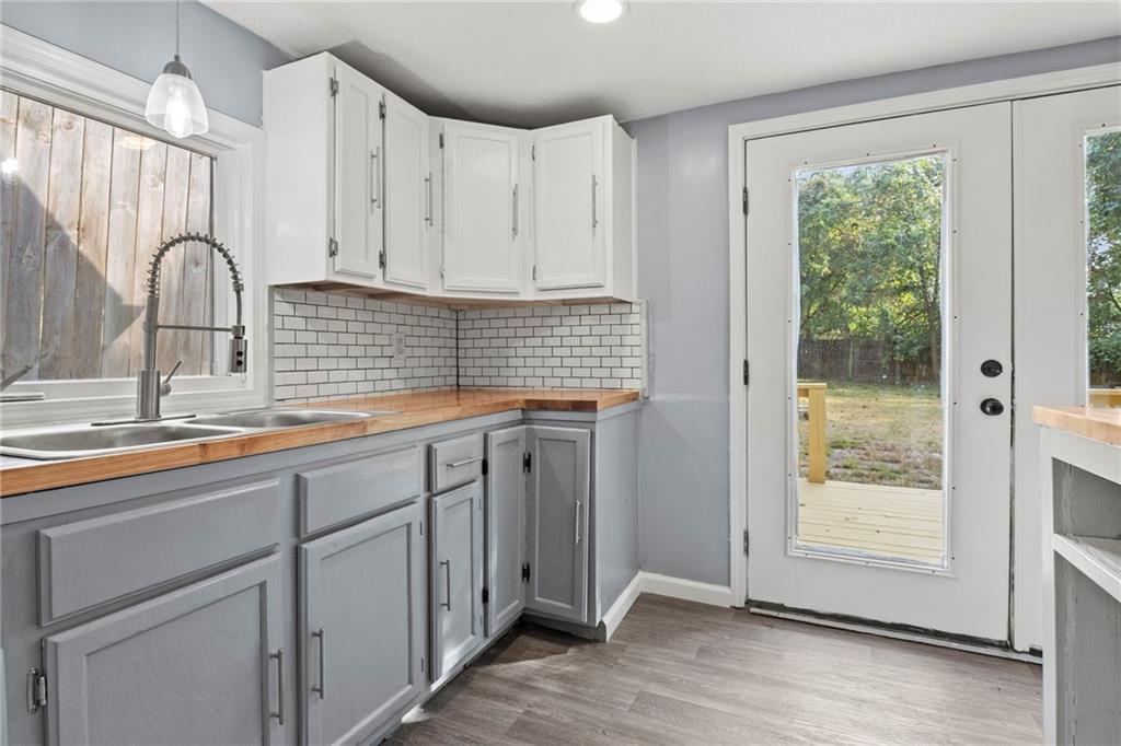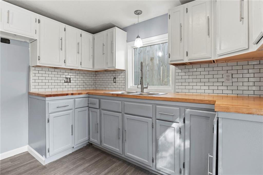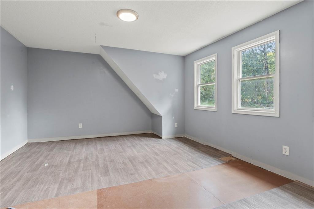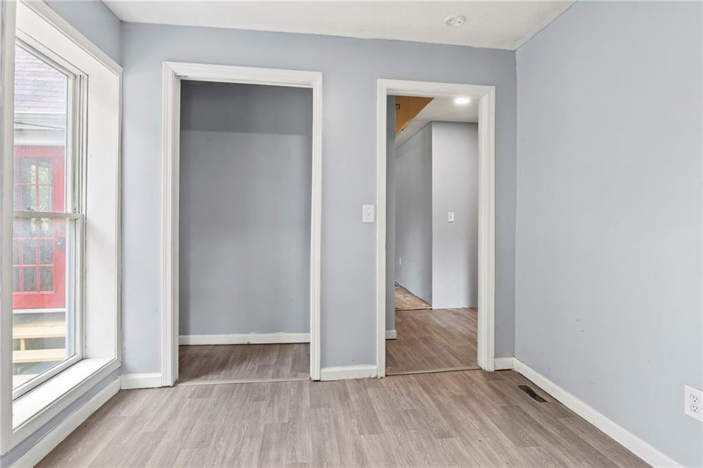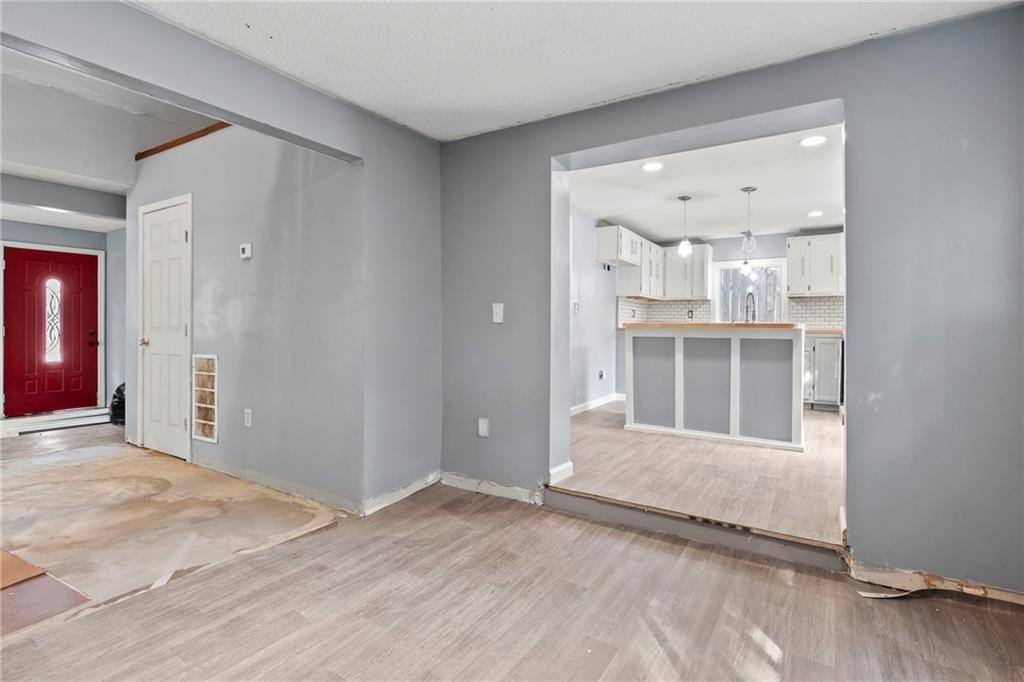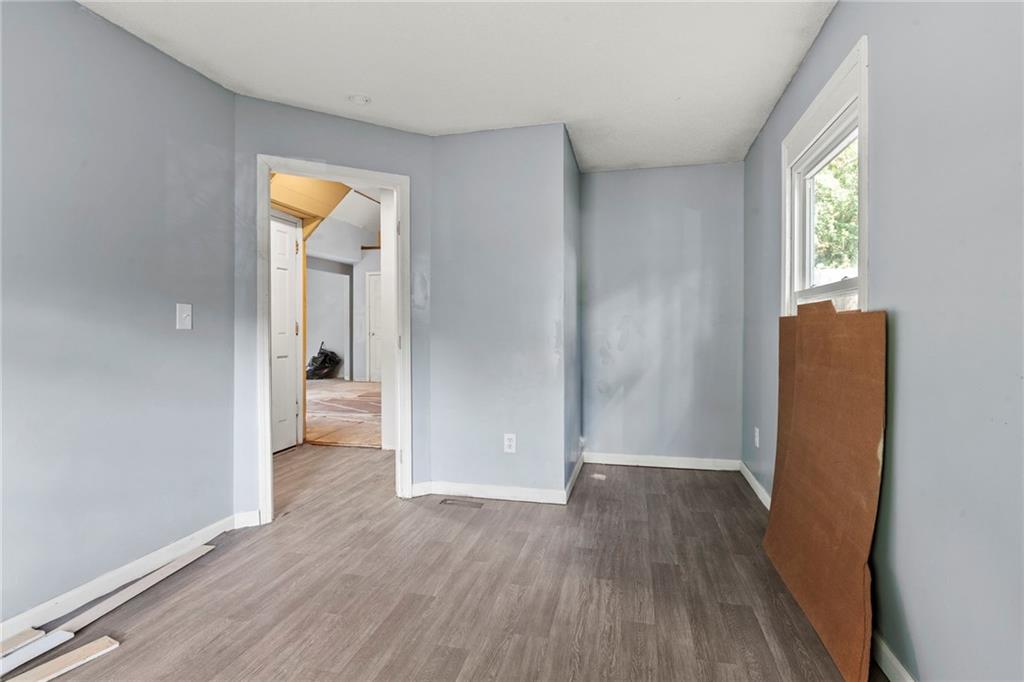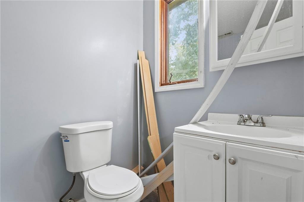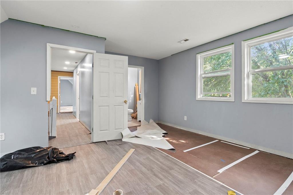 Opportunity knocks with this spacious 1.5-story traditional home. The exterior already has great curb appeal with white trim and a bold red front door. Inside, much of the heavy lifting has been started—updated flooring, modern lighting, and a kitchen with painted cabinets, subway tile backsplash, butcher block counters, and a center island. French doors off the kitchen open to a new deck and private backyard, creating a strong foundation for finishing touches. The main level features a light-filled living room, dining space, updated kitchen, full bath, and two bedrooms. Upstairs, you'll find a generous primary suite with an expansive walk-in closet, ensuite bath, plus another large bedroom and full hall bath. With laundry on the bedroom floor, the layout works for both owner-occupants and rental potential. With an attached garage and cosmetic projects already underway, this property is primed for an investor to complete renovations and unlock strong equity. Located on a city lot with quick highway access, this home has all the right bones—bring your vision and finish it out for a solid return.