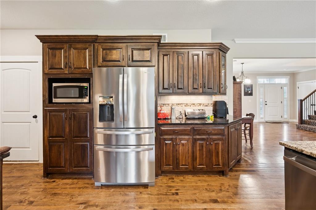 Well maintained 1 owner home in sought after Staley Hills. This is the expanded Lexington II by McFarland. Seller loves the neighborhood, their neighbors and its convenient location but no longer needs all the space and ready to downsize. You'll love the openness of the main level with gleaming hardwood floors and abundance of windows allowing for lots of natural light! Formal dining area makes ideal office, additional living area or as the seller has done, the perfect place for your grand piano. The great room has a fireplace with beautiful stacked stone surround and curved wall of windows overlooking the backyard. Spacious kitchen is an entertainer's dream with its large island including bar area for seating or the perfect buffet serving line, granite counters, abundance of cabinets, many with roll out shelves plus a HUGE walk-in pantry, stainless appliances featuring a gas range and a new dishwasher. The large eating area ceiling opens onto the covered patio which extends into the expanded patio the seller included when building the home. The primary suite features a raised ceiling with indirect lighting, LARGE walk-in closet, double vanity (granite) with a cabinet stack, tiled floor, corner whirlpool and separate shower room with oversize tiled shower. Secondary bedrooms each have a vaulted ceiling, ceiling fan and private bath access. Bedroom 2 has a walk-in closet. Lower level family room is great for movie nights and great hang out area for kids and adults of all ages! There's a 5th bedroom with a walk-in closet but this room also makes a great private office, work out room, craft room or play room for all the kids' toys! There's also a 4th full bath in addition to unfinished storage areas. Enjoy the neighborhood pool, ponds and trails! Great location is close to stores, services, restaurants, entertainment and main roads for quick and easy access to KCI airport and downtown KC! Kids can walk to the highly rated emementary and high schools.