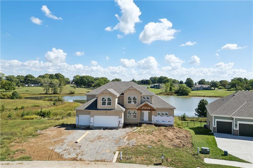 The “HANNAH” by Robertson Construction – perfectly positioned on a PREMIUM LAKE-BACKED LOT! This stunning 1.5-story home offers 5 spacious bedrooms and blends elegant finishes with comfortable living, making it truly exceptional. Step inside to an open-concept design featuring soaring ceilings, custom details, and abundant natural light. The main level includes the luxurious Master Suite and a 5th Bedroom—perfect for guests or a home office. The gourmet kitchen is a chef’s dream, complete with solid-surface countertops, a gas cooktop with a separate electric oven, walk-in pantry, custom cabinetry, and large center island. The kitchen opens seamlessly to the Great Room—ideal for entertaining or family gatherings. The Private Master Suite boasts a spa-like bath with an oversized soaker tub, walk-in shower, and custom walk-in closet. Additional main-floor highlights include a mudroom at the garage entry, formal dining room, breakfast area, full bath, and laundry room. Upstairs, you’ll find a spacious loft overlooking the main level, plus 3 secondary bedrooms—all with walk-in closets for ample storage—2 full baths, and an additional bonus closet. Enjoy the neighborhood pool and take advantage of the convenient location in the highly-rated Liberty School District, close to shopping, dining, entertainment, and the historic Liberty Square.