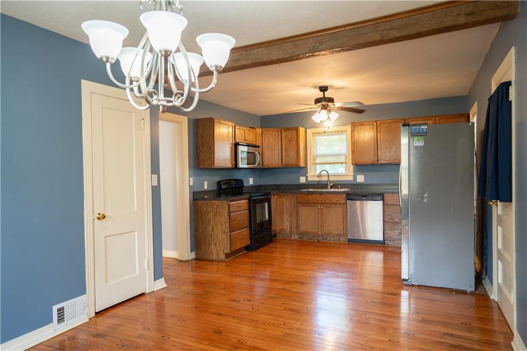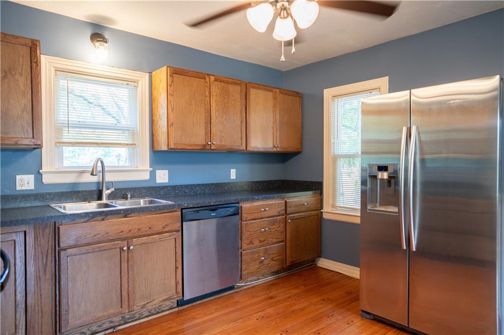 Welcome to 5116 NE 46th Street in the charming Sprinkle Heights neighborhood of Kansas City. This 3-bedroom, 1-bath bungalow offers over 1,300 square feet of cozy living space with a spacious kitchen, extra family room, and a freshly remodeled bathroom. One bedroom is on the main floor, with two more upstairs perfect for guests, kids, or your ever growing houseplant collection. Original wood floors add character, and the large yard with mature trees is great for BBQs, backyard games, or pretending you know how to garden. All this, plus an attached garage, in a quiet, friendly neighborhood.