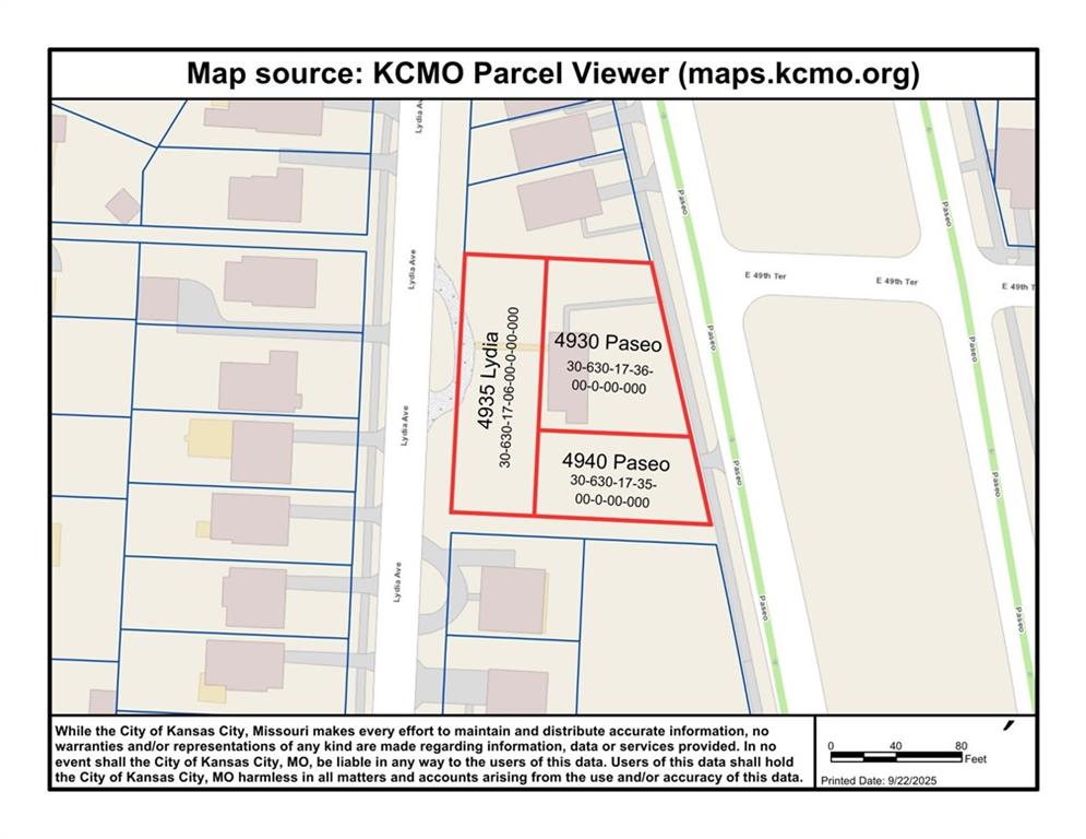 Investor/Developer Special – 3 Parcels Near UMKC & Hospitals! Rare chance to secure nearly ½ acre with dual frontage on Paseo & Lydia. Includes 4930 Paseo Blvd (house previously 3 bed/1 bath, now down to the studs and ready for full renovation), 4935 Lydia Ave (vacant residential lot), and 4940 Paseo Blvd (vacant residential lot). Minutes from UMKC, Rockhurst, the city’s medical district, Midtown, and the Plaza. Perfect opportunity for redevelopment, infill construction, or a long-term land hold in a high-demand location. Property sold as-is/in present condition; seller will make no repairs. Disclosure: Seller is a licensed MO real estate agent. Lot size and tax info per county records; deemed reliable but not guaranteed. Buyer/agent to verify all information including utilities, zoning, and condition.