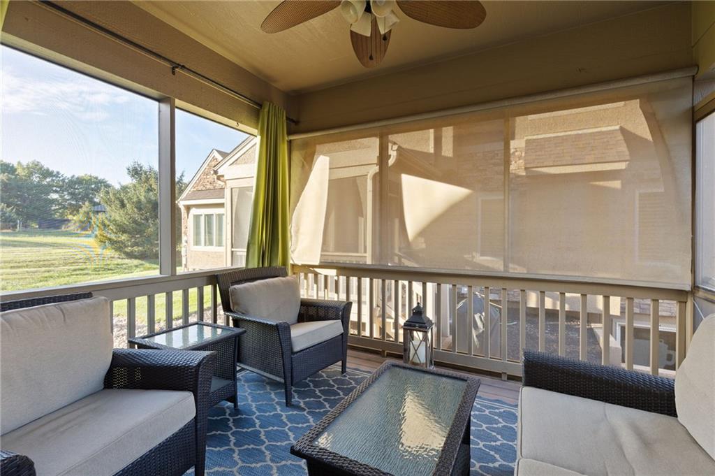 Maintenance provided living at its best in this stunning Tom French–designed Winston plan townhome, perfectly located in the highly sought-after Villages of Quail Park. This gorgeous neighborhood is known for its lush, manicured landscaping and inviting curb appeal, and this home is tucked onto a quiet cul-de-sac with a shared driveway, creating both privacy and charm. The ledge stone and stucco exterior welcome you to a covered front porch and storm door entry. Inside, gleaming hardwood floors set the tone, flowing past a stately half bath with granite vanity and into the spacious great room. Centered by a stone fireplace flanked by large windows, the great room creates a warm and inviting space that seamlessly connects to the breakfast area. From here, step through French doors to the screened-in deck with access to a flagstone patio and small yard—an ideal spot for morning coffee or evening relaxation. The kitchen offers a granite breakfast peninsula, stainless steel appliances, and two access points to the laundry room, one leading directly to from the kitchen and the other from the main entry hallway. Upstairs, a versatile loft/office area provides additional living space, perfect for working from home or relaxing with a book. The owner’s suite is a true retreat with plush carpet, ceiling fan, and French doors that open to a spa-like en suite bath featuring a jetted tub with tile surround, separate shower with ledge, double granite vanity, and large walk-in closet. Two additional bedrooms, each with ceiling fans, blinds, and soft carpet, share a hall bath with tile flooring, an extended granite vanity, and shower. The daylight, unfinished lower level is stubbed for a bath and offers excellent storage now with the opportunity to expand living space in the future. Blue Valley Schools add to the value of this thoughtfully designed home in a community where comfort, convenience, and timeless style come together.