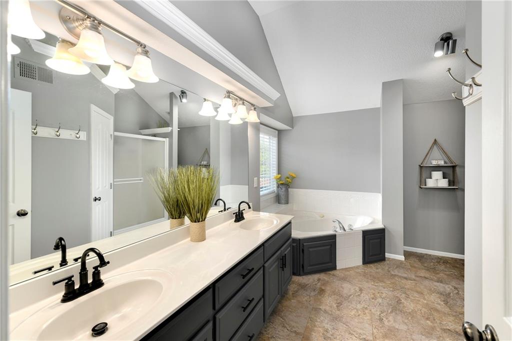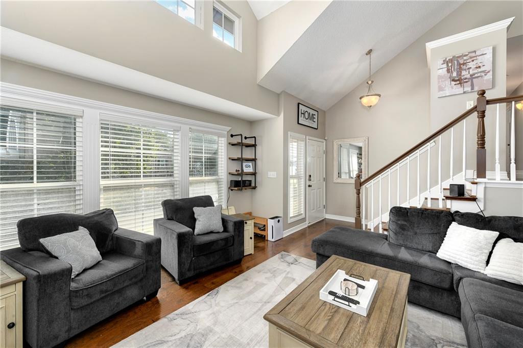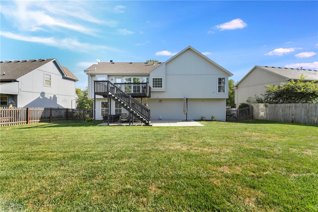 Plenty of time to move in before your first holiday feast lights up this much-sought-after Carriage Point gem, nestled on a peaceful cul-de-sac. 4 true bedrooms & 3 full baths! This beautiful front-to-back floor plan is expansive with its vaulted ceilings and staggered levels that allow natural light to beam in and kiss every inch of this updated home with fresh vitamin D. Also, a gas log fireplace in the living room adds instant warmth. Newer hand-scraped hardwood floors gleam throughout, tying in with the newer paint, sleek modern lighting, updated plumbing fixtures, and newer vinyl windows with included window treatments that elevate every room. The kitchen steals the show next, with bright white quartz countertops, backsplash, stainless steel appliances (all staying put), and a pantry loaded with pull-out shelving. That glass-top range? Effortless cleanup for your home's chef. Adjacent, the dining room flows onto the painted deck, w/ stairs descending to the patio. Spacious primary is a private escape, boasting a custom closet system in XL walk-in and an en-suite bath w/ double vanity, tiled floors, separate shower, and jetted tub—perfect for sinking into spa-like bliss on those unwind days. Laundry's right on the main level for everyday ease, sharing space with three more true bedrooms. The true fourth bedroom is an XL standout, doubling as prime flex space—a home office, playroom, or man cave—with direct walkout to the covered patio (sheltered by the painted deck overhead), complete with a custom bed-sized swing and string lights for outdoor ambiance & magic. From there, the lush, green yard unfolds, wrapped in a privacy fence for seclusion. The deep three-car garage stores vehicles and extra gear, while the sub-basement offers bonus square footage for storage, a future workout haven, or more flex uses. And location? Prime proximity to Lee's Summit schools, swift highway ramps, and a bounty of shopping & dining hotspots.