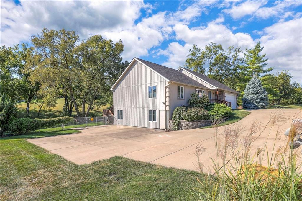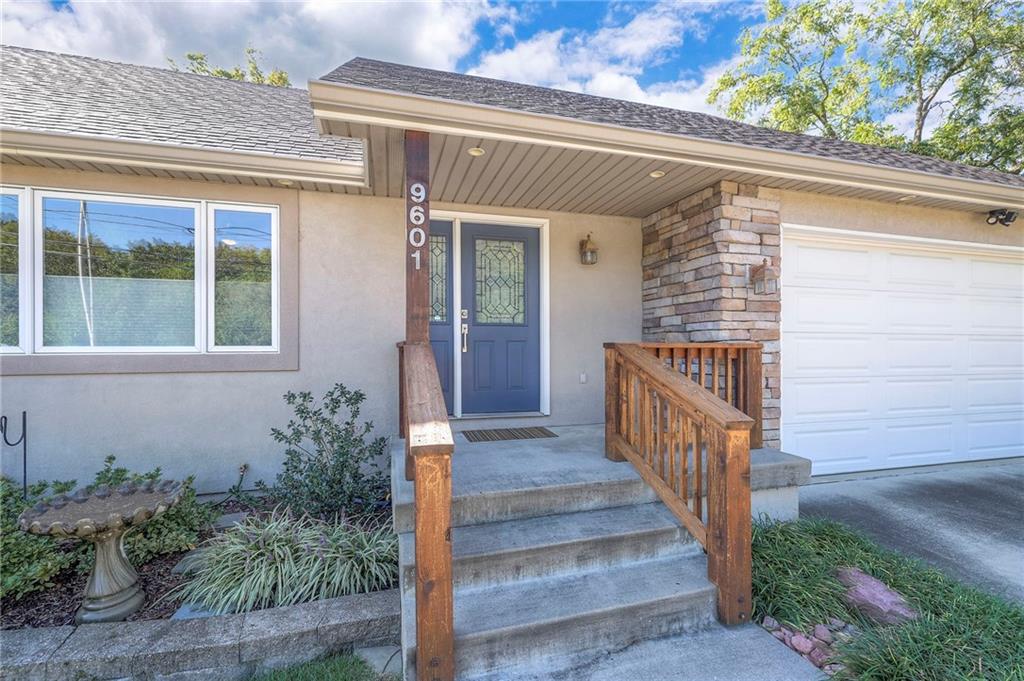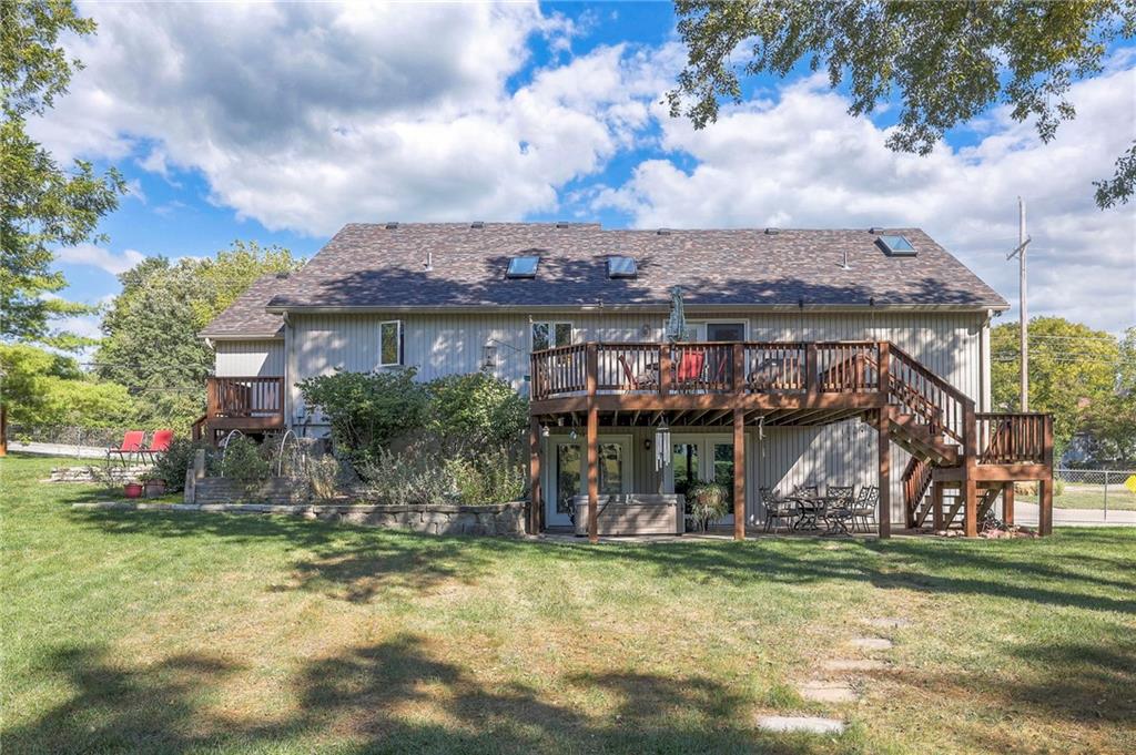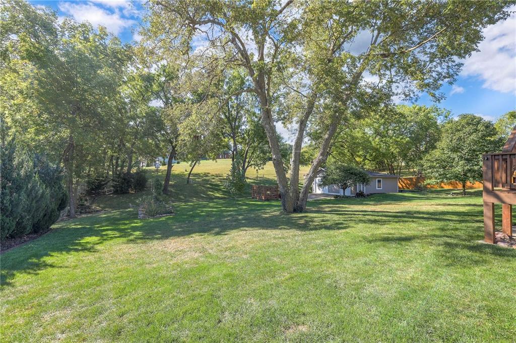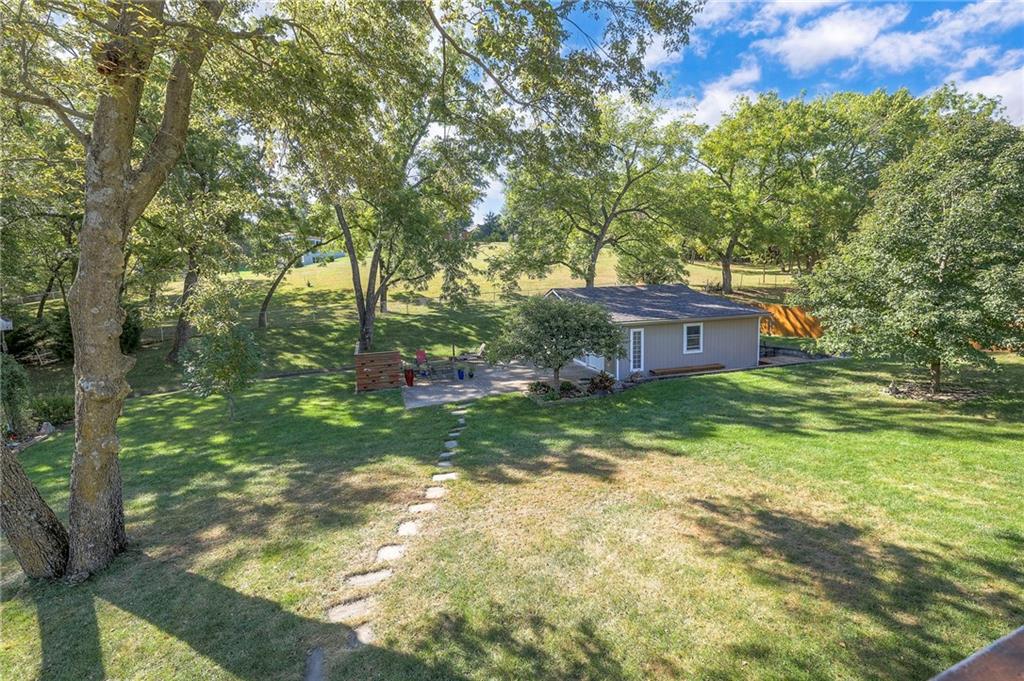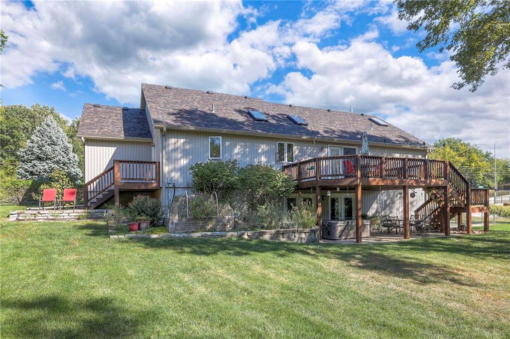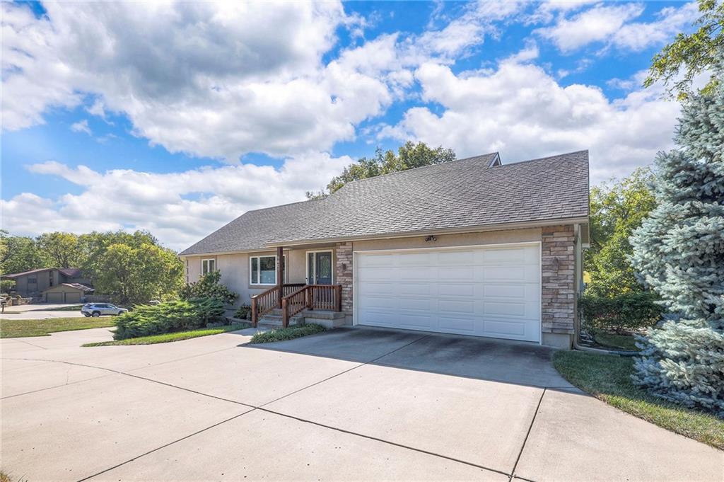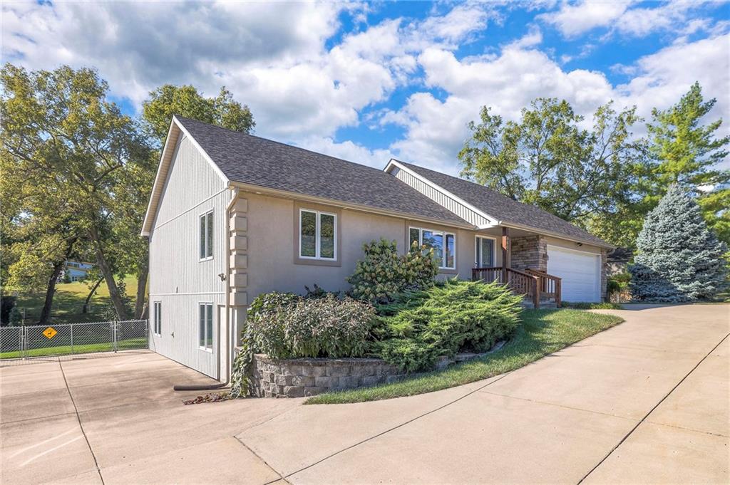 Welcome to this beautifully updated 3-bedroom, 2.5-bath reverse 1.5-story home sitting on a scenic .65-acre lot! Step inside a light-filled living room featuring vaulted ceilings, porcelain tile floors, a ceiling fan, and an abundance of natural light. The updated kitchen is a true highlight, featuring granite countertops, stainless steel appliances, a stylish backsplash, and a spacious eat-in dining area—perfect for daily living or entertaining. The primary suite is your personal retreat, offering a large walk-in closet and a fully updated en-suite bathroom designed for relaxation. Convenient main-level living flows seamlessly into the finished walkout lower level, complete with a large rec room, two additional bedrooms, and a full bath. French doors open to a patio with a hot tub overlooking the private, fenced backyard with a firepit—ideal for cozy fall evenings. Outside, you’ll find even more to love. The backyard features a versatile finished outbuilding, for use as a bonus entertaining space, gym, or office, and half for all your storage or yard equipment needs. Mature trees and a park-like setting provide the perfect blend of privacy and outdoor enjoyment. With recent updates, including newer windows, this home is truly move-in ready. Add in its unbeatable location—just minutes from shops, restaurants, highway access, and KCI airport—and you’ve got a home that checks every box.