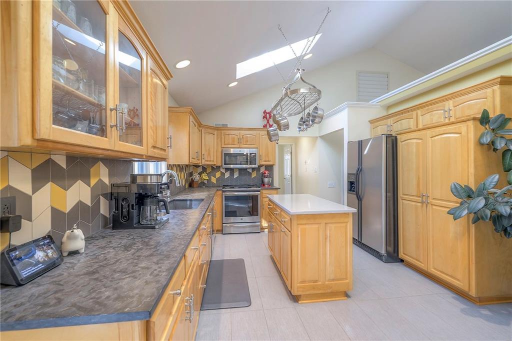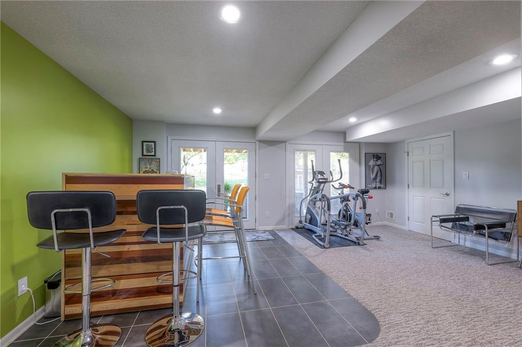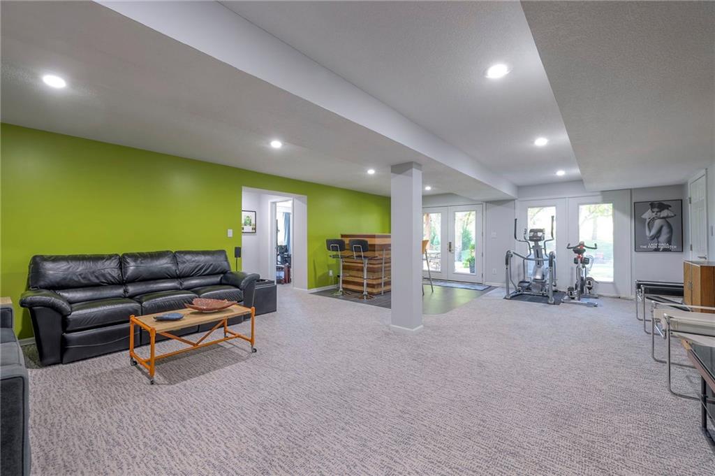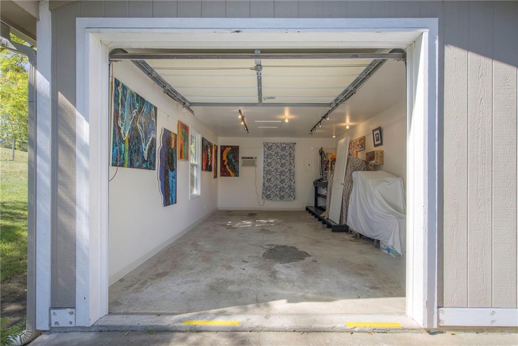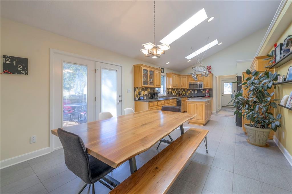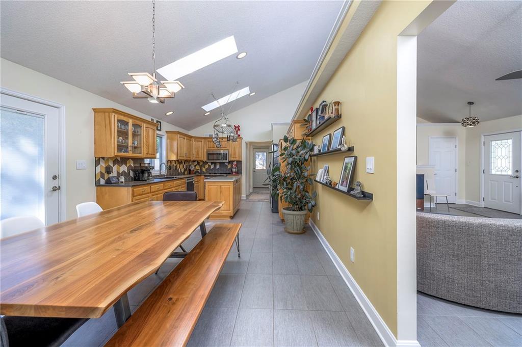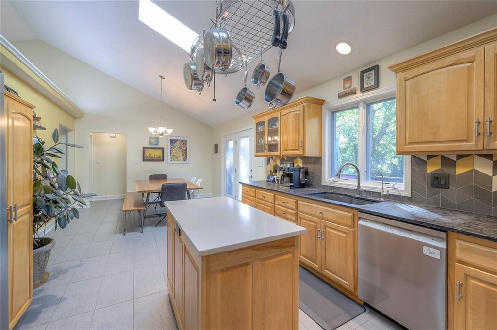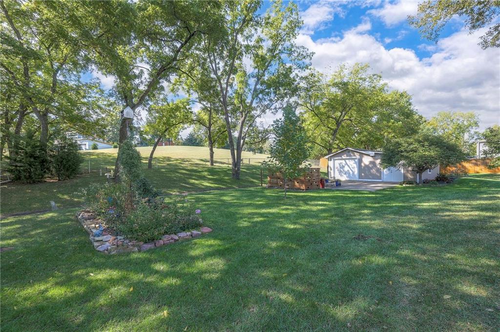 Welcome to this beautifully updated 3-bedroom, 2.5-bath reverse 1.5-story home sitting on a scenic .65-acre lot! Step inside a light-filled living room featuring vaulted ceilings, porcelain tile floors, a ceiling fan, and an abundance of natural light. The updated kitchen is a true highlight, featuring granite countertops, stainless steel appliances, a stylish backsplash, and a spacious eat-in dining area—perfect for daily living or entertaining. The primary suite is your personal retreat, offering a large walk-in closet and a fully updated en-suite bathroom designed for relaxation. Convenient main-level living flows seamlessly into the finished walkout lower level, complete with a large rec room, two additional bedrooms, and a full bath. French doors open to a patio with a hot tub overlooking the private, fenced backyard with a firepit—ideal for cozy fall evenings. Outside, you’ll find even more to love. The backyard features a versatile finished outbuilding, for use as a bonus entertaining space, gym, or office, and half for all your storage or yard equipment needs. Mature trees and a park-like setting provide the perfect blend of privacy and outdoor enjoyment. With recent updates, including newer windows, this home is truly move-in ready. Add in its unbeatable location—just minutes from shops, restaurants, highway access, and KCI airport—and you’ve got a home that checks every box.