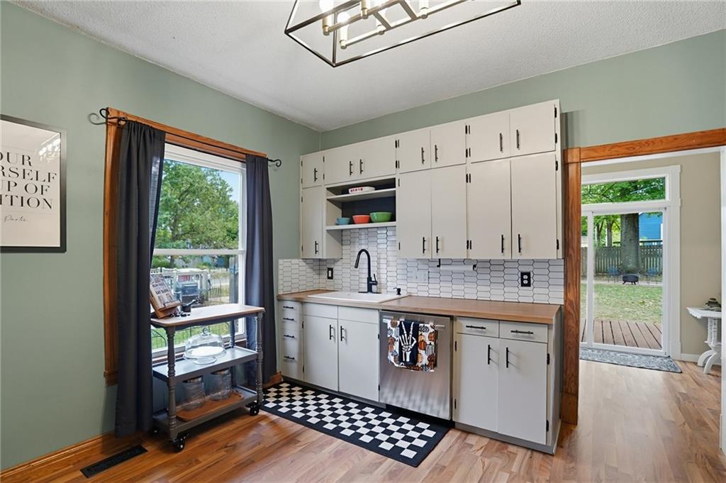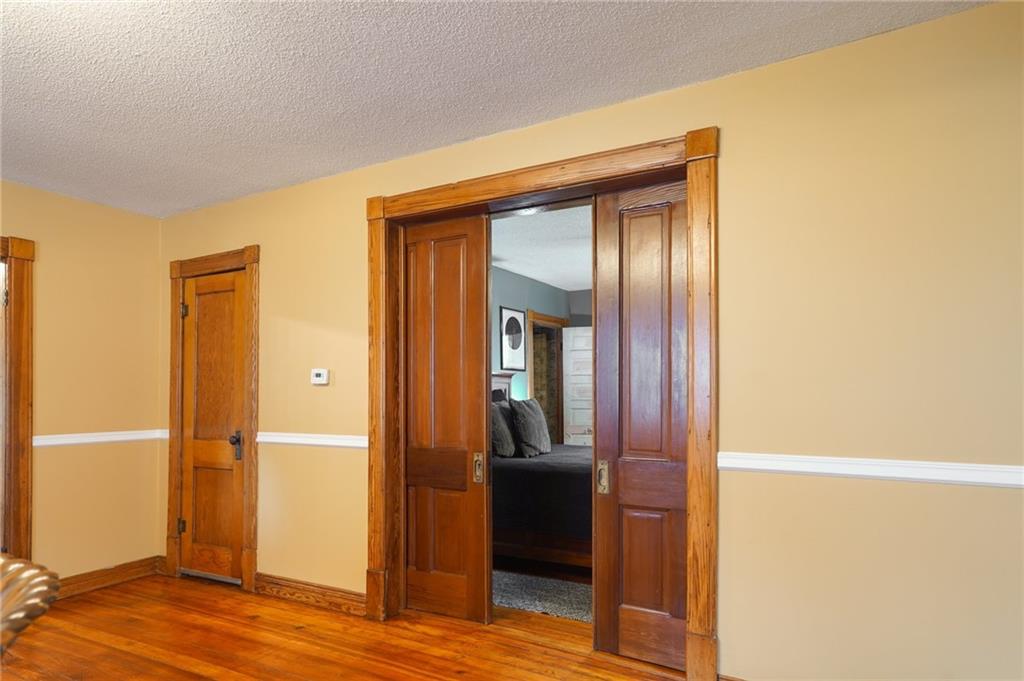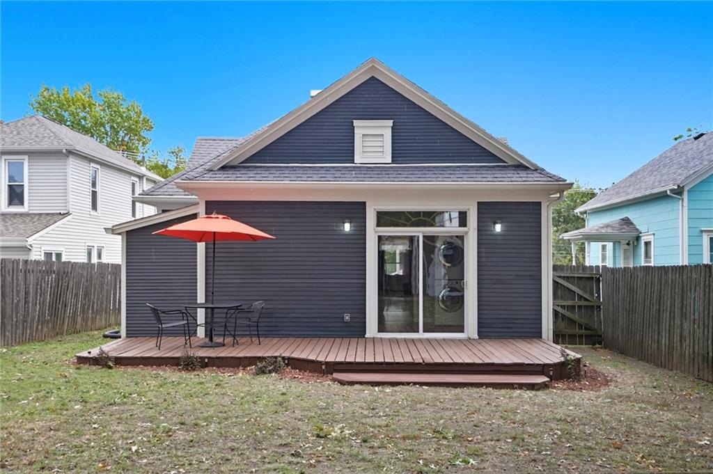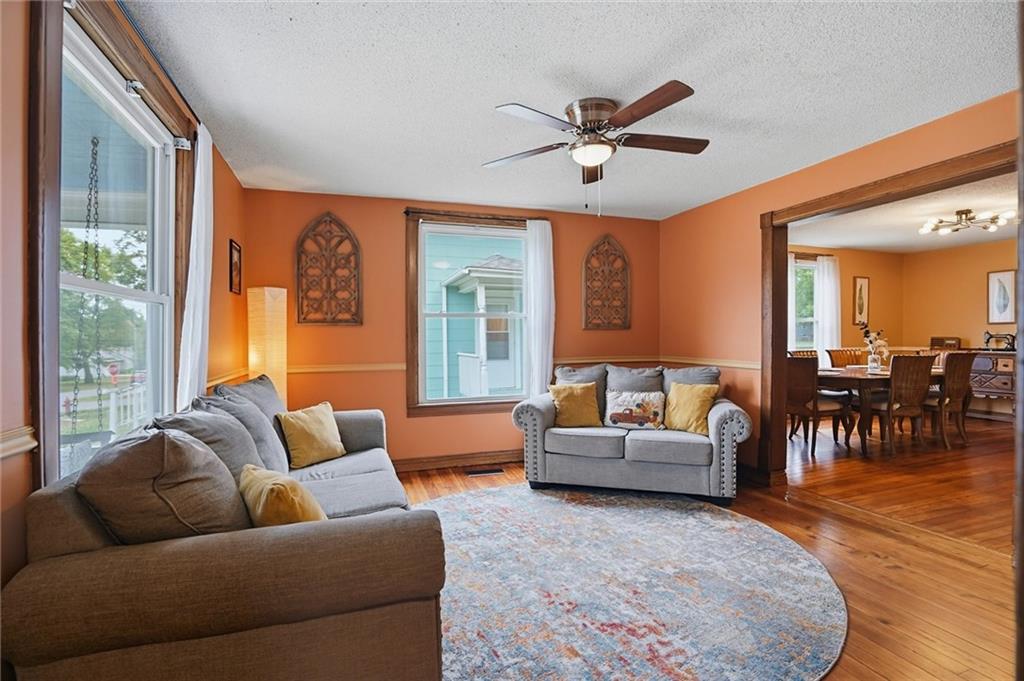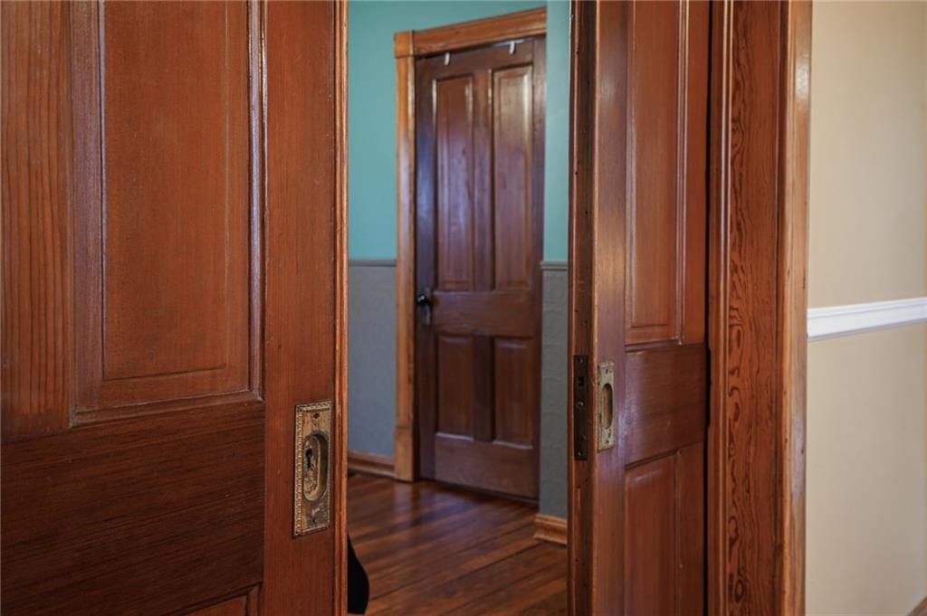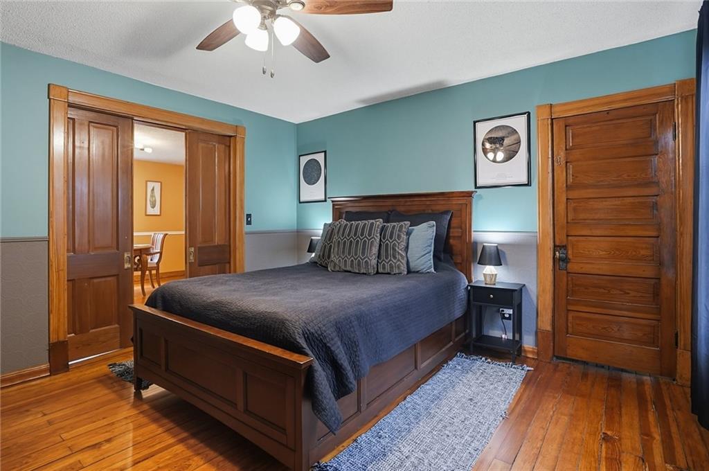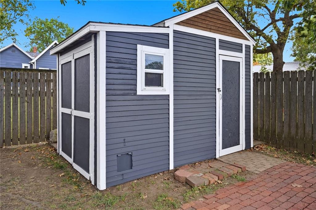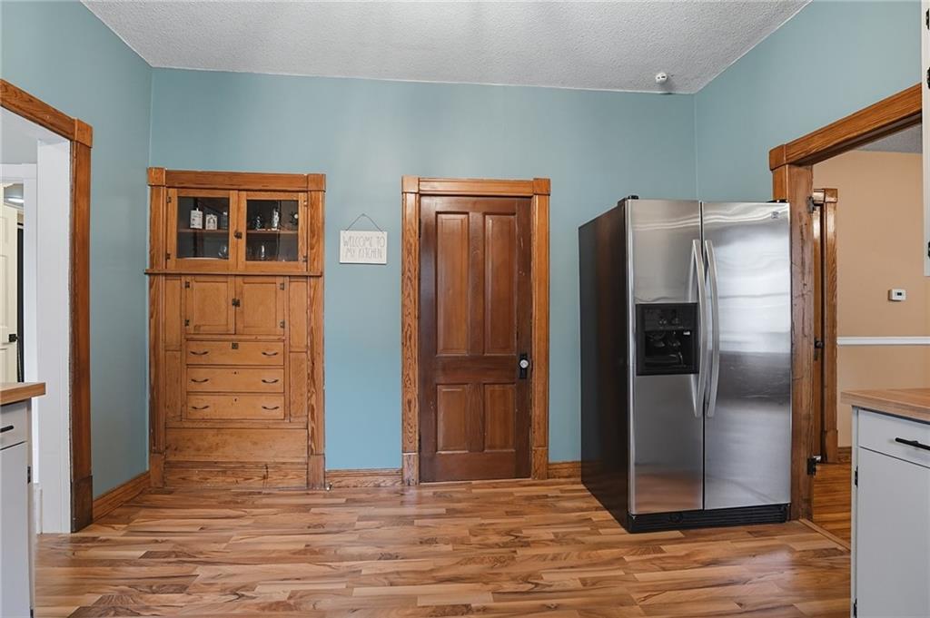 WHAT A COMPLETE CHARMER! This 2 bed, 1 bath home is filled with warmth, character, beauty, a perfect blend of new and old and truly great spaces. The dreamy front porch greets you and asks you to sit a spell. The moment you walk into the entry you feel invited into this lovely home. The room sizes are spacious and effortlessly flow into each other. The dining room boasts of the beautiful hardwood floors and very spacious area that allows a large table for many gatherings. Plenty of storage in the kitchen with a stunning built in wood cabinet we believe to be the age of the home. The vast and large attic could be used for substantial storage or you could renovate it and have an incredible area and added square footage. The Cellar allows for more storage and safety from Kansas weather. Bonus room off of primary could be used for an office, workout room or library, etc. Gorgeous original hardwood floors refinished in 2023 in the living room, dining room and primary bedroom. Primary bedroom has a walk in closet and the most elegant sliding original pocket doors. New laminate flooring in kitchen and laundry room, New carpet in 2nd bedroom, repainted the front porch all in 2025. And additionally, just re-stained the back deck and painted both sheds. Fenced backyard with two sheds. Two off street parking spaces out front. This is your opportunity to live in charming Baldwin with its wonderful downtown area with restaurants, ice cream shop and a coffee shops, and the beloved Maple Leaf Festival. I cannot say enough about this truly special home accept you should not hesitate to schedule your showing now.