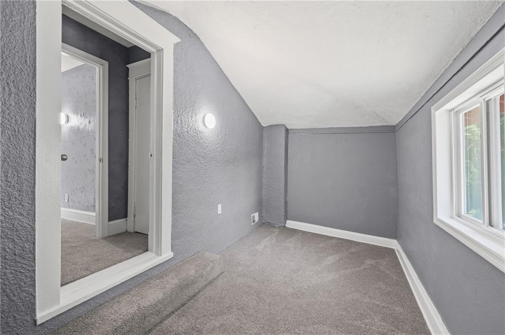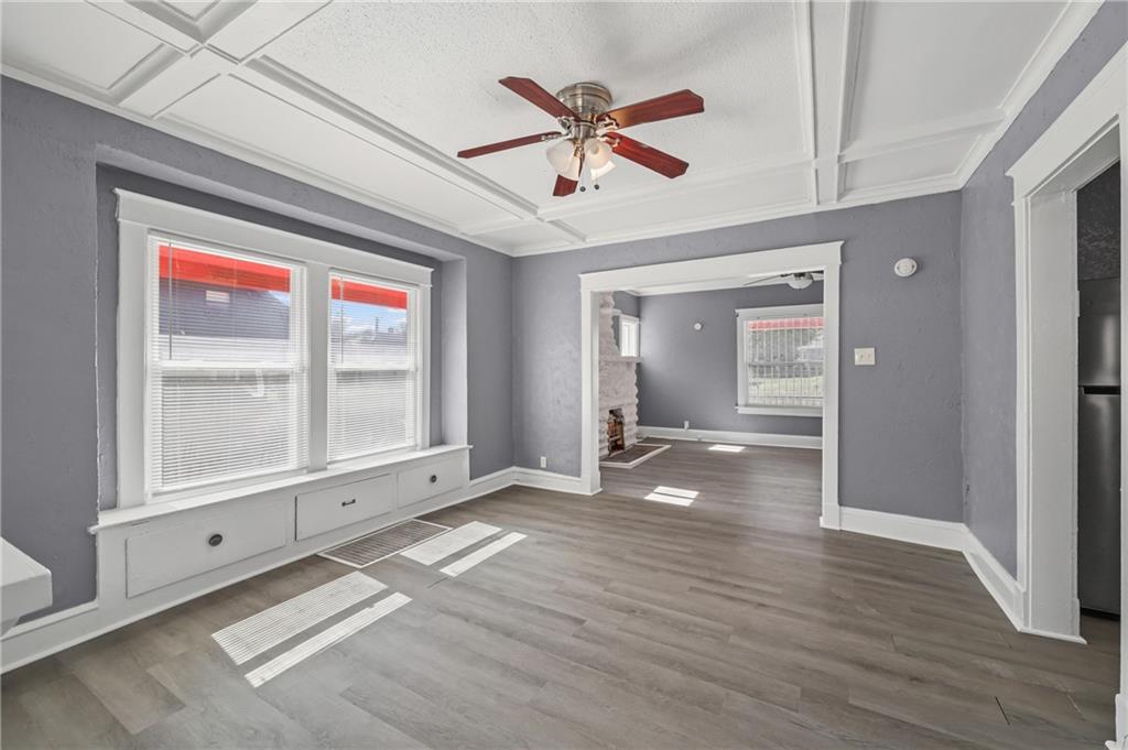 Discover the perfect blend of classic charm and modern convenience in this delightful 2-story home, located at 3427 Agnes Avenue in Kansas City. This property offers a welcoming atmosphere with its vibrant red exterior, complemented by a covered front porch featuring distinctive stone pillars. The home provides ample space for both relaxation and entertainment, with a functional and inviting layout. Upon entering, you are greeted by a spacious open-concept living and dining area, distinguished by elegant coffered ceilings and a decorative painted brick fireplace that serves as a beautiful focal point. The interior is freshly painted in a neutral gray with crisp white trim, creating a bright and airy feel throughout. Large windows allow for an abundance of natural light, enhancing the sense of space. The main living areas feature attractive and durable laminate flooring, providing a seamless flow from room to room. Thoughtful built-in cabinetry and a cozy window seat add to the home's character and provide practical storage solutions. The galley-style kitchen is well-equipped with dark wood cabinetry, offering plenty of storage, and is paired with stylish granite-look countertops. The kitchen comes complete with a refrigerator, stove, and microwave, making it ready for all your culinary endeavors. A convenient pantry provides additional storage space for your kitchen essentials. This home includes multiple comfortable bedrooms, each featuring ceiling fans and ample natural light. The updated bathroom is clean and modern, with a white tub and shower combination and contemporary fixtures. For outdoor enjoyment, a wooden deck at the rear of the house provides a private space for grilling and relaxing. The fenced backyard also includes two sheds for extra storage. With its combination of traditional architectural details and recent updates, this home is move-in ready and waiting for you to make it your own.