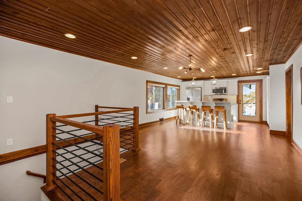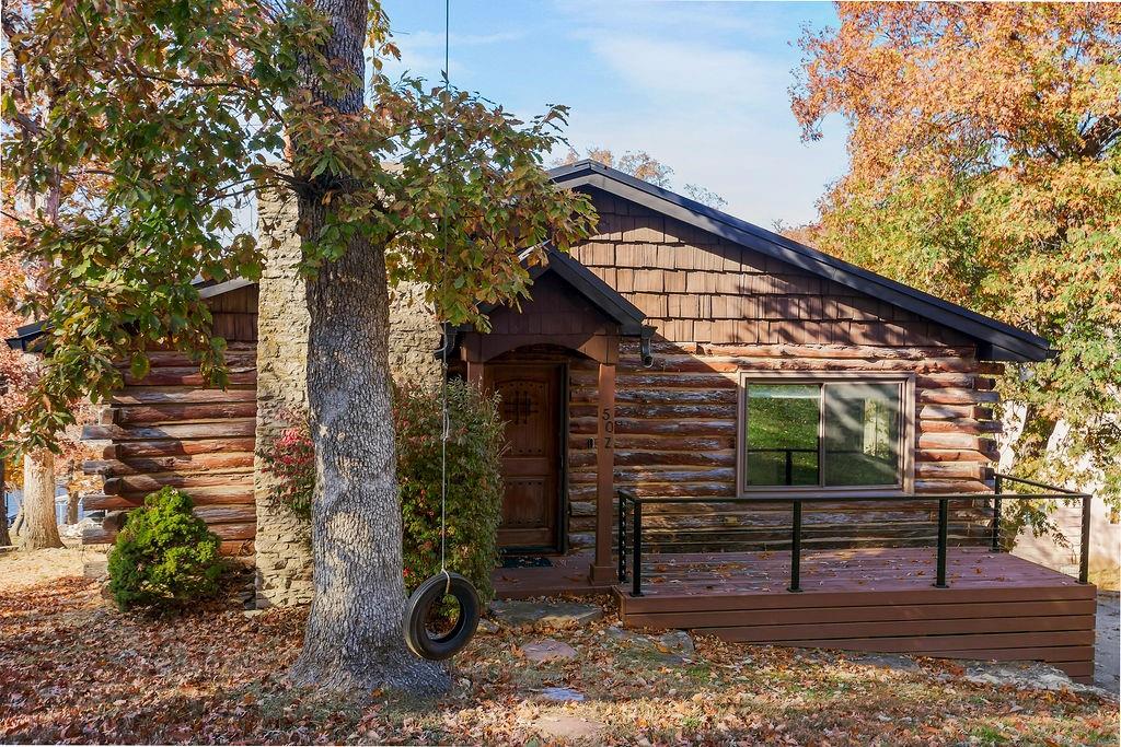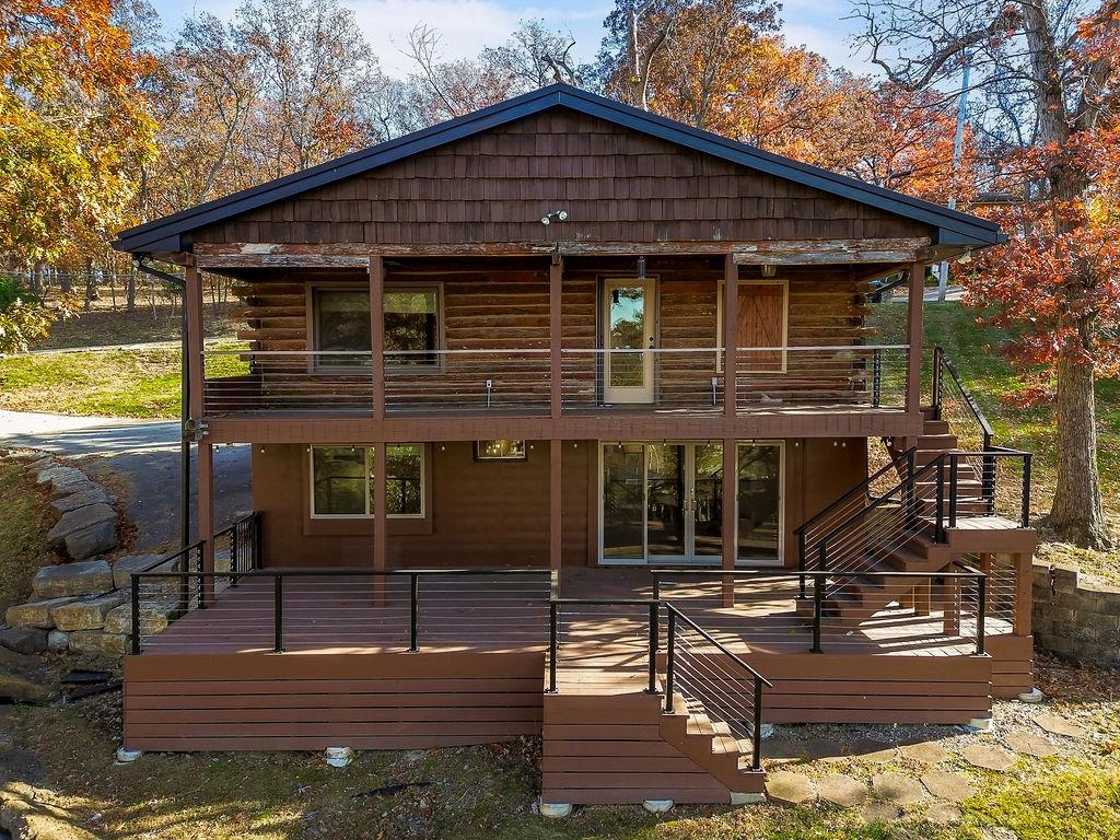 Lake Lotawana's one of a kind, coveted log cabin! Perched on three lots, nearly a 1/2 acre of gorgeous lakefront property with an expertly utilized interior space. The main level greets you with gorgeous, recently refinished 5" wide hardwood floors, a cozy living room that opens to an updated kitchen with quartz countertops and an island with seating. The open, wide staircase leads you to the lower level walk-out that has been completely remodeled in 2022. A modern gas fireplace warms the room along with a bar nook with a mini-fridge and bottle storage. Two spacious bedrooms with egress windows and a full bath are also located in the lower area. The finishes have been constructed with very high quality material and workmanship. The exterior is PERFECT for entertaining. Gorgeous sunset views from the two brand new decks, a firepit area and a private dock with an electric, covered shore station lift. A calm cove, just off the main channel, safer for playing in the water and less dock wear and tear. Improvements galore! Since 2021, HVAC, tankless water, windows, metal roof, flooring, fireplace, electric panel, sliding doors, and decks. Lifetime warrantied foundation piers installed for a strong, sturdy structure. Plenty of space to spread out and not hit elbows with your neighbors and parking for up to 7-8 vehicles, a rarity in Lake Lotawana. This sale includes three lake front lots, the possibilities are endless to build a garage or another home. Lake Lotawana is a sought-after location with Kansas City's only waterfront restaurant accessible by boat. Take your golf cart just a few miles away to the community park, tennis courts, restaurants, and coffee shop. There is always something to do in this community; fishing tournaments, ski, sailing , kayak and community events, and so much more.
