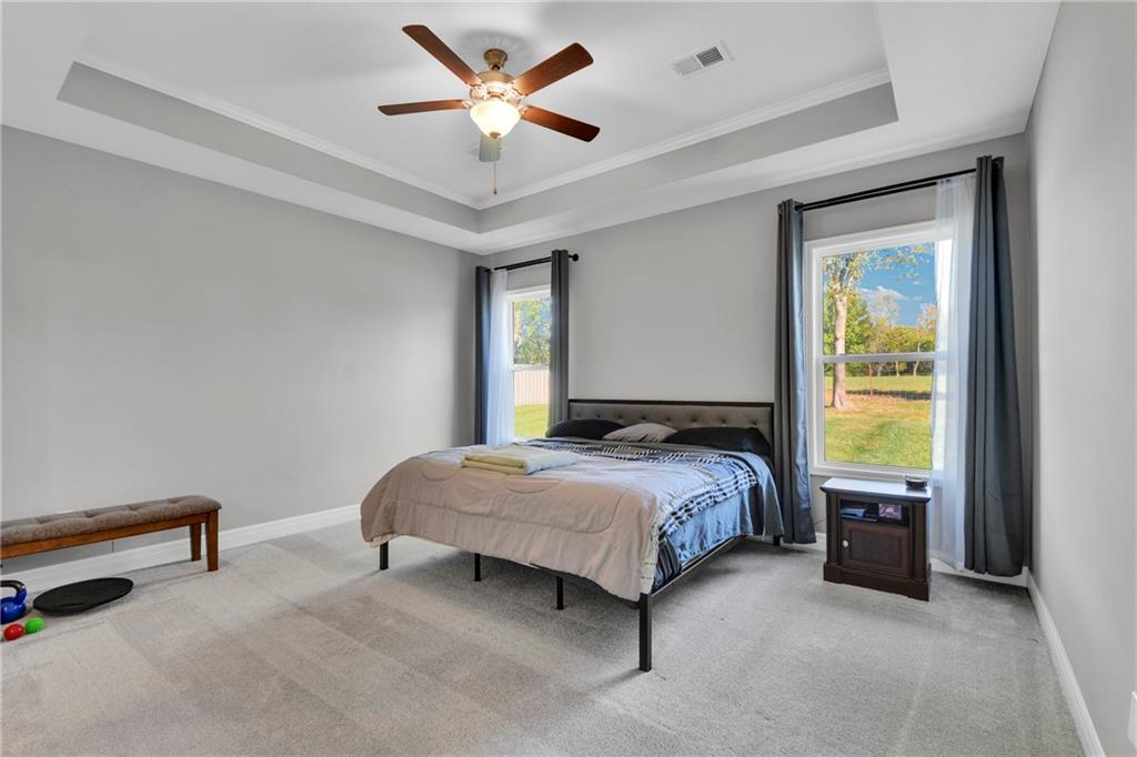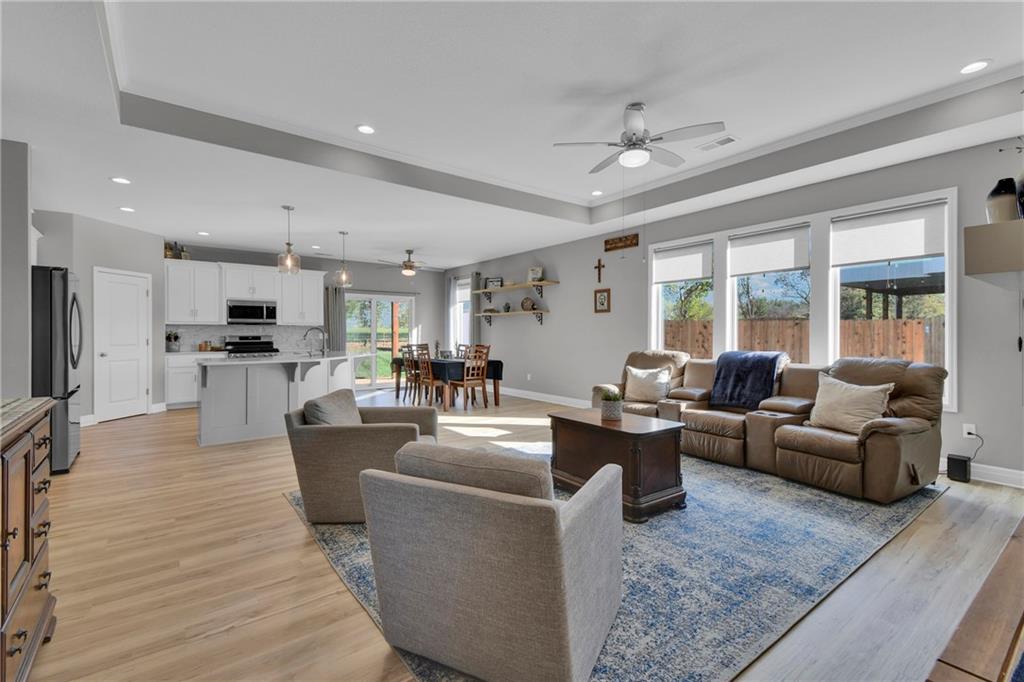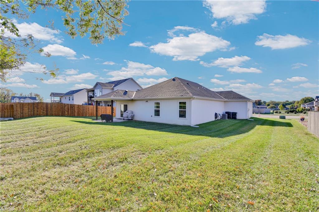 Nearly “New” built home, ready for you. Welcome to Aster, a beautiful ranch-style home by Authentic Homes KC! This thoughtfully designed home is packed with luxurious upgrades and stylish touches throughout. Gorgeous & upgraded flooring offers both elegance and durability. This open-concept layout features a chef-inspired kitchen with quartz countertops, stainless steel appliances including a gas stove, custom cabinetry, a walk-in pantry, ample counter space, and a large center island that flows seamlessly into the spacious living room—perfect for entertaining. The master suite boasts a large bedroom, a spa-inspired bathroom with double vanity, custom tiled shower with bench seat, and a generous walk-in closet conveniently connected to the laundry room. Step outside to enjoy the expansive covered patio, large back patio, and beautifully manicured yard—ideal for relaxing or hosting gatherings. This home is move-in ready and easy to show—don’t miss your chance to make it yours!