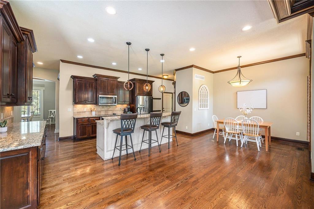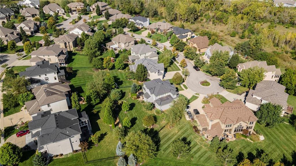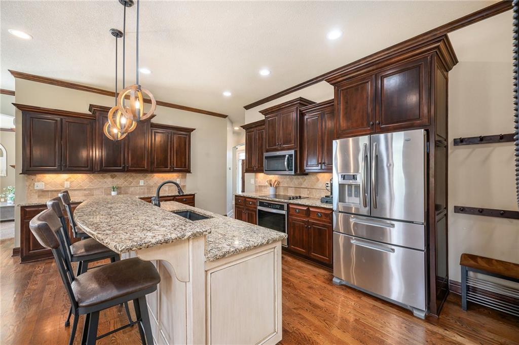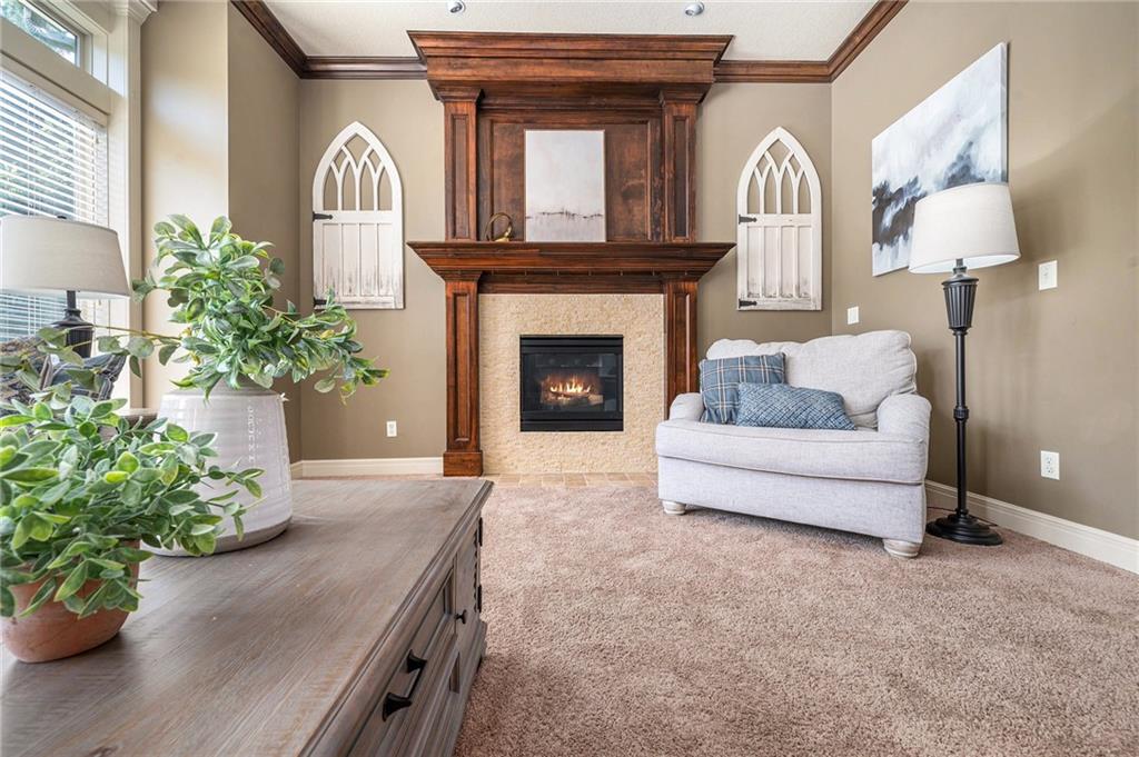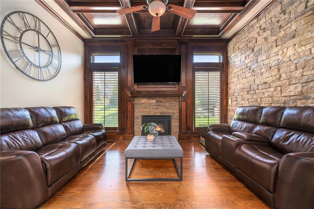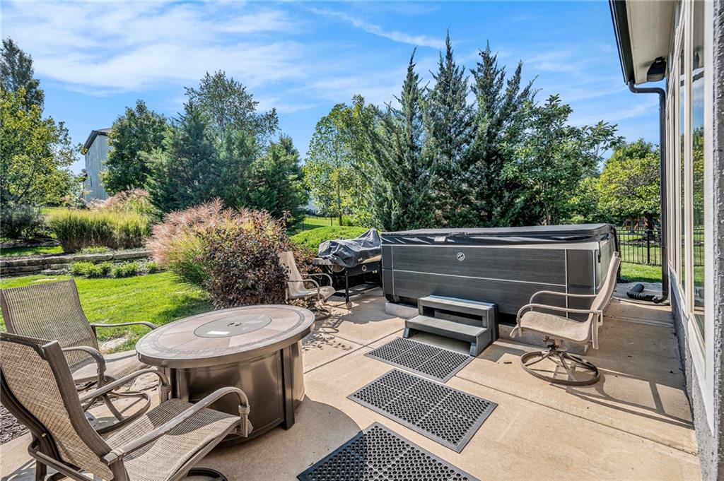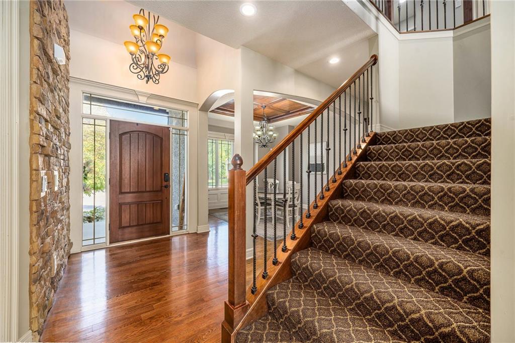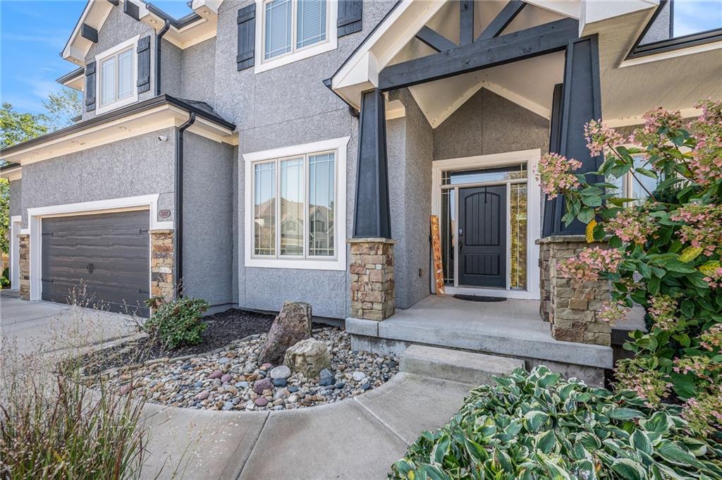 Eyes instantly draw up to the rich tone of the beamed ceilings in the formal dining room and hearth. A fireplace anchors both the living room and hearth adding a cozy touch to both entertaining spaces. Delightful details like a stacked stone accent wall, plantation shutters, double staircase, laundry at bedroom level and basement, a main floor office & two primary bedroom options make this residence both stylish and functional. The open concept great room that encompasses both the kitchen and hearth is anchored by a large kitchen island with seating–perfect for a quick morning breakfast. Newer stainless steel appliances include the oven, stove and dishwasher. Upstairs bedrooms all have walk-in closets including the oversized primary closet that would allow for a center island, maximizing organization, and also connects to the laundry room. The finished basement has a bedroom, full bath and is perfect for hosting watch parties–you won’t miss a minute of the action with food and drink stocked at the wet bar! Landscaping runs along the curve of the back patio elevating it into a picturesque and private setting for entertaining or unwinding in the hot tub. Well-maintained with a new roof, exterior paint, and hot water heater replacement within the last five years. The Coffee Creek Crossing community enjoys the prestigious Blue Valley School District as well as dining, shops and recreation at the new Blu Hawk development. Neighborhood amenities include a zero entry swimming pool, play ground, volleyball court and walking trails.
