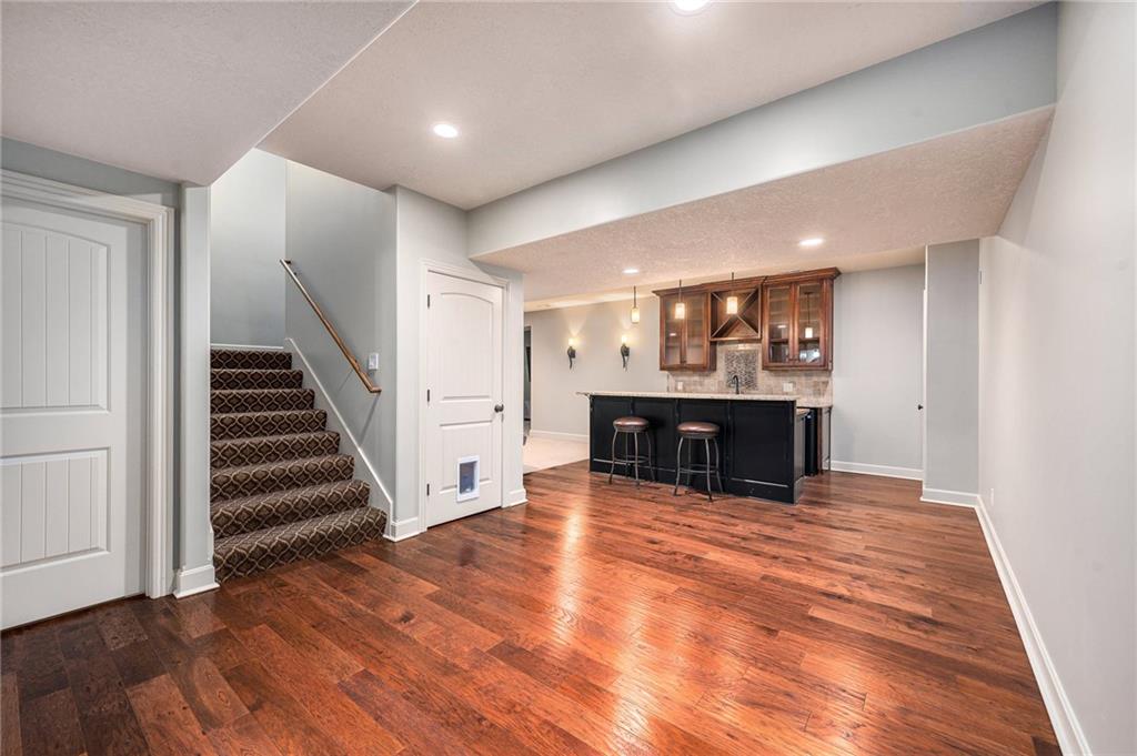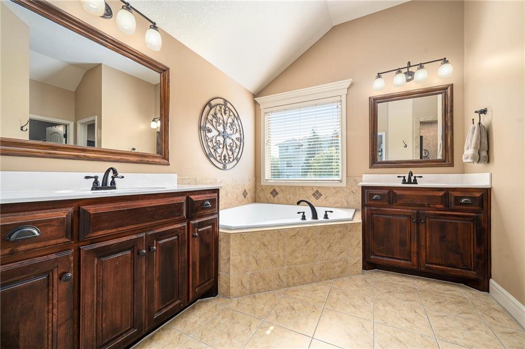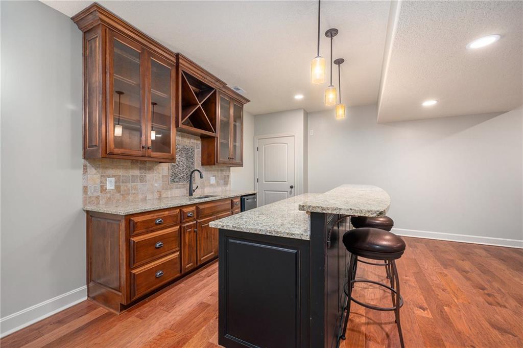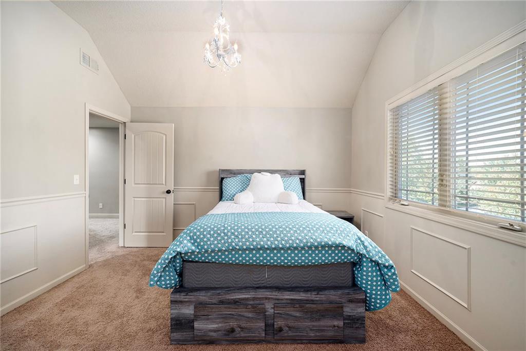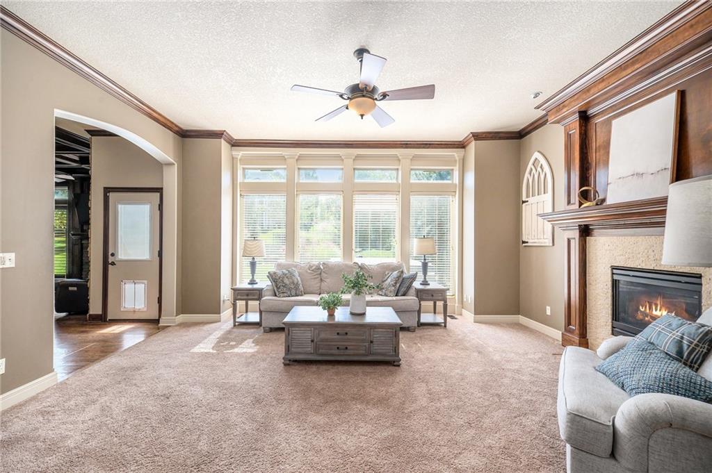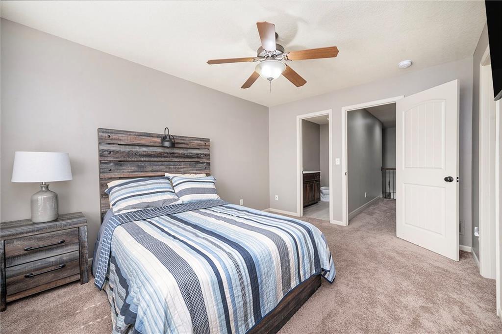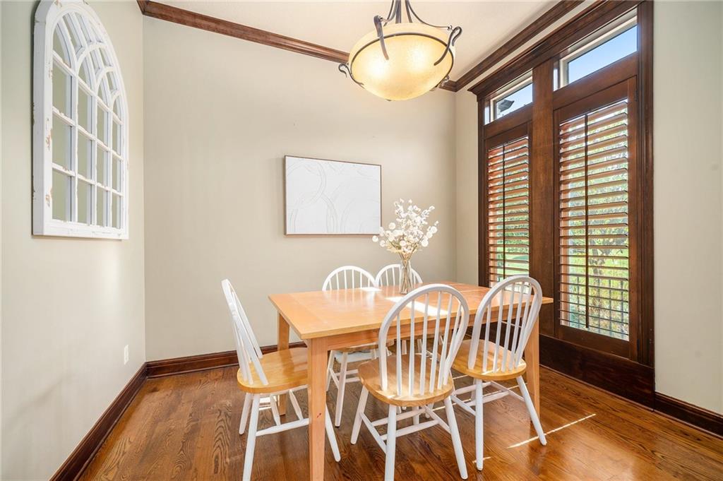 Eyes instantly draw up to the rich tone of the beamed ceilings in the formal dining room and hearth. A fireplace anchors both the living room and hearth adding a cozy touch to both entertaining spaces. Delightful details like a stacked stone accent wall, plantation shutters, double staircase, laundry at bedroom level and basement, a main floor office & two primary bedroom options make this residence both stylish and functional. The open concept great room that encompasses both the kitchen and hearth is anchored by a large kitchen island with seating–perfect for a quick morning breakfast. Newer stainless steel appliances include the oven, stove and dishwasher. Upstairs bedrooms all have walk-in closets including the oversized primary closet that would allow for a center island, maximizing organization, and also connects to the laundry room. The finished basement has a bedroom, full bath and is perfect for hosting watch parties–you won’t miss a minute of the action with food and drink stocked at the wet bar! Landscaping runs along the curve of the back patio elevating it into a picturesque and private setting for entertaining or unwinding in the hot tub. Well-maintained with a new roof, exterior paint, and hot water heater replacement within the last five years. The Coffee Creek Crossing community enjoys the prestigious Blue Valley School District as well as dining, shops and recreation at the new Blu Hawk development. Neighborhood amenities include a zero entry swimming pool, play ground, volleyball court and walking trails.