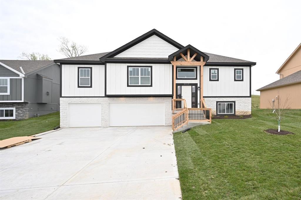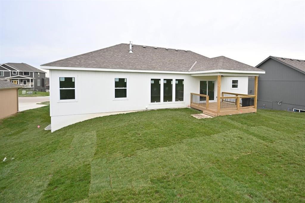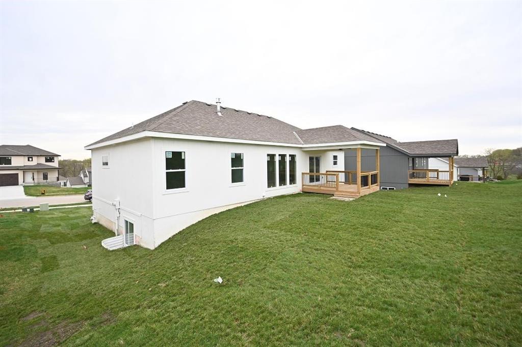 This beautiful home features a range of custom amenities that enhance both functionality and style. The heart of the home features a stunning kitchen with custom white cabinets, a spacious pantry, and an inviting island topped with gorgeous granite. Modern stainless steel appliances add both style and utility, while the covered deck, complete with a ceiling fan, provides a perfect outdoor stocked lake for fishing. The great room boasts LVP flooring throughout, complemented by a beautiful stone fireplace creating a cozy and elegant focal point. The laundry room is efficiently designed with tile flooring and custom cabinetry to keep things organized. The home includes two bedrooms with carpet, each featuring tray ceilings and ceiling fans for added comfort. The guest bathroom is stylishly designed with tile flooring and a tub, ensuring convenience for visitors. The master suite is a true retreat, featuring plush carpet and a spacious walk-in closet. The master bathroom boasts custom cabinets, a luxurious jetted tub, double vanity sinks with sleek black faucets, and a huge tile shower for a spa-like experience. The lower level includes an additional bedroom with carpet and a ceiling fan, along with a full bathroom featuring tile floors and a tub. The home is equipped with ample recessed (can) lighting throughout, showcasing its thoughtful design. Additional highlights include an oversized three-car garage and eye-catching stone accents on the front of the home, making it not only functional but also visually appealing. This property combines elegance, comfort, and practicality, making it a fantastic place to call home! PHOTOS ARE SIMULATED MORE TO COME, LAKE IS STOCKED.