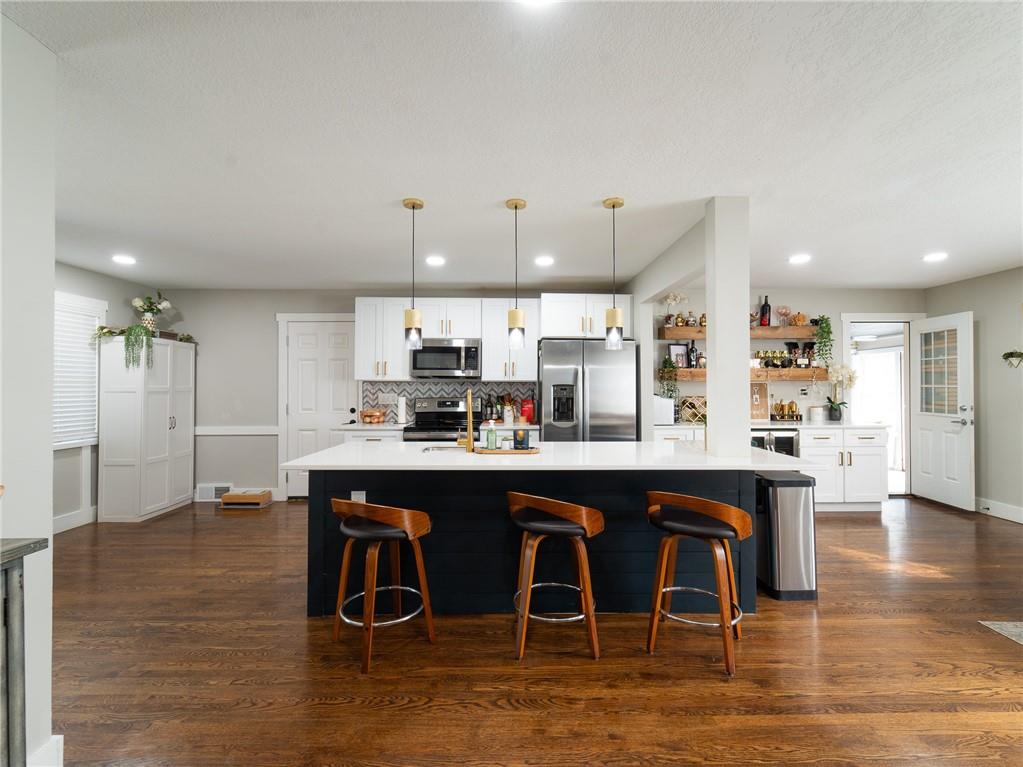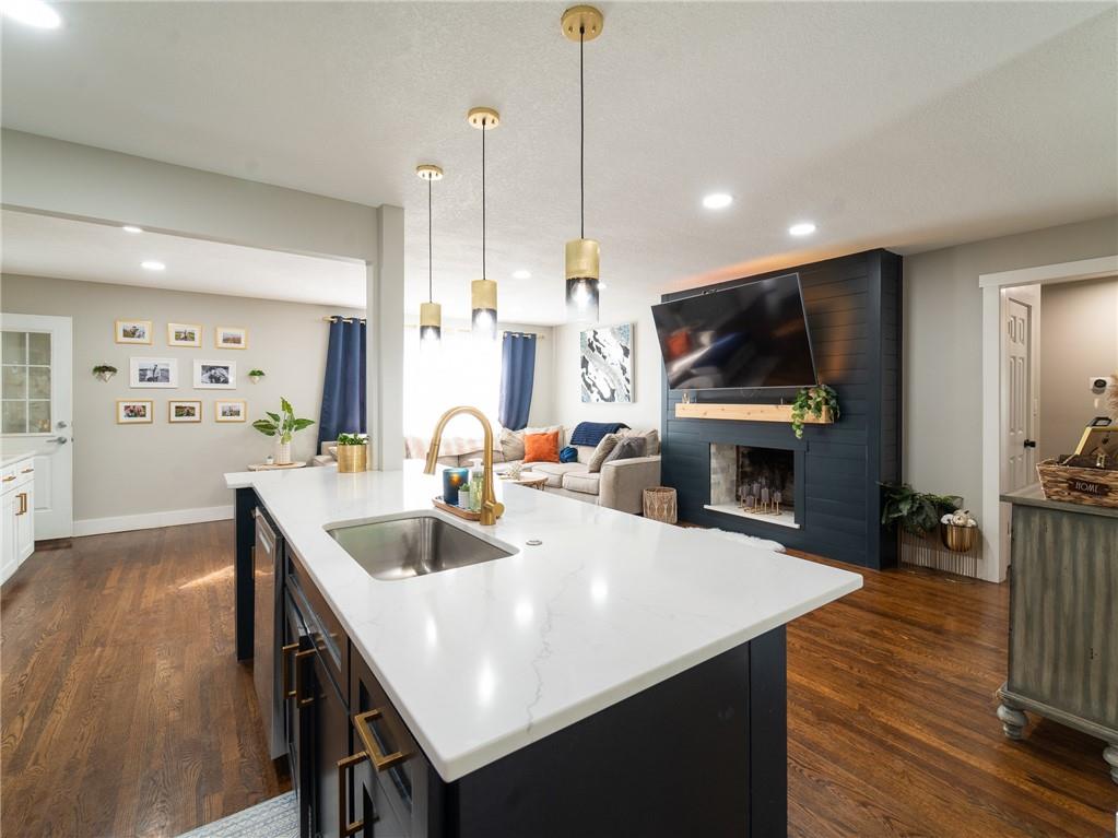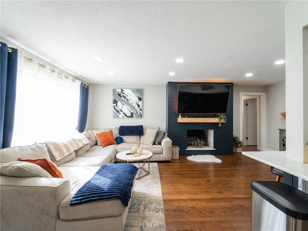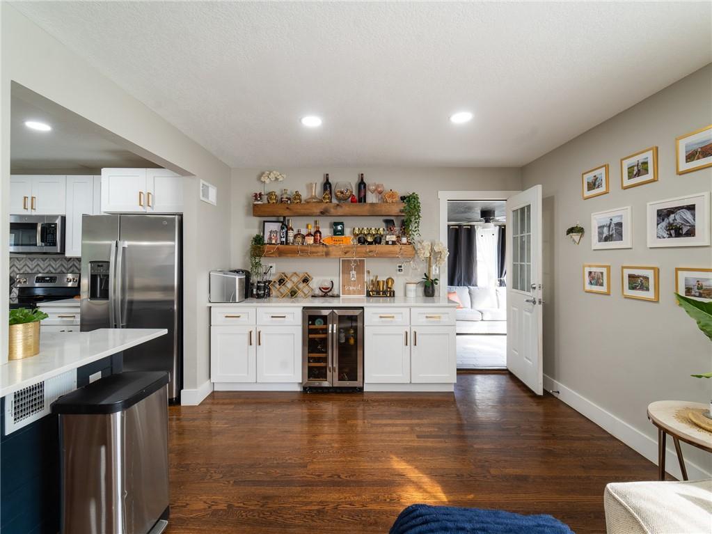 QUICK POSSESSION AVAILABLE! Completely remodeled in 2023, this 3-bedroom, 2-bath home combines modern design with comfortable living. The open layout features hardwood floors, a custom fireplace, and a beautiful kitchen with new cabinets, upgraded appliances, and a wet bar with a wine cooler, beverage fridge, and extra storage. The remodeled sunroom offers a bright, inviting space for entertaining or relaxing. Outside, a large textured concrete patio with bistro lights and a privacy fence sets the scene for evenings spent with friends or quiet mornings with coffee. The unfinished basement adds potential for expansion and value-add in the future. Protected by a newly installed security system, every detail has been carefully updated to create a home that feels fresh, stylish, and modern.