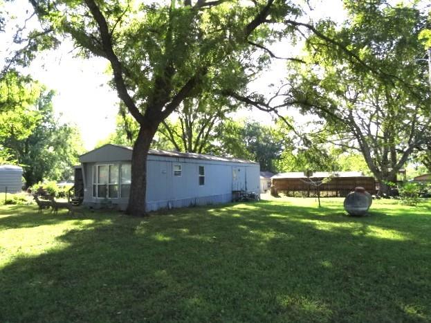 Singlewide Manufactured 2 Bedrooms, 1 Bath, a 12x16 (192 sq. ft.) room addition with 2 doors and windows was added to the 900 sq. ft. home. Carport in the yard, root cellar or tornado shelter appears to be in good condition is a bonus. Home has been well taken care of with a kitchen island, bow window with almost new mini blinds, stove and refrigerator are in clean and in good condition. Pantry also. The bathroom in the hall has been remodeled with a fiberglass walk-in shower with many grab bars. Washer and dryer are in the hall with a shelf above. 2023 HVAC System. Propane tank that runs kitchen range and the furnace is owned by the property. Electric Water heater in the master bedroom closet was installed in 2022. 100 amp Breaker box in Master Bedroom. Outside was painted in 2025, Most of inside painted in 2023. Roof in 1998. Mature Trees, Garden Spot, Lot is 130x140.