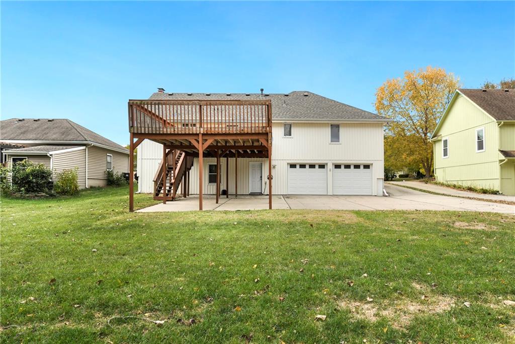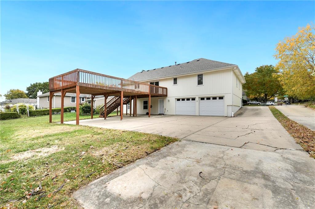 Welcome home!! Here's the perfect property in a great location in Lee's Summit you've been looking for! Raised ranch with some unique features and updates you'll love! There's plenty of space for your visitors to park with an expanded deck with 3 carports underneath and 2 car garage in back. For easy access and few steps, the front circular drive is a great addition. Upstairs, you'll find a spacious kitchen, laundry, living and dining areas with 3 bedrooms and 2 baths. Enjoy the living room fireplace for cozy, colder evenings and coffee or meals on the deck during the warm months! Downstairs, an additional bathroom, non-conforming bedroom (with fireplace), and living room provide a separate living space, complete with a walkout to the backyard with private greenspace and direct access to the spacious garage (with HVAC). Newly repainted, new flooring, added deck support and a one year old roof with transferable warranty make this raised ranch move-in ready just in time for you to move in by the holidays and make this house your home!
