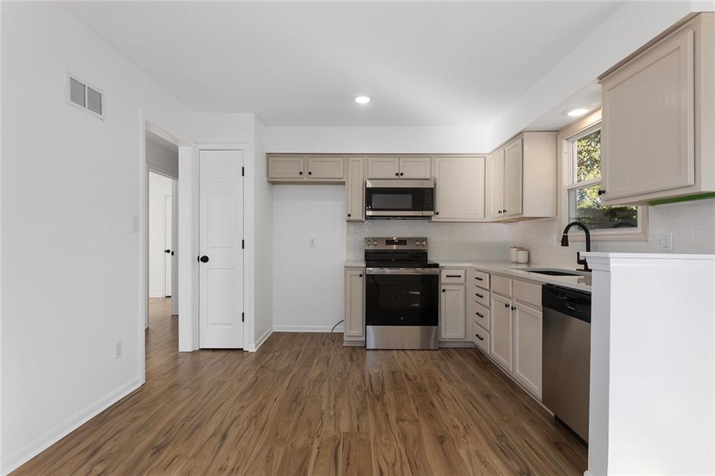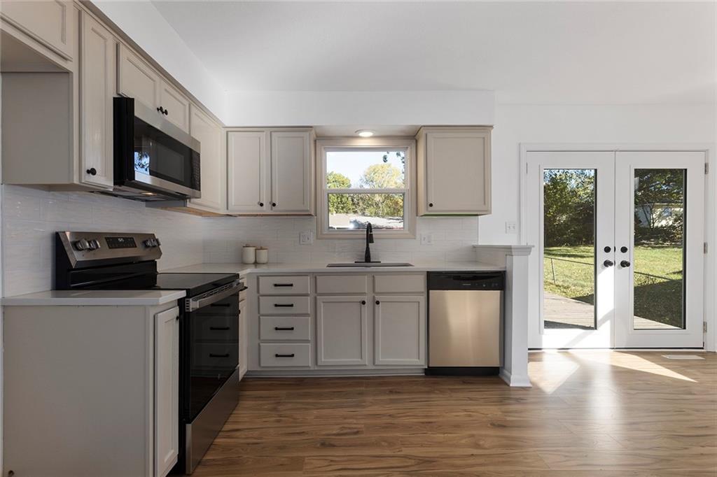 Welcome to this charming 4-bedroom, 2-bathroom home nestled in the heart of Blue Springs—just minutes from top-rated schools, scenic parks, and quick highway access! Step inside to discover a fully remodeled interior featuring a stunning updated kitchen with stainless steel appliances, modern light fixtures, fresh paint, and stylish new flooring throughout. Both bathrooms have been beautifully refreshed with contemporary finishes, giving the entire home a clean and inviting feel. Enjoy your morning coffee or evening gatherings on the oversized deck in the spacious, fenced backyard surrounded by mature trees, offering privacy and a touch of nature right at home. With its modern updates, newer AC, energy efficient windows, unbeatable location, and move-in ready condition, this home truly has it all!