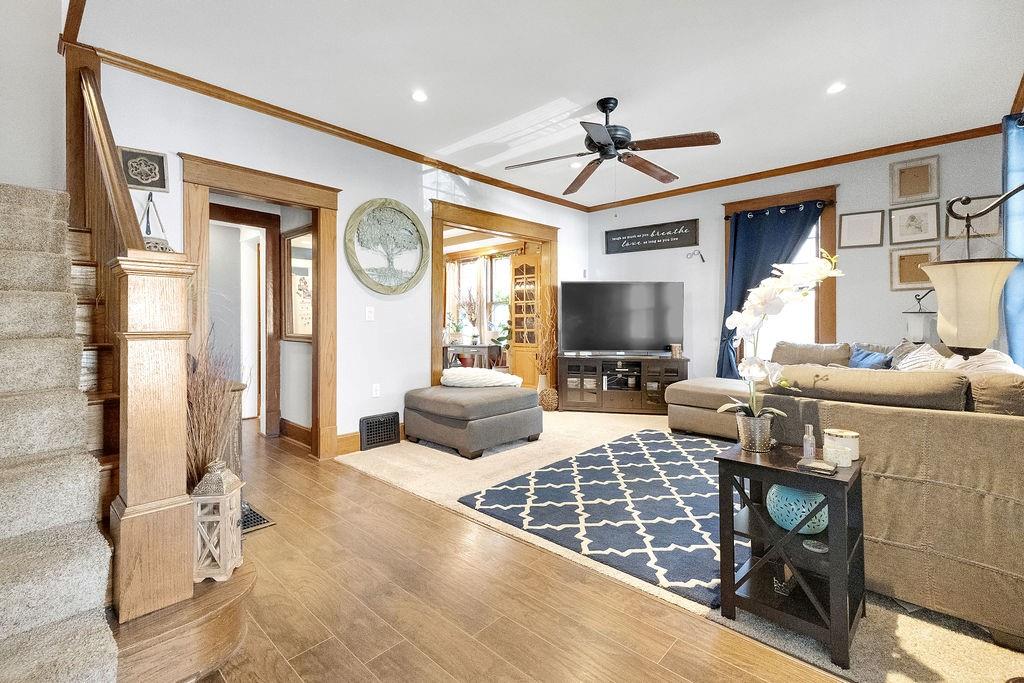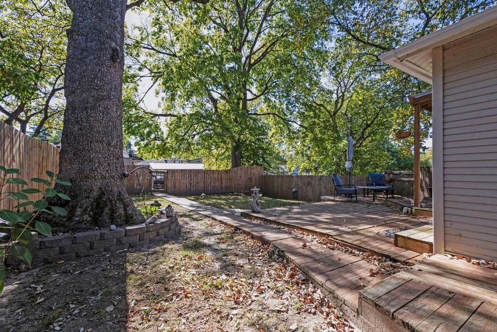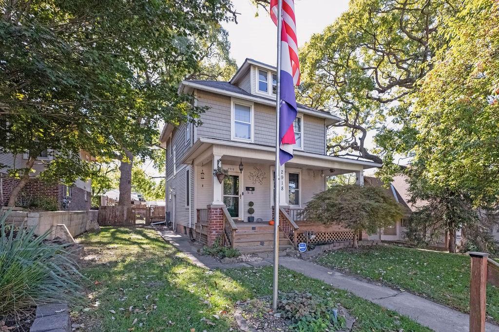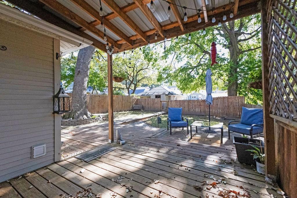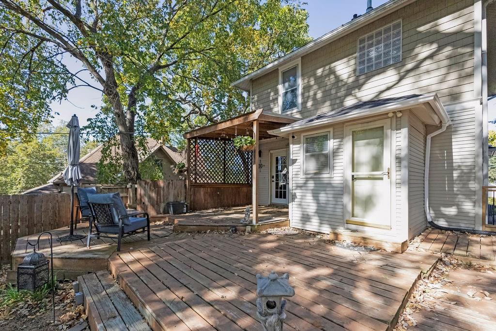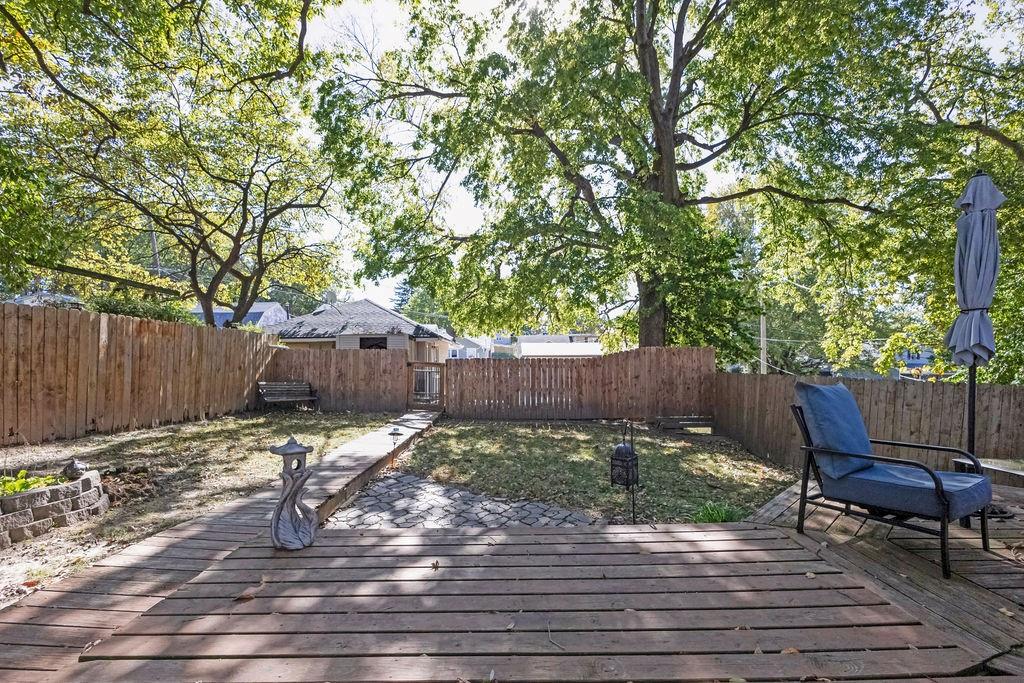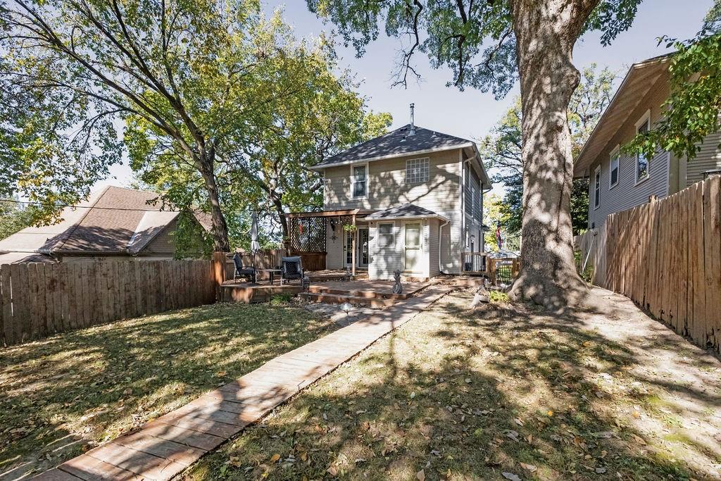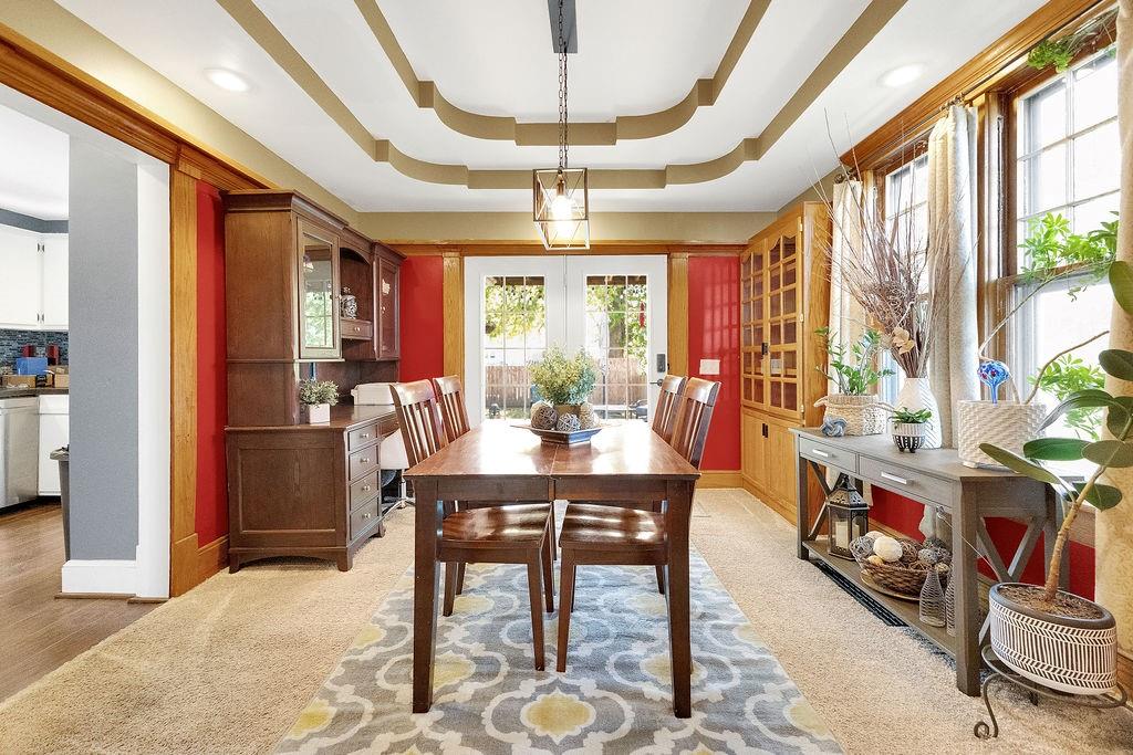 Charming two-story home blending timeless character with modern comfort! Step onto the welcoming covered front porch and into an inviting open concept main floor with rich wood trim and natural light throughout. The spacious living room flows into a formal dining room featuring a tray ceiling and French doors that open to the back deck - perfect for entertaining or relaxing outdoors. The updated kitchen includes appliances, sleek countertops, and tile backsplash, plus a convenient main floor laundry nearby. Upstairs you’ll find three comfortable bedrooms and a beautifully updated bath with a jetted tub and separate shower. A full unfinished basement with a half bath provides excellent storage or hobby space. Outside, enjoy the fenced backyard with a spacious deck area under mature shade trees. A detached one car garage and off-street parking add extra convenience. This home offers classic charm, modern touches, and great outdoor living!