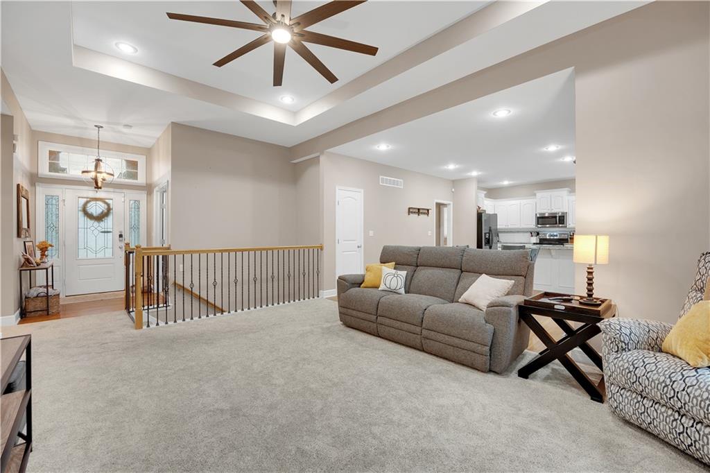 Welcome to this charming 4-bedroom ranch home nestled in the sought-after Deerfield neighborhood of Warrensburg! Main Level: Two spacious bedrooms, including a large primary suite with a beautiful bathroom and generous closet space. Lower Level: Two additional bedrooms and a spacious recreation area, featuring solid flooring throughout — perfect for entertaining or relaxing. Interior Highlights: Bright white-cabinet kitchen with granite countertops, stainless steel appliances, and solid wood flooring. Enjoy the inviting fireplace, clean carpet, and taller-than-average ceilings that add a sense of openness and charm. Exterior Features: A concrete patio, deck area, fully fenced backyard, and stone-landscaped front entry make this home move-in ready and perfect for gatherings. Don’t miss your chance to see this beautiful, well-kept home in one of Warrensburg’s most popular neighborhoods — schedule your showing today!