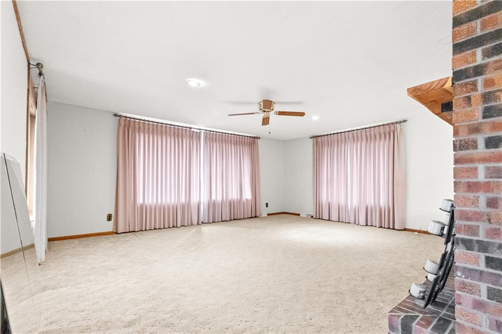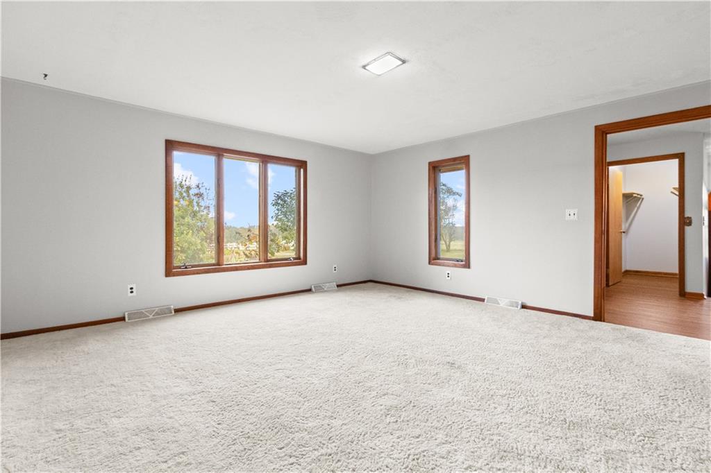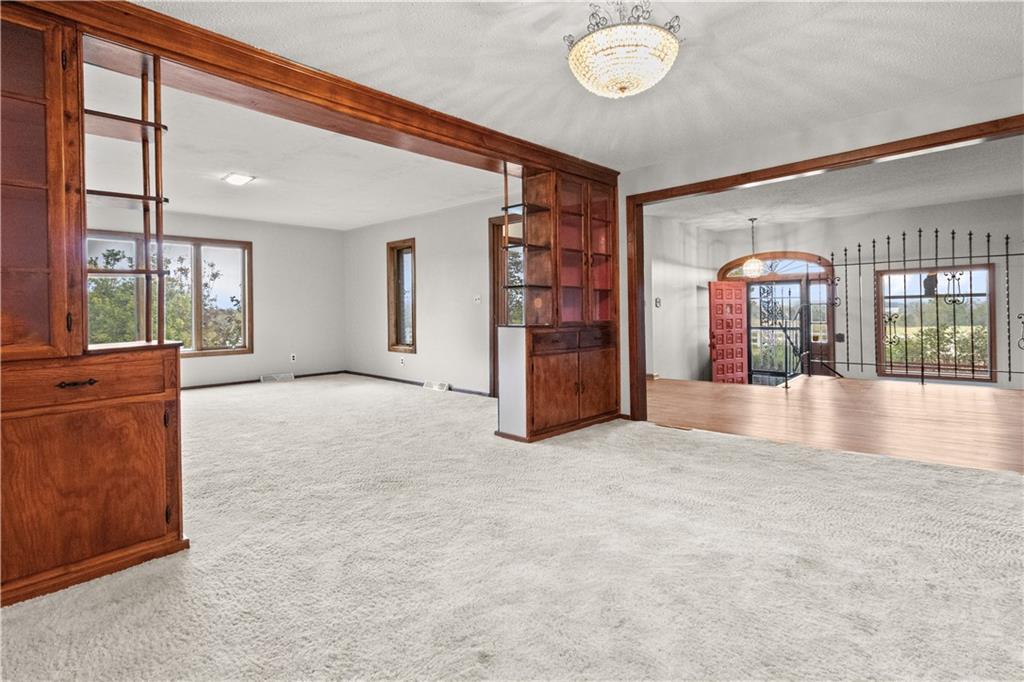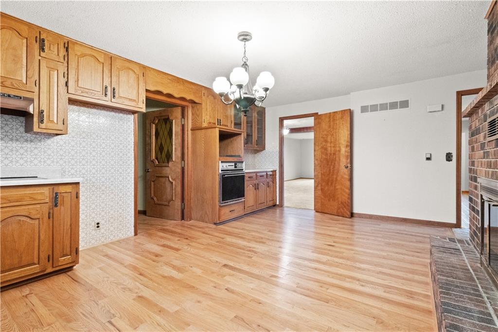 5-Acre Private Estate with Classic Farmhouse Charm! Discover the tranquility of country living with this classic two-story residence, perfectly situated on 5 expansive acres of lush, rolling green space. The home features a timeless exterior defined by rich red brick construction and a dark shingle roof, accented by charming dormer windows that hint at the generous living space inside. The sprawling acreage offers privacy, beautiful views, and endless potential for gardening, recreation, or equestrian pursuits, framed by mature trees and fencing. Traditional Interiors with Warm Wood Accents! Step inside to find voluminous, light-filled rooms with an abundance of original, character-filled details. The main level features a large living area centered around an impressive, floor-to-ceiling brick fireplace, providing a cozy focal point and architectural separation from the kitchen. This area is finished with soft, neutral carpeting and contrasting natural wood trim. The heart of the home is a wide-open kitchen and dining area boasting beautiful hardwood flooring. It is appointed with ample natural oak cabinetry and features a classic tiled backsplash, ready for the chef's touch. A built-in oven and microwave unit completes the functional layout. Upstairs offers substantial bedrooms and a unique bonus space. A standout feature is this large vaulted room, which showcases stunning exposed wood beams across the ceiling, giving it a dramatic, rustic-chic atmosphere—perfect for a studio, or recreation room. Additional bedrooms are generously sized, featuring plush carpeting, bright windows, and the potential for personalization. This property provides the perfect blend of private, expansive outdoor living and a warm, classic interior with excellent "bones" awaiting your personal upgrades and style!