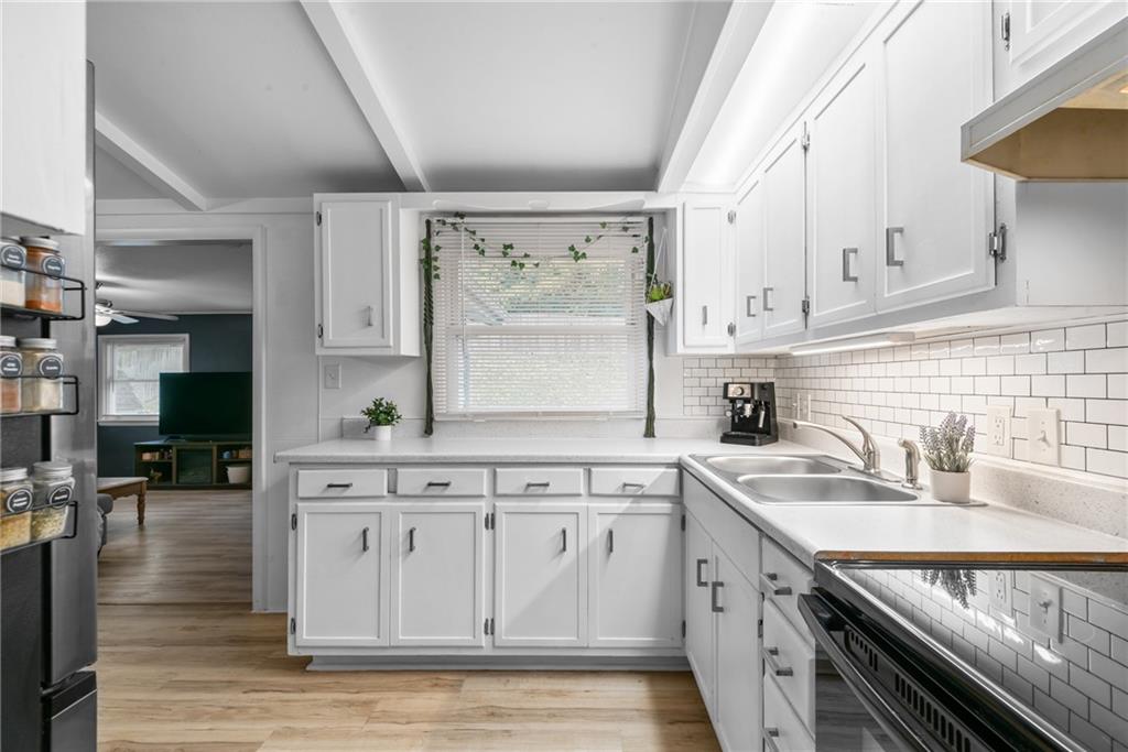 A double driveway welcomes you home to this super charming 3 bedroom, 1 bath in a prime location within top-rated North Kansas City School District. Enjoy vaulted ceilings, tons of natural light throughout, and gorgeous hardwoods paired with luxury vinyl tile. The kitchen features stainless steel appliances, ample cabinetry, and a separate pantry. You'll love having two separate living areas here. Each bedroom offers generous closet space with built-in storage, and extra closets in the hallway. A 3-year-old roof, new AC, furnace and ductwork-2023, 120 ft french drain-2024, new water lines in crawlspace-2023, landscaping-2025, fresh paint, and thoughtful upgrades throughout. Oversized one-car garage includes built-ins and plenty of space for a golf cart, ATV, etc. Step outside to a huge backyard that's fully fenced-in, new deck, large shed, and firepit. The perfect setup for cozy fall nights. Come see it!