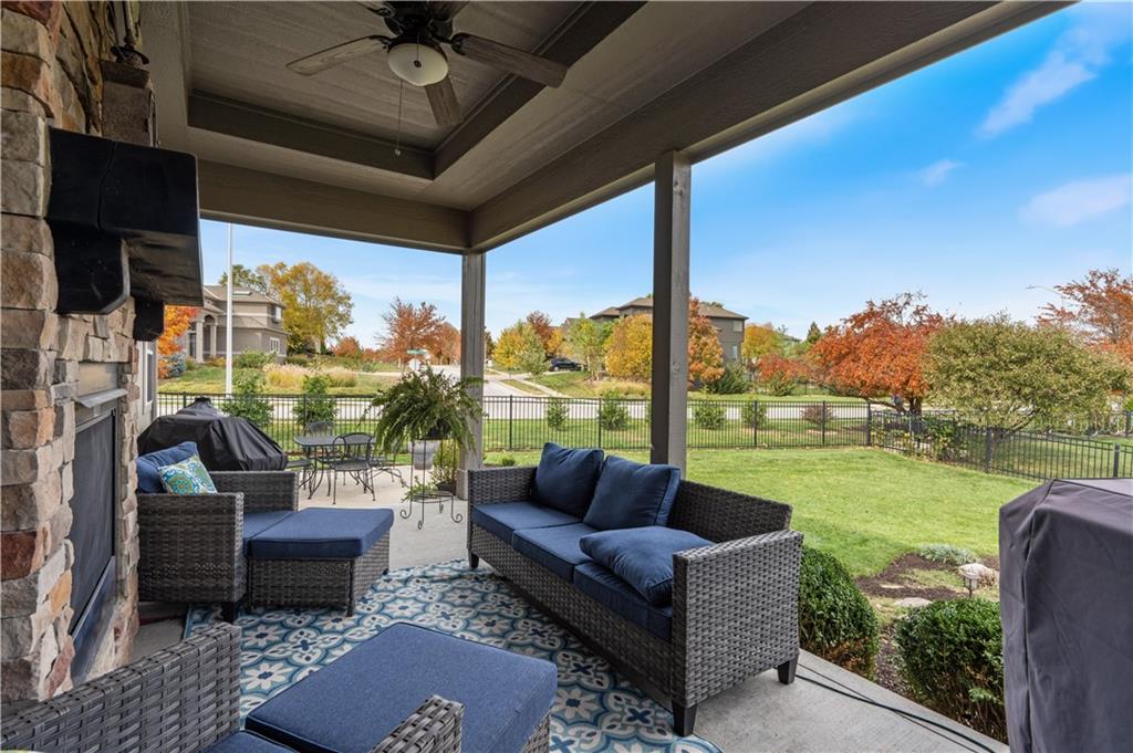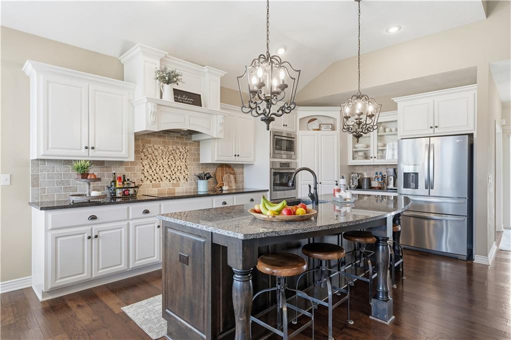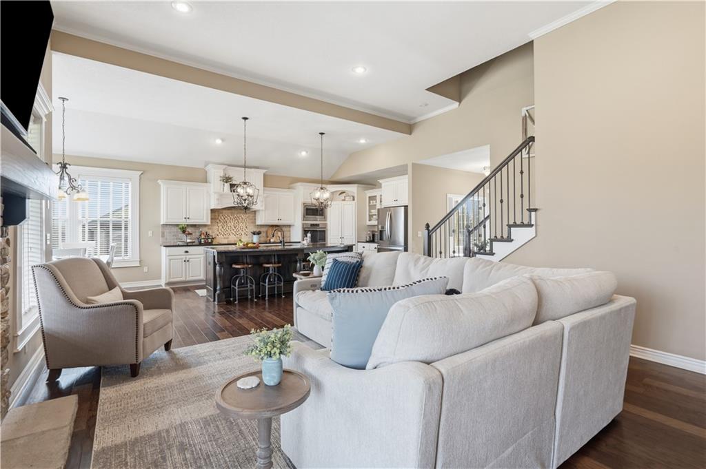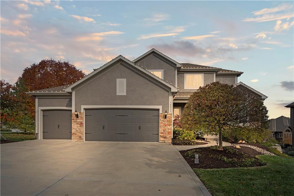 Beautiful "Cherry Creek II" plan by Summit Custom Homes. This 1.5 story plan in Falcon Valley features a spacious primary bedroom & bath on the main level. Also, on the main level you'll find the kitchen, vaulted great room w/see through fireplace, breakfast room, an office, laundry room, and all of this charm steps out onto a covered patio w/tons of beautiful landscaping to enjoy & relax within. Upstairs, there are (3) ample sized bedrooms w/2 full baths. In the lower level, you'll get to experience the comfortable ambience of the beautiful rec room w/Bar as well as a (5th) bedroom and 4th full bath. This home has been lovingly maintained and lived in by the original owners. Exterior was just painted, new carpeting on the stairs and in main level office. This gorgeous house sits upon a cul de sac lot w/access to the sidewalks for walking your dog or just taking a leisurely stroll. Great location in Lenexa. Close to highways, schools, dining and more.