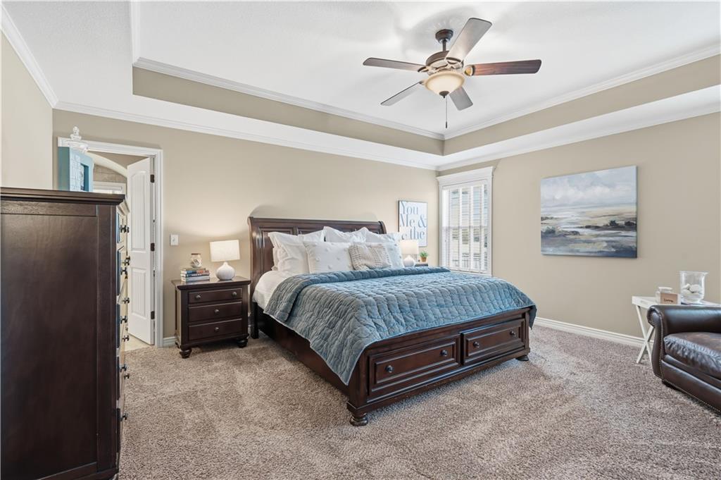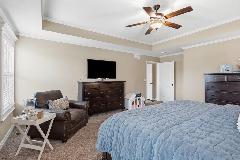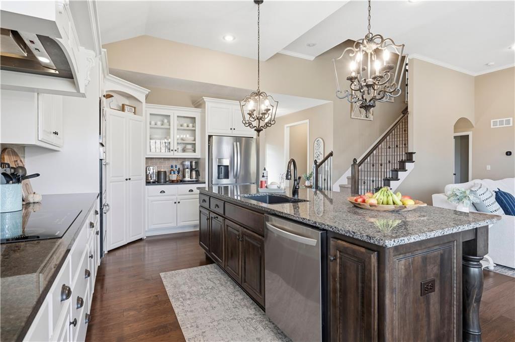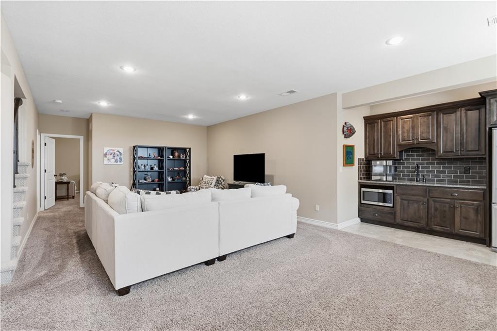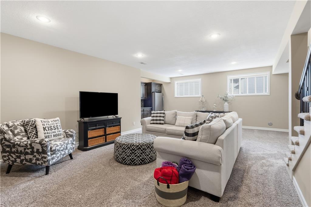 Beautiful "Cherry Creek II" plan by Summit Custom Homes. This 1.5 story plan in Falcon Valley features a spacious primary bedroom & bath on the main level. Also, on the main level you'll find the kitchen, vaulted great room w/see through fireplace, breakfast room, an office, laundry room, and all of this charm steps out onto a covered patio w/tons of beautiful landscaping to enjoy & relax within. Upstairs, there are (3) ample sized bedrooms w/2 full baths. In the lower level, you'll get to experience the comfortable ambience of the beautiful rec room w/Bar as well as a (5th) bedroom and 4th full bath. This home has been lovingly maintained and lived in by the original owners. Exterior was just painted, new carpeting on the stairs and in main level office. This gorgeous house sits upon a cul de sac lot w/access to the sidewalks for walking your dog or just taking a leisurely stroll. Great location in Lenexa. Close to highways, schools, dining and more.