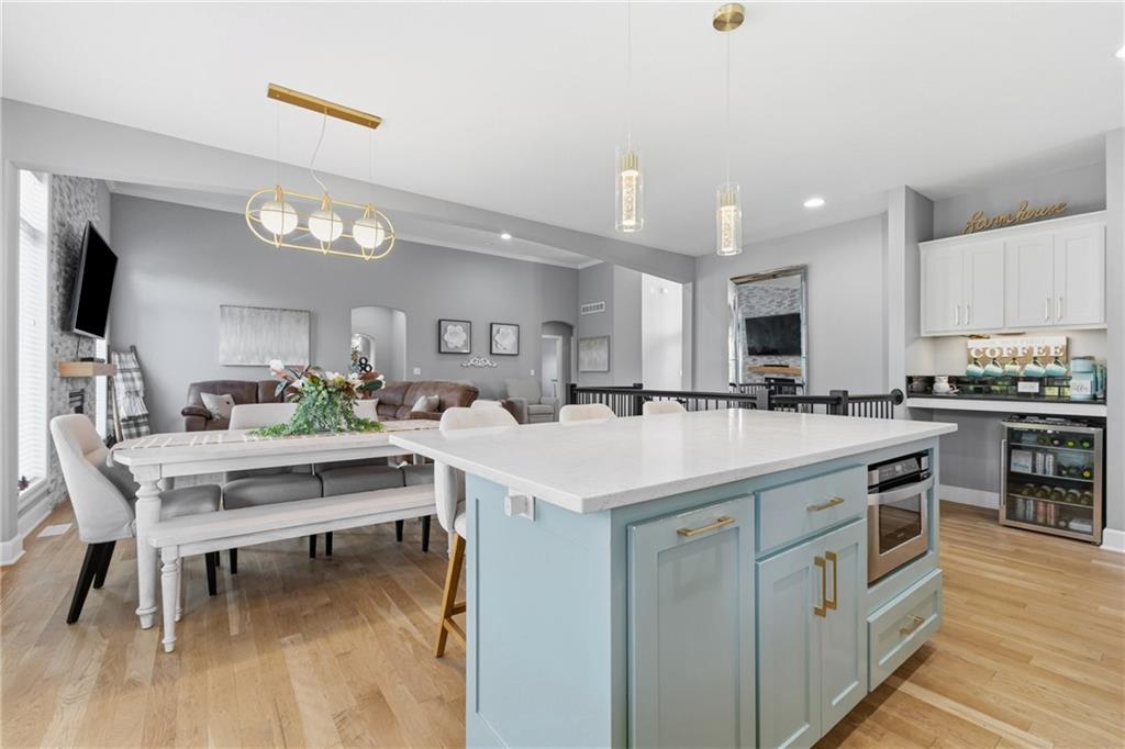 Welcome to this spacious 3,845 sq. ft. home situated on a .47-acre cul-de-sac corner lot in the highly sought-after Staley Farms Subdivision. This home combines elegance and functionality with soaring ceilings, updated lighting throughout, and refinished hardwood floors. The exterior received fresh paint in 2022, new landscaping in 2025, updated front door and the main-level full bath has been beautifully remodeled. (new roof will be installed prior to closing) Enjoy your evenings and weekends catching games on the TV on covered back deck. The main level offers 3 bedrooms, including a luxurious master suite with a large two-headed shower and a walk-in closet. The finished basement features high ceilings 2 additional bedrooms with a Jack-and-Jill bath, a full bath off the family room, and a wet bar with an island for entertaining. Equipped with a 4th-car garage perfect for storage or a golf cart. Extra features include abundant storage and a built-in safe room ideal for valuables or shelter. Add a hot tub to the back porch, the home is already wired for it. Enjoy all the neighborhood amenities Staley Farms has to offer: a zero-entry pool, lap pool, gym, basketball and tennis courts, volleyball court, and a children’s play area. Perfect for family living and entertaining, this home offers comfort, style, and endless possibilities.