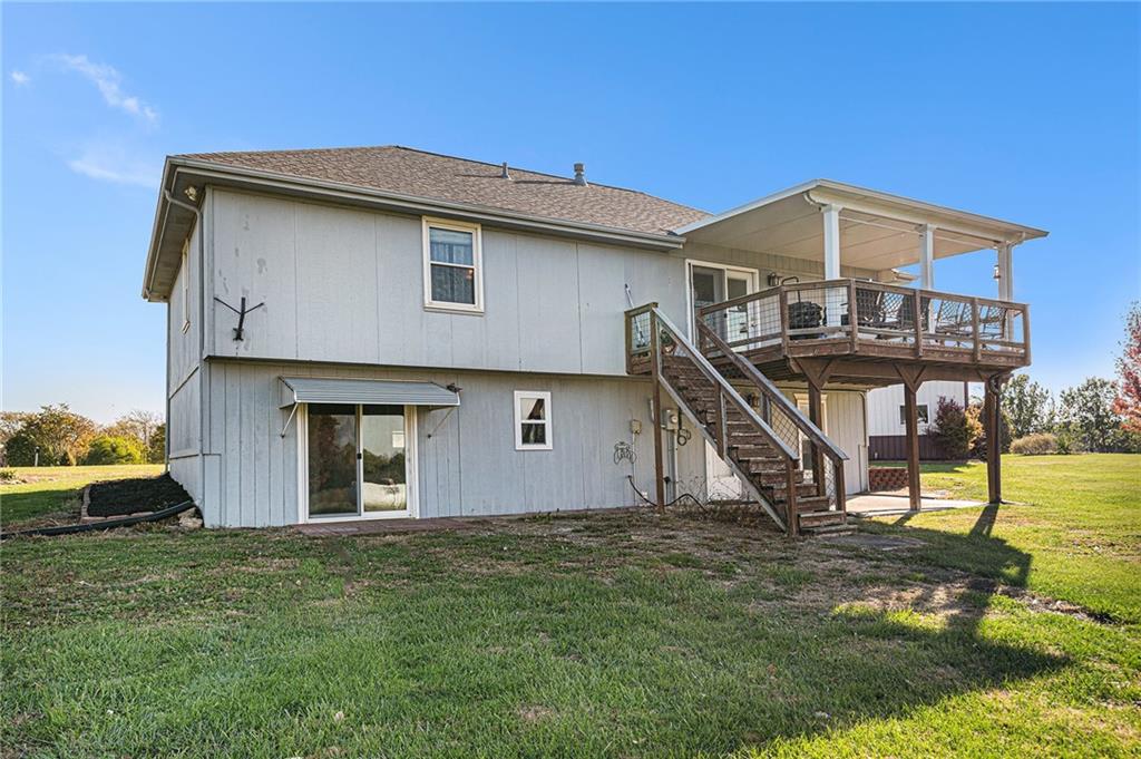 This charming 3-bedroom, 2.5-bath split-entry home sits on 3 acres and combines functional living with versatile spaces. Enjoy two spacious living areas, including a massive family room thoughtfully converted from the garage. Ideal for entertaining, hobbies, or a cozy retreat. The fully equipped kitchen flows effortlessly to a covered deck overlooking the backyard, perfect for outdoor dining and relaxation. A formal dining room provides ample space for gatherings of any size. A circular driveway leads to a generous 45’x30’ detached garage/workshop, offering abundant room for vehicles, projects, or storage. With its smart layout, expansive indoor and outdoor space, and prime location just minutes from I-35, this home offers the perfect blend of country charm and modern convenience.