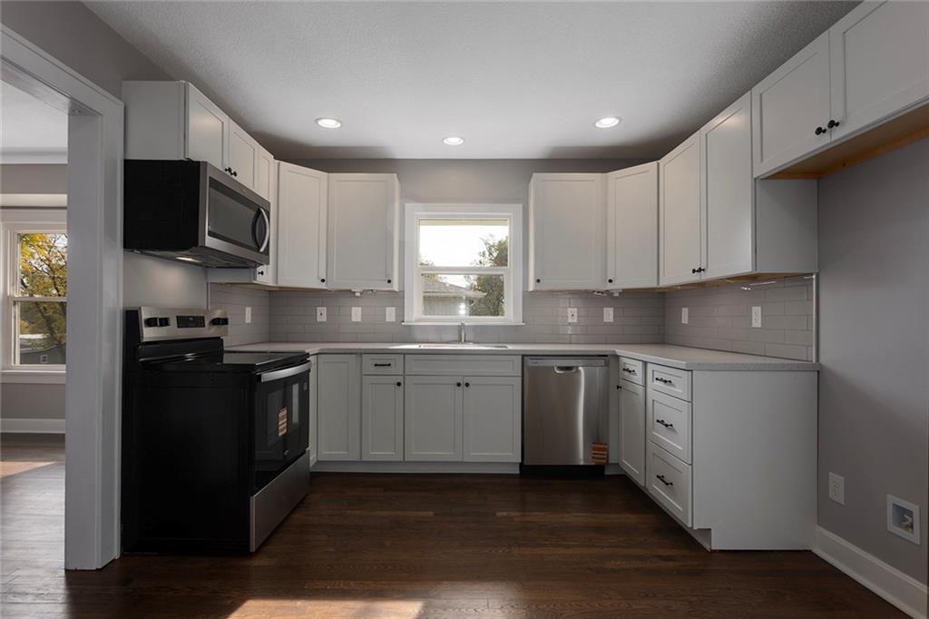 Overland Park address off Merriam Drive near I 435 & I 35. Remarkable home that has been in the same family for 80 years and passed through multiple generations. Third generation grandson and spouse recently rehabbed this adorable bungalow. The original wood floors have been refinished. Brand NEW KITCHEN everything!!! White cabinetry, solid surface countertop, subway tile, ss appliances, ss Kraus sink and under-cabinet accent lighting. The main rooms are very generous and there are 2 bedrooms and 2 full bathrooms (one complete remodel and one all new (except for shower). Full basement with new wall separating the potential woman/man cave from the New concrete floor in tandem garage. Wow! Covered front porch in front and deck with steps in the back. New 200amp and mostly new wiring. New A-coil and furnace, A/C 5 years old. Roof, gutters and soffits new. Older, but double-hung replacement windows, new slider to deck, new safety glass in basement windows. Pro photos in 24 hours.