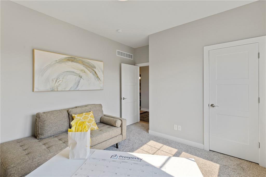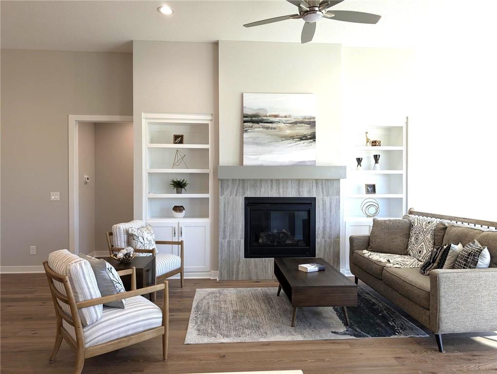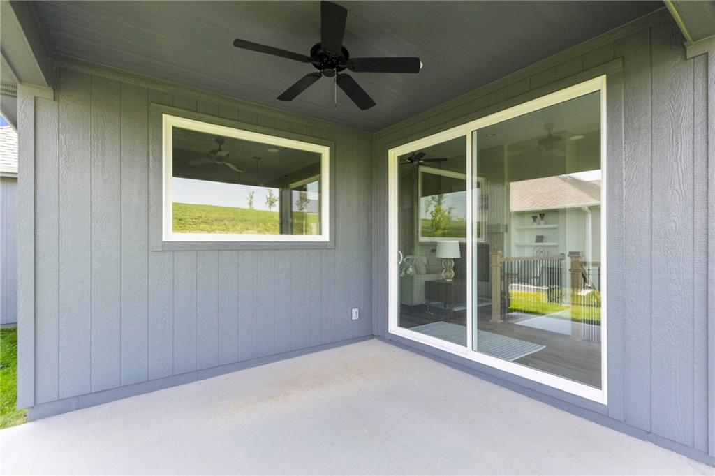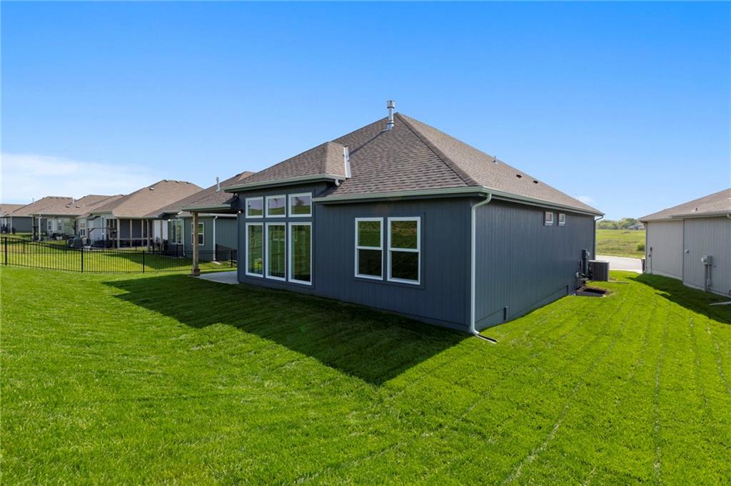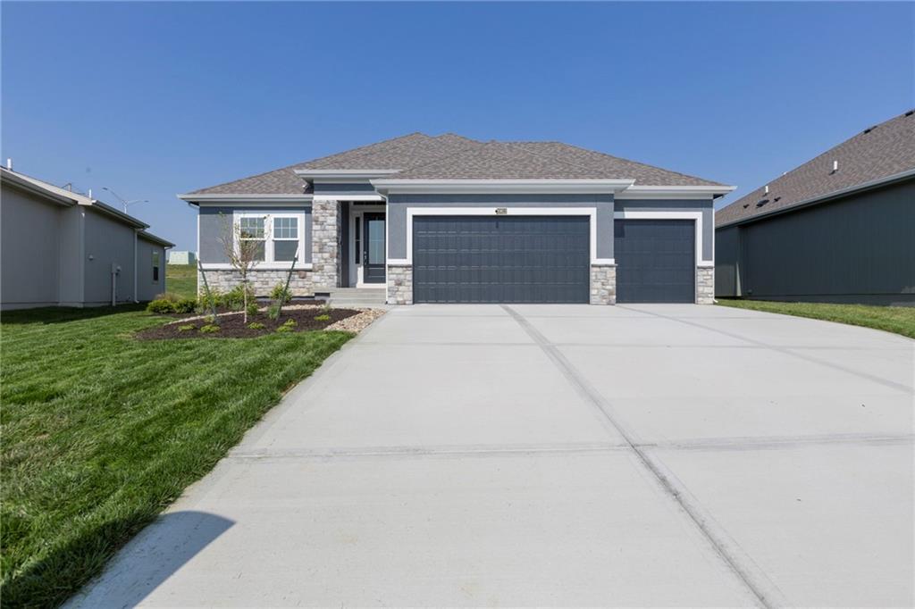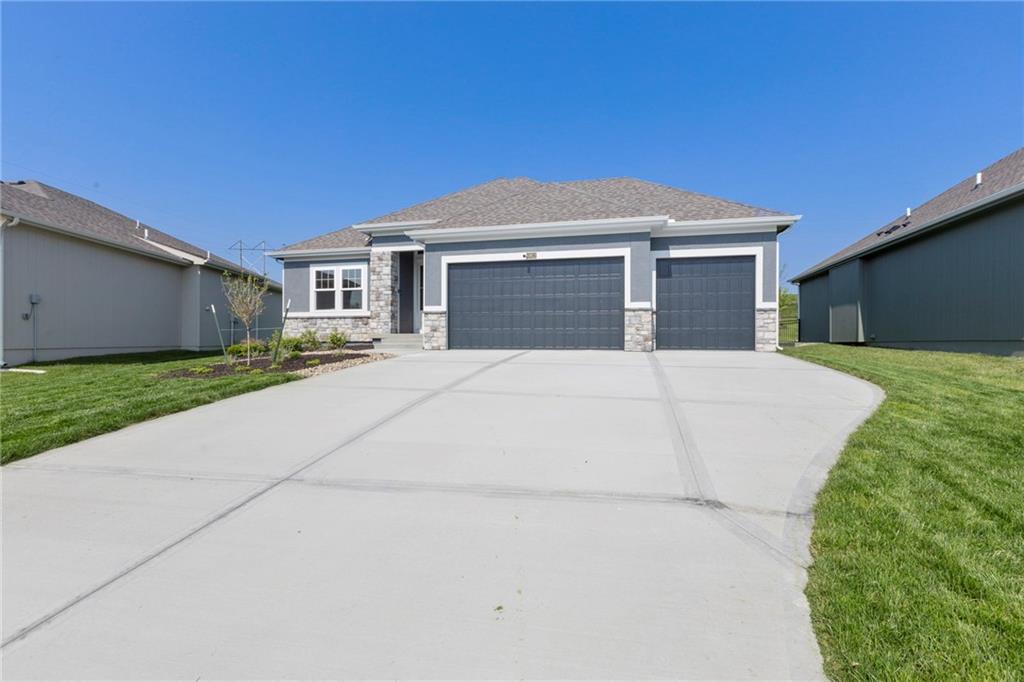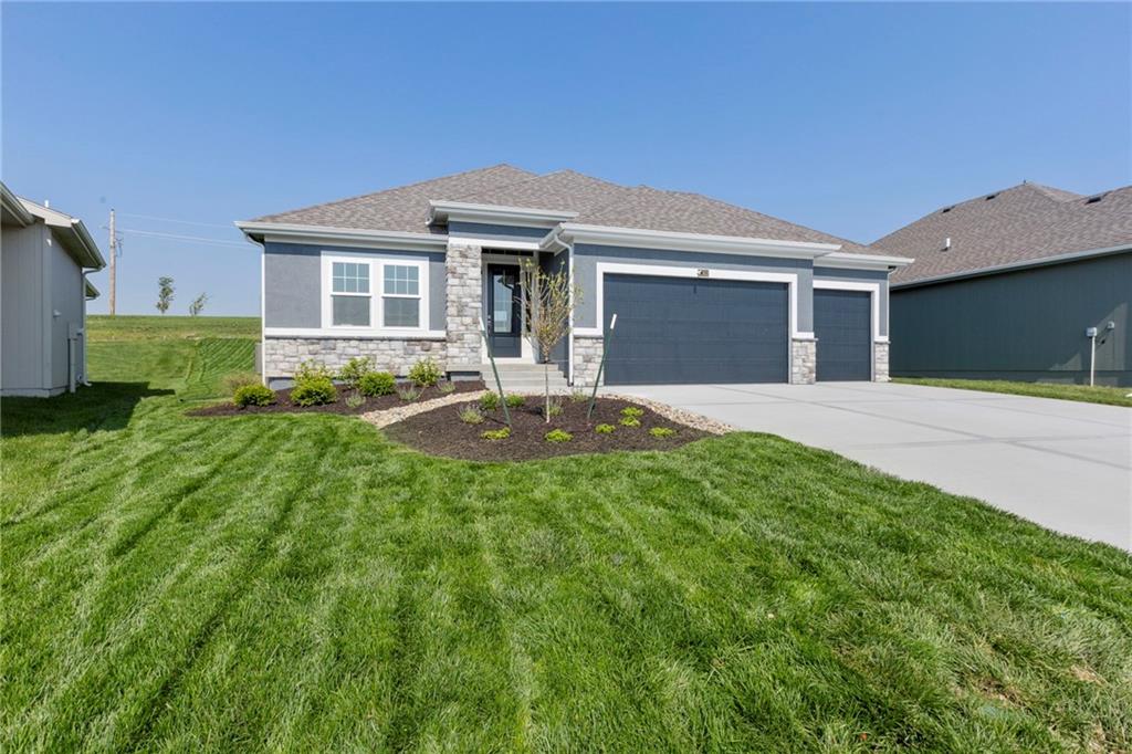 ** Exceptional quality meets effortless living in the final Patriot Home available in Maintenance Provided Cadence Villas.This home is finished.** Resize your living space with ease and enjoy the benefits of maintenance provided living in the Truman by Patriot Homes! Located on a secluded cul-de-sac homesite, this Reverse 1.5-story open concept floor plan includes a stone-clad traditional façade, three-car garage, and covered front porch. The 8-foot front door leads into a spacious entry with a 12-foot ceiling highlighted by an elegant trim treatment and chandelier. Hardwood flooring throughout the main entry, living and kitchen accentuates the seamless flow between the dining room, kitchen, and great room while a bedroom and full bathroom just off the entry makes for an ideal guest or bonus room. Arguably the showpiece of the home, the kitchen is outfitted with expansive quartz countertops, large center island, shaker style custom cabinetry, and stainless steel Samsung appliances. Opposite the kitchen is a cozy great room with a gas fireplace, built-in bookshelves, floor-to-ceiling windows, and an 8-foot sliding glass door that opens to a covered patio. A private hallway leads to the master suite showcasing an exquisite freestanding soaker tub, zero entry walk-in shower, Bluetooth audio system, and a sizeable walk-in closet with third tier pull down rods. The Truman comes equipped with additional conveniences such as 8-foot tall garage doors with an included belt drive opener on main door, an irrigation system, high efficiency 96% Lennox furnace, whole house humidifier, and 50-gallon electric water heater. Homeowners also have an annual HOA fee of $600. This villa is in Prestigious Phase 1, Cadence Villas, a Hunt Midwest Maintenance Provided Community.