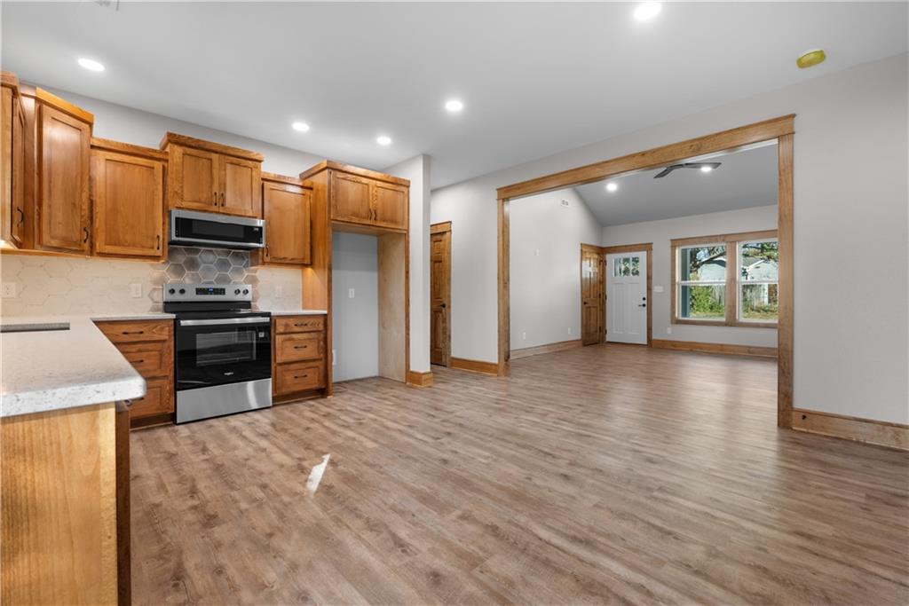 Welcome to this stunning new construction home offering 3 bedrooms, 2 bathrooms, and 1,376 square feet of modern comfort! Step inside to an open-concept layout featuring luxury vinyl plank flooring throughout, beautiful stained cabinets, granite countertops, and under-cabinet lighting. The custom closets add thoughtful storage and style. Enjoy outdoor living on the covered front and back porches, perfect for relaxing or entertaining. With a spacious 3-car garage, additional shop space, all-electric HVAC system, insulated fiberglass exterior doors, and energy-efficient vinyl windows, this home combines quality, efficiency, and charm—all on a desirable corner lot!