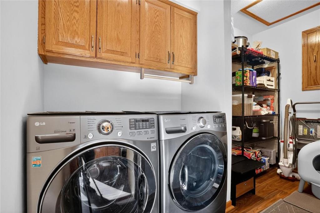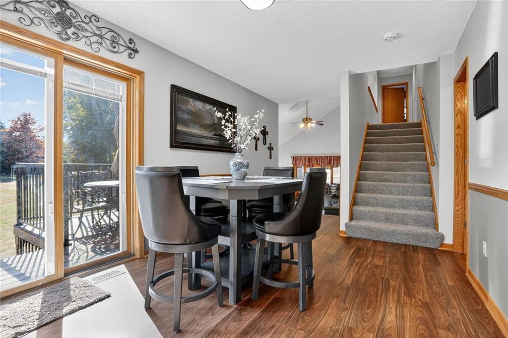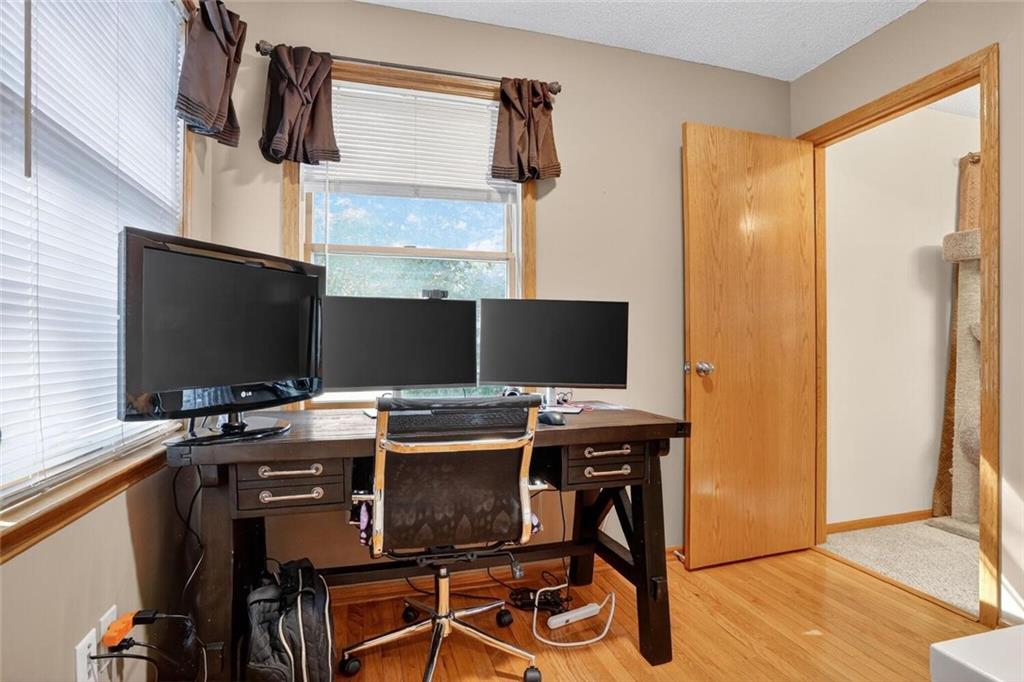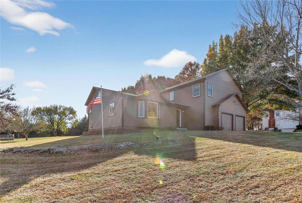 Peaceful Setting in Windmill Springs on an extra-large level (just over an acre!) Lot outside city limits w/no HOA, this 3 Bedroom, 2.5 Bath home offers flexible space for daily living. Entry features a vaulted ceiling, coat closet, & all-new LVP on the main level. The Great Room centers on a masonry brick Fireplace w/oak mantle & brick hearth, 17' Vaulted Ceiling, custom-blind Windows on two sides, library panel to chair rail, Ceiling Fan, & LVP. The Eat-In Kitchen includes black granite Countertops, ceramic tile Backsplash, oak raised-panel Cabinets, under-cabinet lighting, a corner composite farmhouse Sink framed by dual Windows, & a Pantry w/adjustable shelves. Stainless Appliances: Electric Range, Dishwasher & Refrigerator; black Built-In Microwave. Dining opens to a Composite Deck w/aluminum railing that steps to the Backyard. Main-level Laundry offers cabinets & extra storage. A Half Bath is conveniently located on the main level. Upstairs, the Primary Bedroom connects to a Flex Space/Office. The Primary Bathroom features two vanities, an upgraded cultured marble Shower w/glass doors & built-ins, and generous linen storage. Two additional Bedrooms are connected by a Full Bath. A T-shaped Hallway overlooks the Great Room & includes a built-in linen cabinet. The Front-Entry Garage is extra deep for vehicles(3 cars fit), gear, or workshop use, offering insulated Doors w/openers, finished walls & ceiling, over-nine-foot Ceiling height, built-in shelving, work bench, a side Window, & walkout access to the Backyard. Lower Level provides daylight Windows, tall ceilings, storage, & future finish potential. Systems include a Lennox heat pump & a Rheem water heater. Outdoor living adds a fenced garden area, mature trees, a fire-pit, a long concrete Driveway, & a quiet Cul-de-Sac setting. Served by Blue Valley School District. Everyday needs are close by across south Johnson County w/ quick connections to US-69 & 179th Street for commuting, parks, & community amenities.