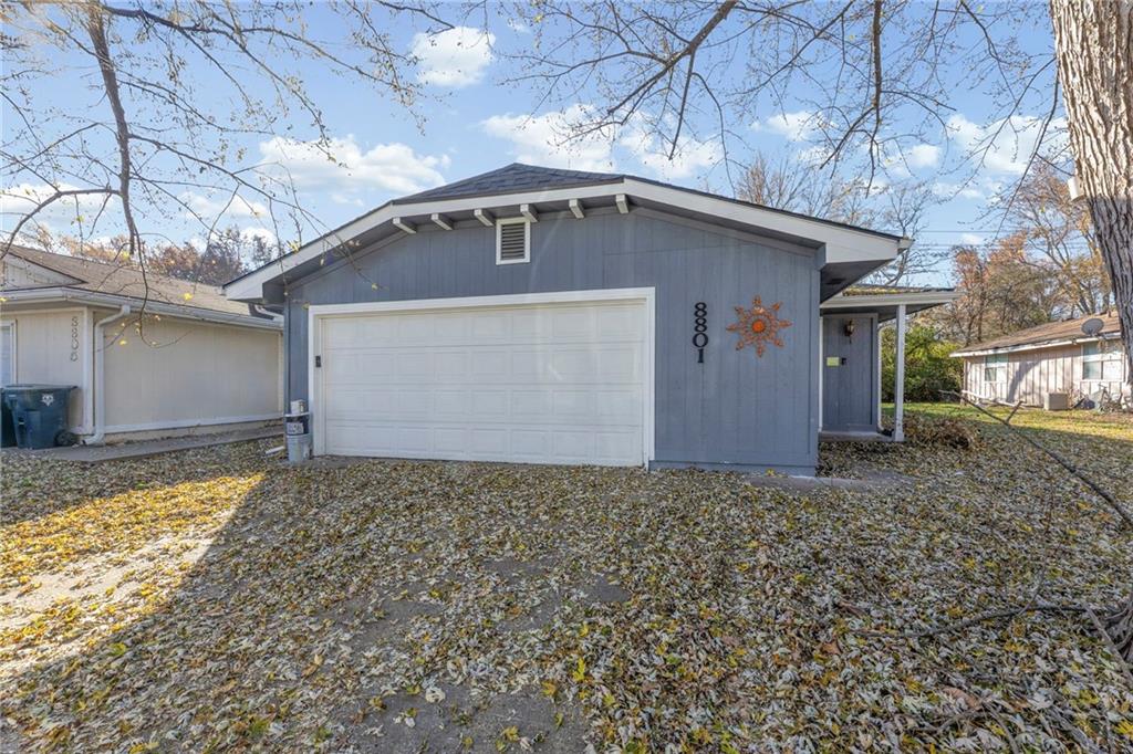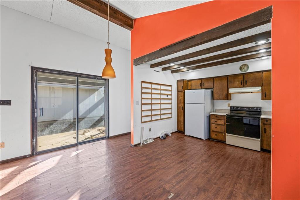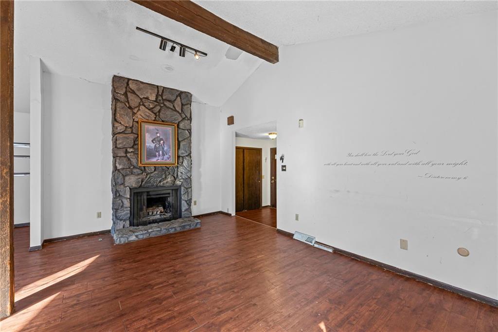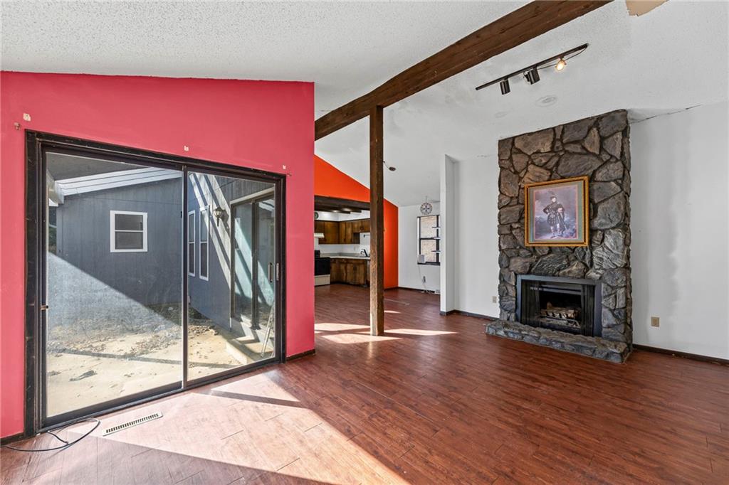 Cozy and full of character, this 2 bedroom, 2 bath ranch at 8801 E 109th is ready for its next chapter. Step inside to a vaulted great room with exposed wood beams, stone fireplace, and wood-look floors that give the space a warm, inviting feel. Large windows and a sliding glass door let in tons of natural light and walk out to the backyard. The spacious eat-in kitchen offers abundant cabinet and counter space, plus room for a dining table or island and sight lines back toward the living area—perfect for everyday living or entertaining. Down the hall you’ll find a comfortable primary bedroom with its own bath, a second bedroom, and an additional full bath. Outside, mature trees and a generous yard provide space for pets, play, or a future patio or garden. Conveniently located in south Kansas City with quick access to shopping, dining, and highways, this home is a great opportunity to move in now and add your personal updates over time.