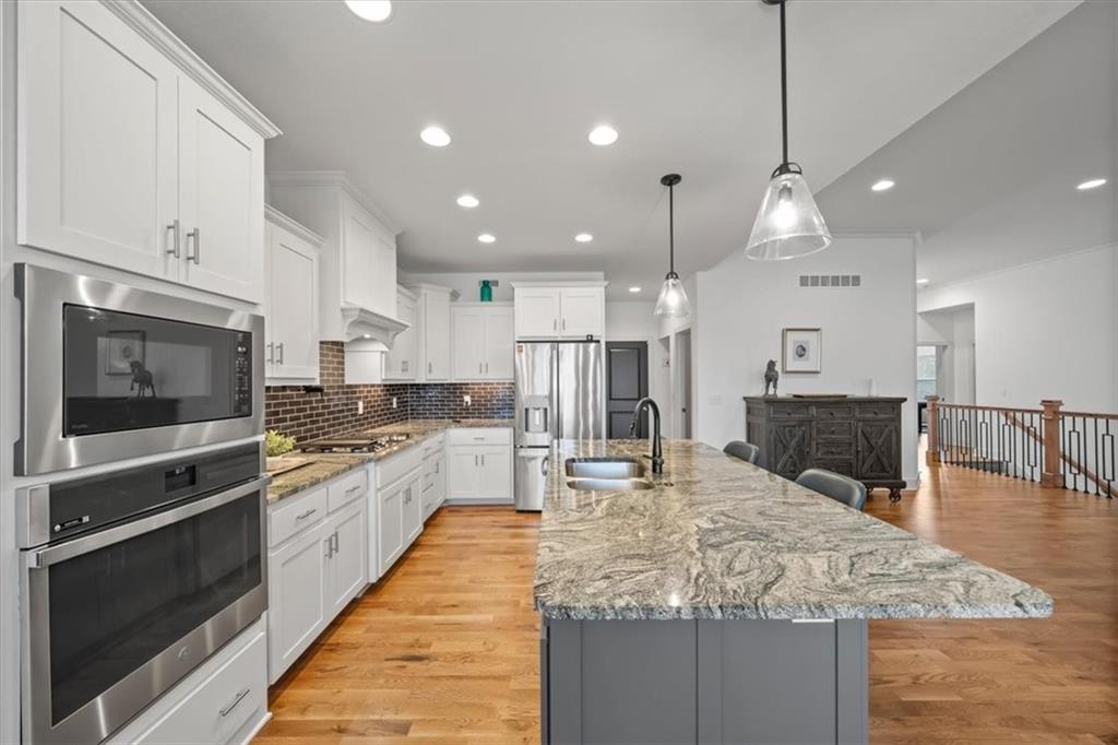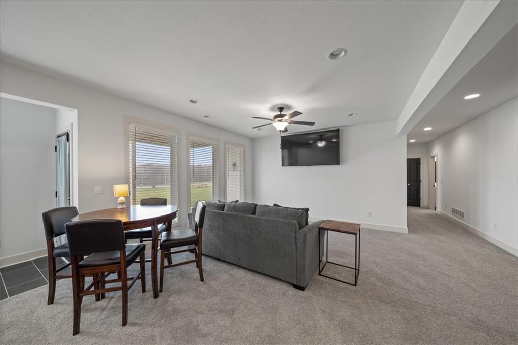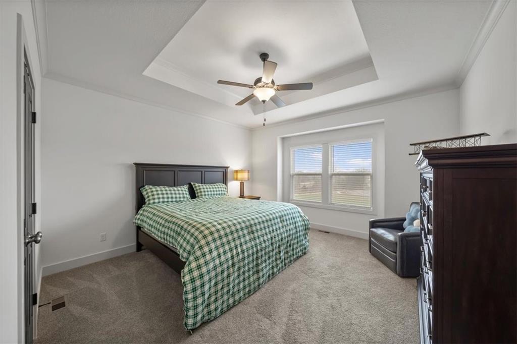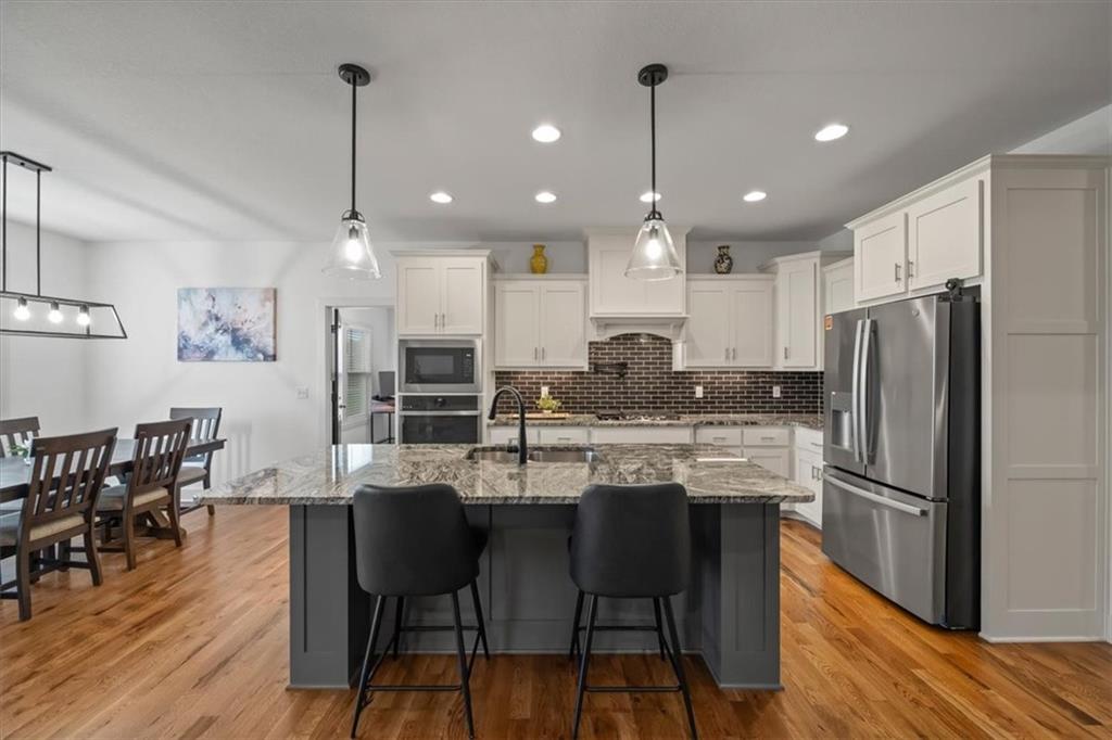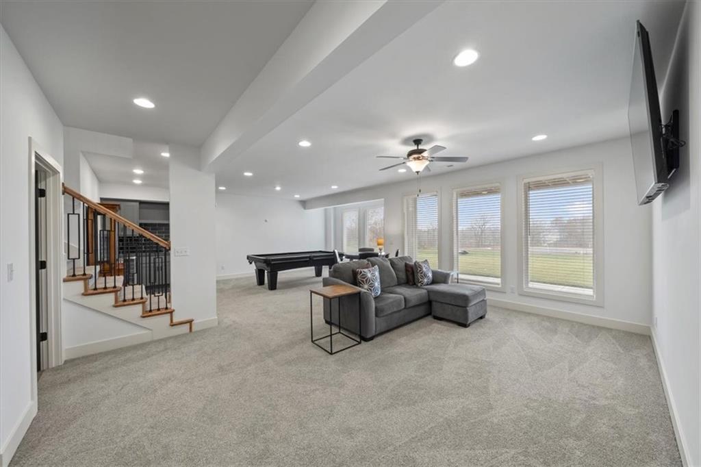 Stunning Reverse One-and-a-Half Home with Premium Upgrades Main Level Features This impeccably and lovingly maintained reverse one-and-a-half home showcases a wealth of upgrades throughout the main level. Step onto the stupendously large front porch, perfect for leisure and gazing at the surroundings. Inside, sunlight pours into the foyer, which towers above beautifully maintained hardwood floors found throughout the main living areas. All bedrooms are equipped with walk-in closets, providing ample storage space. One of the bedrooms offers flexibility and can be used as a home office. The open concept living room and dining room create a relaxing atmosphere, seamlessly connected to a screened deck that overlooks a tranquil nature reserve and trail. The kitchen features upgraded countertops and throughout, complemented by abundant cabinetry, stainless steel appliances, and a convenient pot filler. A vent hood is designed for outside ventilation, enhancing the kitchen's functionality and appeal. Lower Level Amenities Descending to the walk-out basement, you will find a spacious family room and a wet bar, ideal for entertaining. The ground-level patio extends the living space outdoors. Two bedrooms serviced by a jack -in-Jill bathroom for added convenience, and built-in bookcases. The additional fully finished recreational room offers versatility, that is adjacent to a separate finished gym and a storage room. There is also a partially finished storm shelter adjacent to another partially finished storage room for added utility. Outdoor Space The property is complemented by a large backyard, perfect for relaxation, play, or enjoying the natural surroundings.