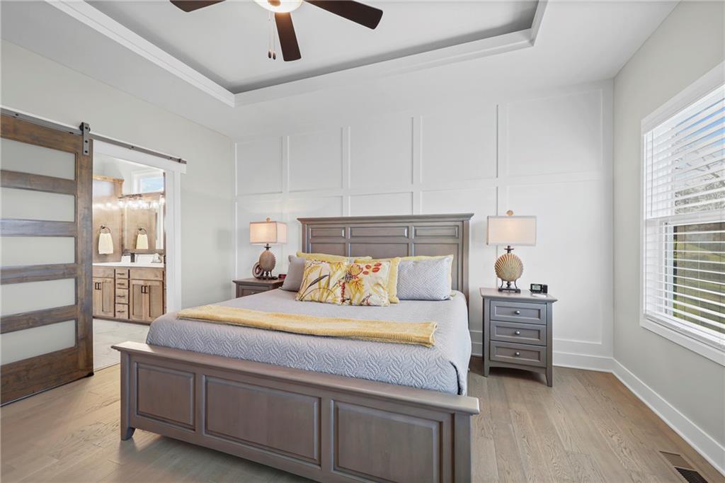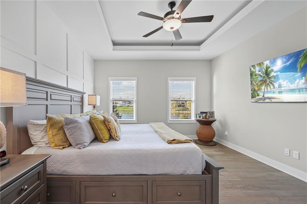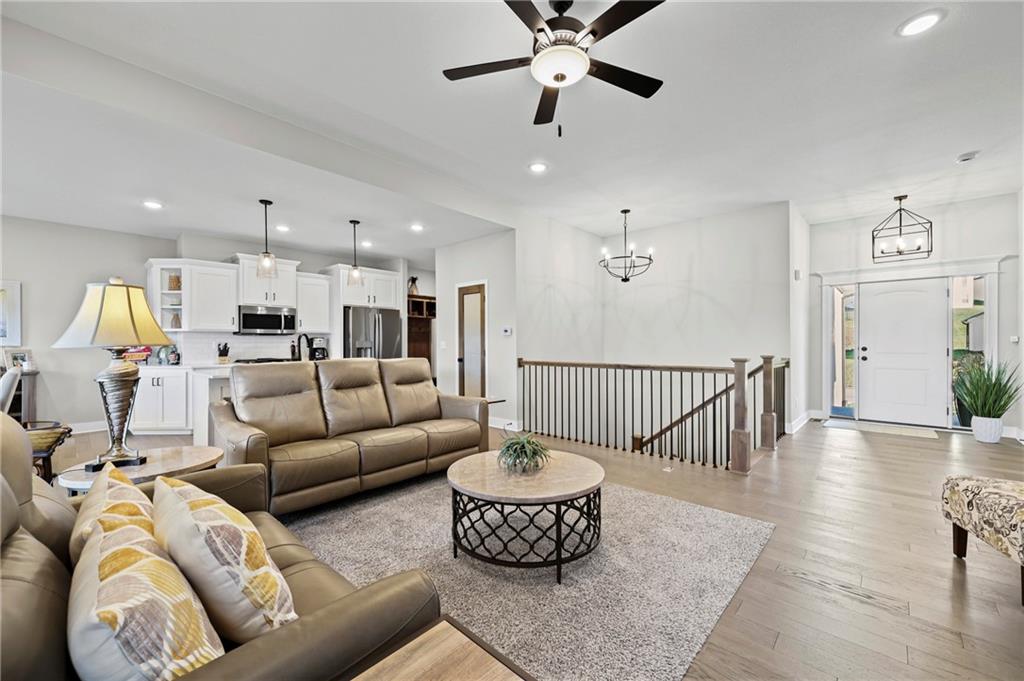 Welcome to this breathtaking modern reverse 11/2 story home backing up to lake. Features a spacious main floor with primary bedroom on main floor and second main floor bedroom too. The kitchen features a large walk-in pantry, large island with open airy floor plan. Covered patio overlooks pond and flat back lawn with sprinkler's. Down stairs, second living area has two bedrooms and bathroom - rec room that walks out to patio. Large 3 car garage to fit lots of toy's. Great floor plan, well maintained home. The pictures are worth a thousand words.