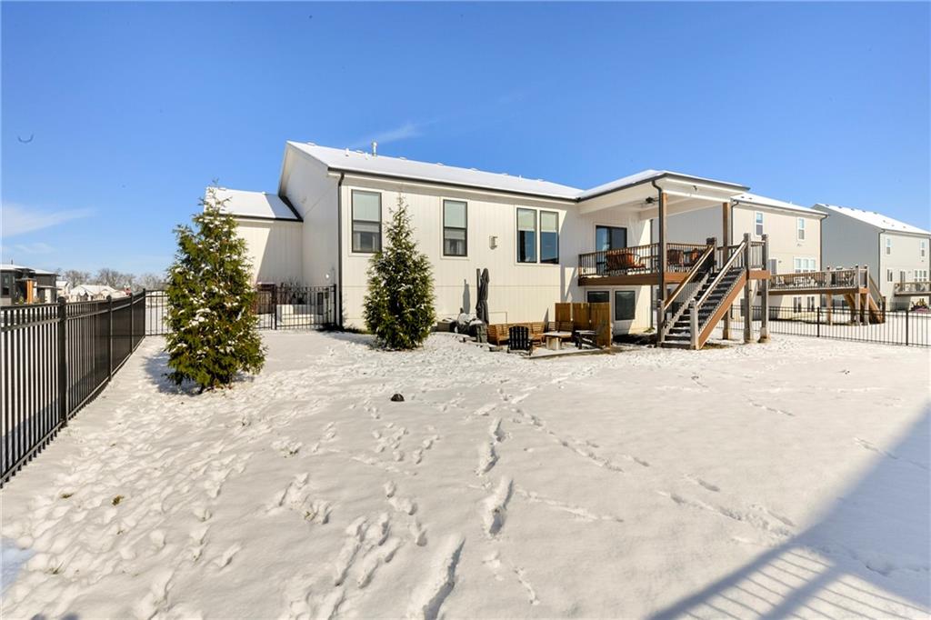 Immaculate 2-year-old Reverse Ranch on a premium corner lot featuring a modern open layout, upgraded finishes, and exceptional indoor/outdoor living spaces. This former model home showcases a spacious great room with floor-to-ceiling stone fireplace, large windows for abundant natural light, and engineered hardwood floors throughout the main living areas. The designer kitchen includes quartz countertops, large center island w/ seating, upgraded trim, Gas Range w/Convection, pot-filler, stainless appliances, farmhouse sink, brushed brass fixtures, glass-door display cabinetry, and subway tile backsplash. The dining area flows seamlessly to the covered deck overlooking the fenced backyard. The primary suite offers a tray ceiling with wood plank detail, large windows, and a spa-inspired bath with dual quartz vanities, upgraded lighting, a walk-in tile shower with bench, herringbone accent wall, and matte black fixtures. The oversized walk-in closet connects conveniently to the laundry and mudroom w/ built-in drop zone. Additional main-level bedrooms include upgraded lighting & modern wall accents along with attractive wood finishes in the vanity and matching mirror. A second full bath features contemporary vertical tile and updated finishes. The finished lower level provides a generous second living area with recessed lighting, plush carpet, & a wet bar with custom backsplash. Additional bedroom & full bath offer flexibility for guests or extended living arrangements. The unfinished portion is plentiful too, providing value add for future finished space or great storage as it sits. Outdoor features include a covered deck, fully fenced yard with wrought iron fencing, and ample space for recreation. The climate-controlled garage is ideal for storage, hobbies, or year-round comfort. Additional upgrades include premium lighting throughout, wainscoting and trim accents, energy-efficient windows, & a clean modern color palette. Move-in ready and well maintained.