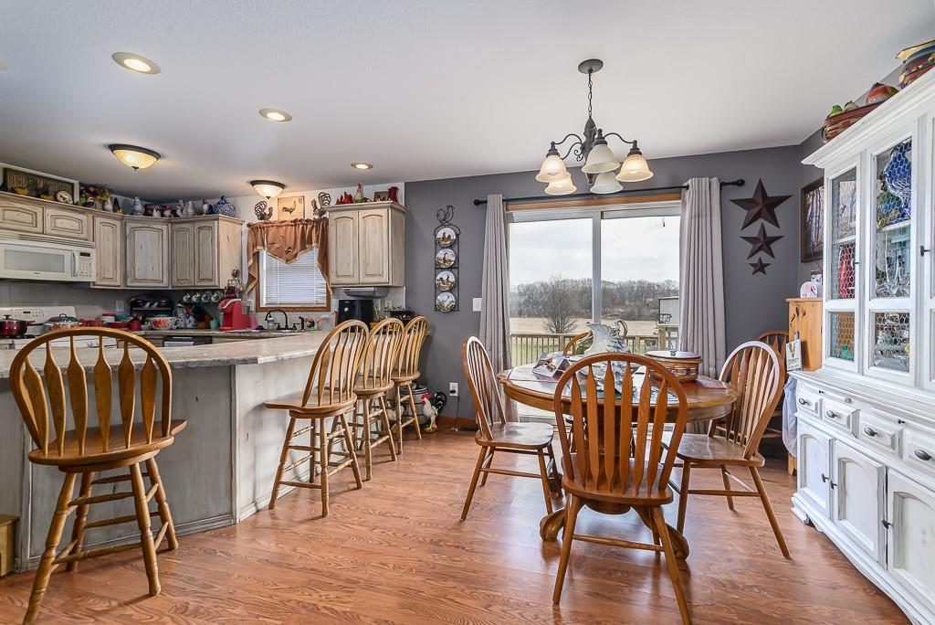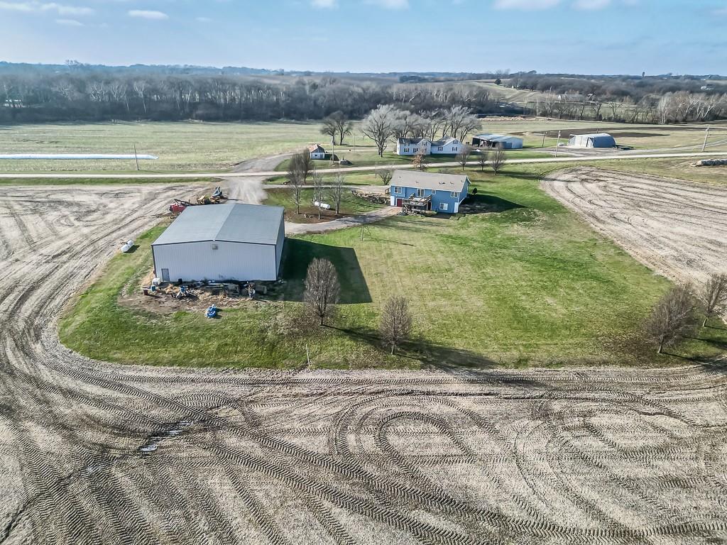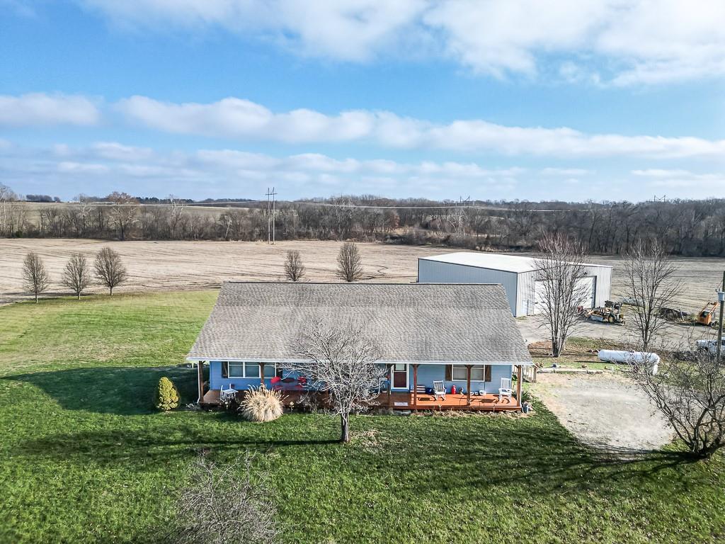 3-BED RANCH ON ALMOST 5 ACRES WITH BIG VIEWS SITTING ON 4.69 ACRES WITH WIDE OPEN SCENIC VIEWS, this 3-bedroom ranch offers the relaxed country setting buyers love. Inside, the open floor plan feels bright and welcoming, with the primary suite set apart for added privacy. It features a walk-in closet, double vanities, a jetted tub, and a separate shower. The other two bedrooms and full bath sit on the opposite side of the home for a simple, functional layout. A covered front porch adds charm, and the full unfinished walkout basement gives you tons of room to expand, including a large workshop area. The commercial quality 60x80 red-iron shop is a standout, offering two 16x16 drive-in doors, two walk doors, insulation, heat, and water—great for running a business, storage, or equipment. The acreage brings space, peaceful views, and plenty of wildlife. This country property offers room to grow and a setting that feels miles away while still within easy reach of town conveniences.