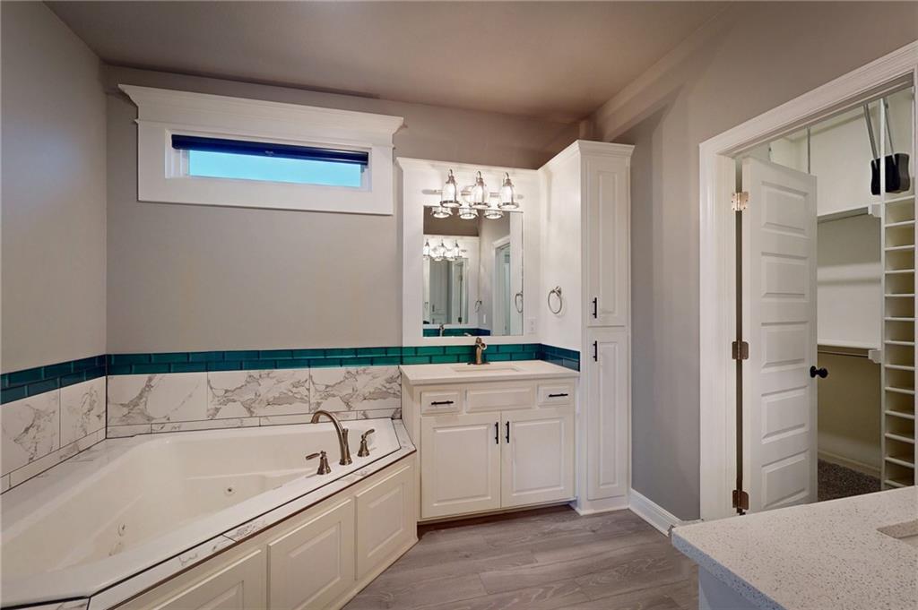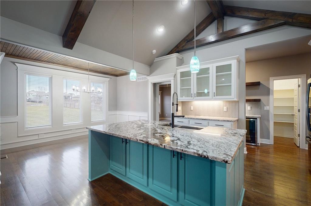 This beautiful Trumark Home - The Marie II is a Reverse 1.5-story / Ranch. This home is move-in ready and only 6 years young! Featuring 4 bedrooms, 3.5 baths, and a 3-car spacious garage, this property sits on nearly half an acre—one of the largest lots in the neighborhood—complete with a fenced backyard. Step inside to an open, high ceiling, inviting floor plan with a spacious living room that flows seamlessly into the dining area and kitchen. The kitchen offers granite countertops, ample cabinetry, a walk in pantry AND a butler’s pantry with a wine fridge for added convenience. The main-level Primary Suite includes a large walk-in closet with pulldowns connected to the laundry room, plus a gorgeous en-suite bath with quartz countertops. A second main-level bedroom adds versatility for guests or office space. The finished lower level expands your living space with a generous family room and wet bar, along with Bedroom #3 featuring a private full bath, and Bedroom #4 with an attached half bath. A storm shelter provides peace of mind. Outdoor living shines with an oversized stamped patio, built-in firepit, and a grill gazebo that stays. The back quarter of the yard is home to multiple garden areas with strawberries and blueberry bushes, and a 6-zone sprinkler system keeps everything lush and green.