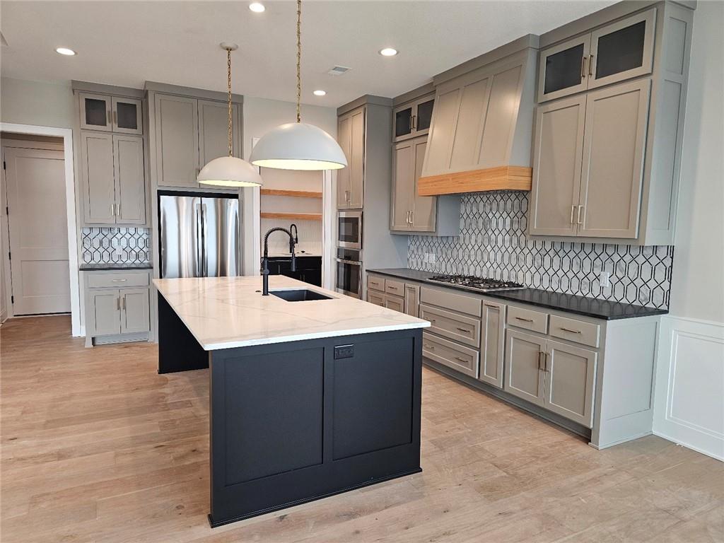 Hilmann Home Building is showcasing their exceptional Newport Rev. 1.5 sty. plan in Prairie Canyon, Johnson Counties newest maintenance provided community conveniently located just west of K-7 Hwy. off College Blvd.! This is a stunning reproduction of their furnished model, which you can tour daily right next door! Very special setting, backing east to greenspace with long valley views. Open concept Great rm/Kitchen & Dining w/huge island & walk-in pantry. Beautiful Primary suite and versatile Guest rm./Den on the main floor. Walkout LL features 2 generous bedrooms w/share bath, Family rm. w/FP, Rec rm space, wet bar & powder room. Covered deck off the main floor & covered patio off the lower level. Elegantly appointed thru-out, you won't want to miss this exceptional property by Hilmann ! !