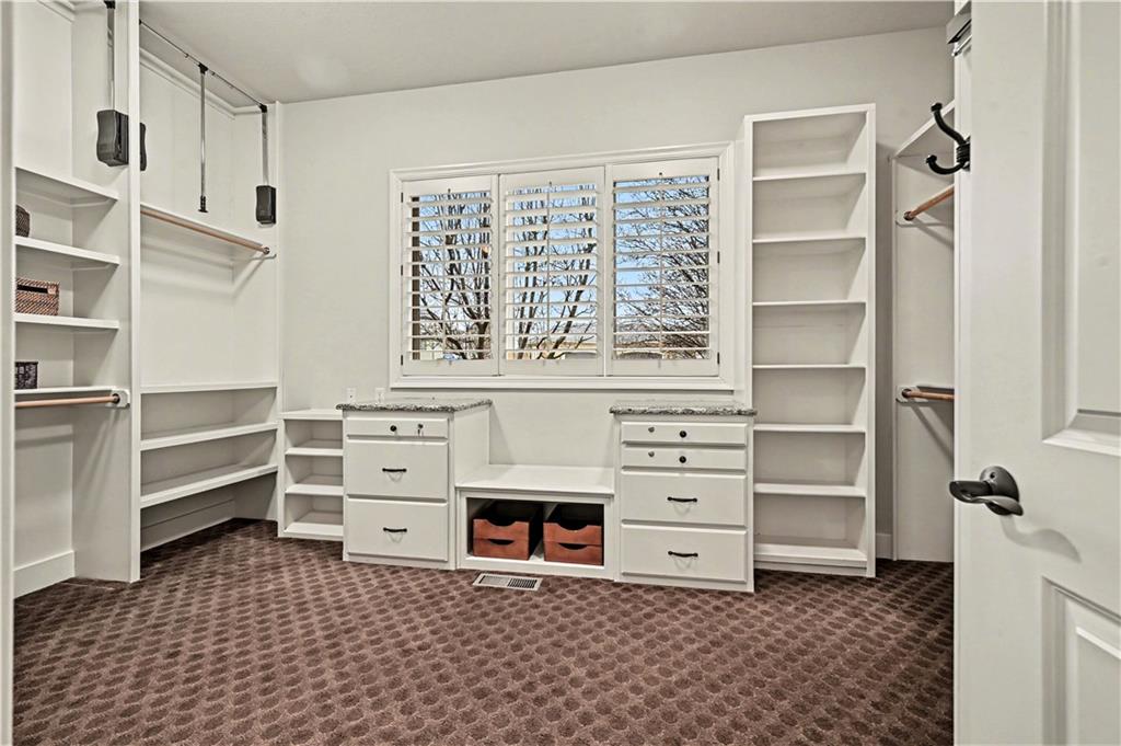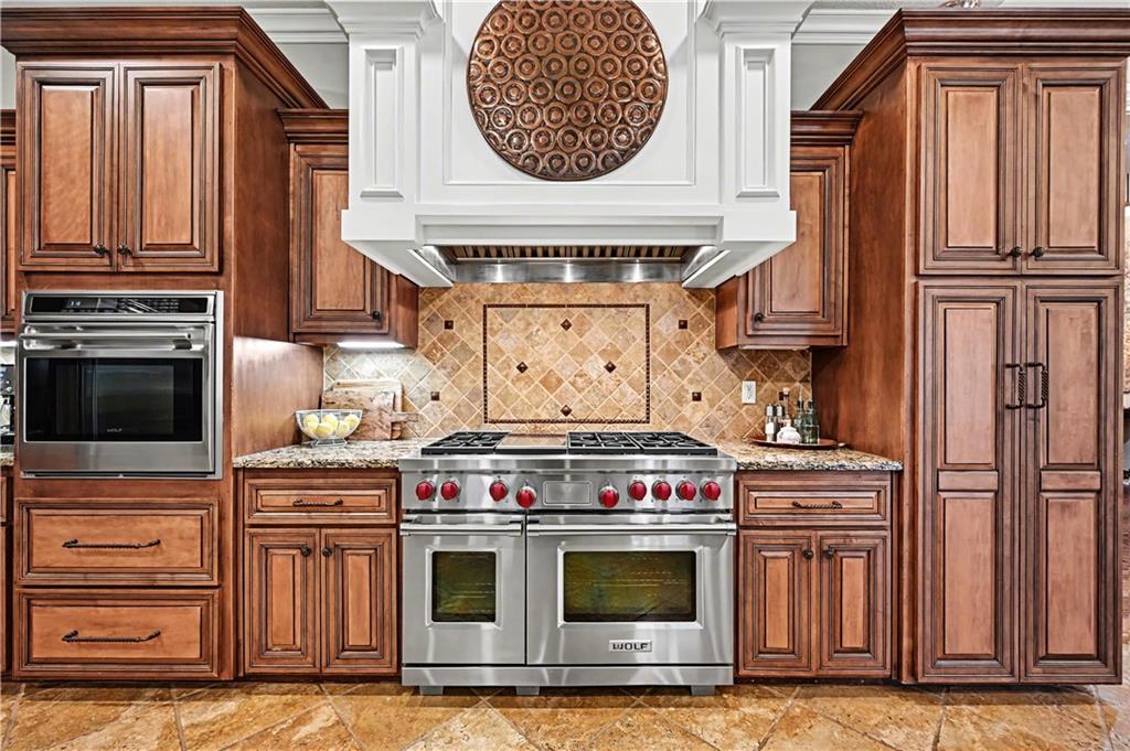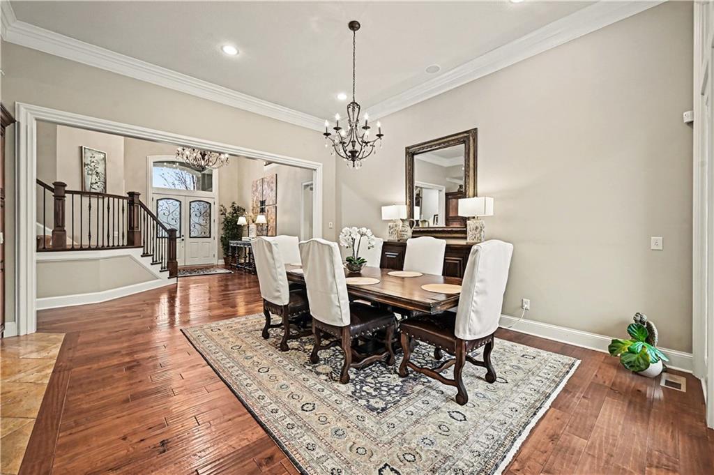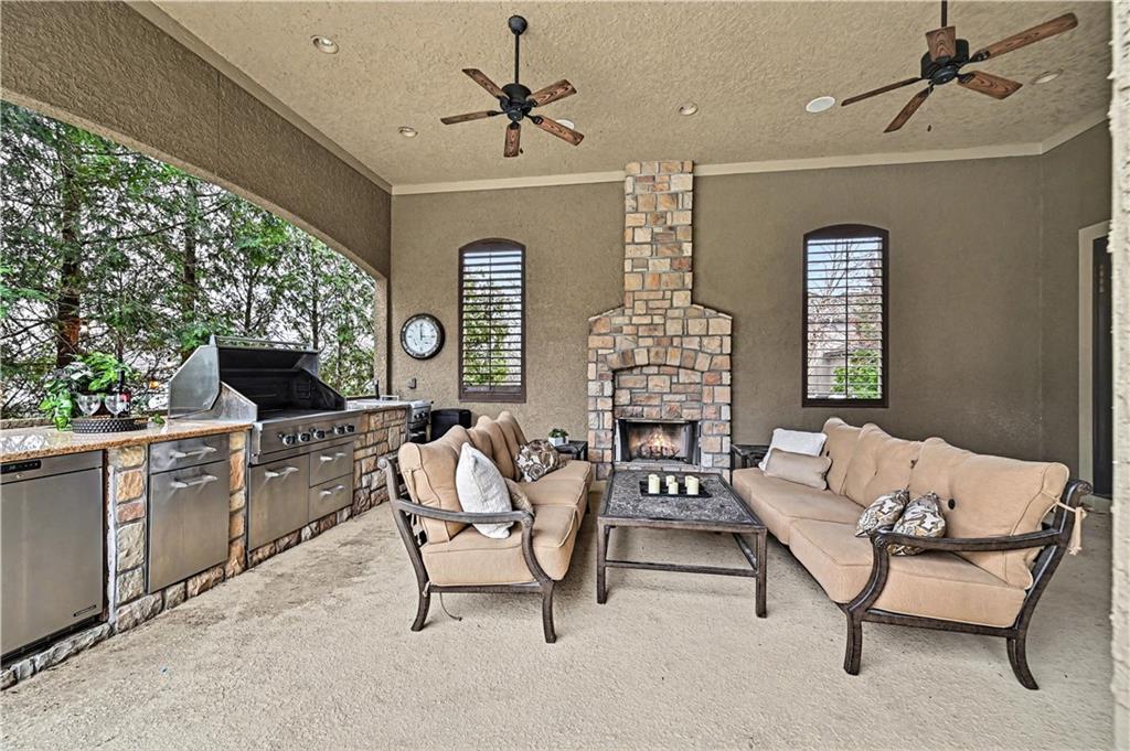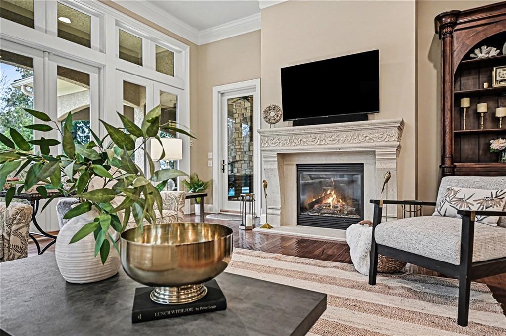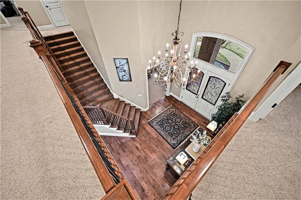 Exquisite 5 bedroom estate home in the sought-after golf course community of Falcon Ridge Estates! Spacious and rare 1.5-story with two main-floor primary suites, two laundry rooms, a saltwater pool, and 5,000+ sq ft. From the side-entry garage to the double front doors and grand two-story entry, you’ll want to call this house HOME! Off the entry is an office with French doors, leading into the spacious open main floor-perfect for entertaining or large families. The highlight is the true chef’s kitchen with 3 WOLF ovens, a 6-burner cooktop with griddle, plus a convection/multi-function oven. Additional features include an ice maker, 2 dishwashers, custom cabinetry, 2 lazy Susans, a large walk-in pantry, SUB-ZERO refrigerator, and an L-shaped granite island with seating for 6+ barstools. The kitchen and dining areas open to the family room with a gas fireplace, floor-to-ceiling windows, and French doors leading to the patio and pool. Enjoy the outdoor kitchen with Viking grill, cooktop, and mini fridge under a covered lanai with wood-burning fireplace and TV area. Primary suite #1 features hardwood floors, sitting area, and spa-like bath with double sinks, vanity, spa tub, TV, walk-in shower with multiple heads and bench, plus an extra-large walk-in closet with second laundry. The second primary suite is also on the main floor with a free standing bathtub, walk-in shower, walk-in closet and lanai access. Also on the main are an office nook, LG laundry rm, 1/2 bath & mudroom. Upstairs offers three additional bedrooms-each w/private bath & lg walk-in closet plus a spacious family room. Granite counters in all baths, plantation shutters throughout, hardwood & tile flooring, iron spindles, beautiful molding details, wide staircases+more. Over 3,000 sqft in the lower level ready to customize! Neighborhood amenities include two pools, pickleball, tennis, sand volleyball, & basketball. Golf optional. Minutes to trails, Lake Lenexa, downtown Lenexa, restaurants, & highways.