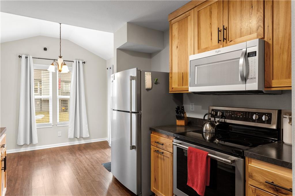 This beautiful home in the desirable Shadow Ridge Subdivision offers a fantastic location and a flexible 4-bedroom, 2-bathroom layout. With the option to choose your primary bedroom on either the upper or main level, this home caters to your personal preferences. New roof, New HVAC, New Windows, Fresh interior paint throughout. All appliances are less than 2 yrs old and all included, even commercial washer and dryer. The upper level boasts two bedrooms, each equipped with double closets and convenient access to a full bathroom. Meanwhile, the main level features two additional bedrooms, one of which offers a spacious walk-in closet and direct bathroom access. The updated kitchen is a highlight of this home, featuring beautiful custom hickory cabinets, new countertops and LVP flooring. There's an abundance of cabinets and counter space. You have the choice of casual dining in the eat-in kitchen or hosting more formal meals in the dining area. Work from home? Plenty of space for an office, craft room, play area or workout equipment. Main level laundry room. The property has been well-maintained, with a new roof installed in 2019, ensuring peace of mind for the future. Fresh interior and exterior paint. Its location is also a strong selling point, with easy access to K10, De Soto, Kansas City, Lawrence, Eudora Middle School, and Eudora High School, making it a convenient choice.