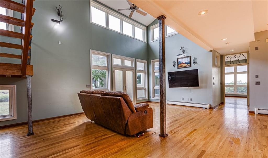 Sitting at the end of a nearly half mile driveway is this unique, 2985 square foot, 3 bedroom, 2 bath, 1 story home on 100 acres, more or less, in Anderson County, KS. Youll find an open floor plan which includes a huge master suite wing that is connected to the main body of the home by way of a large office which could be used a library, home school room or family room. Off that suite is your own private sunroom in which you will enjoy picturesque views of the countryside and neighboring lake. The main body of the home is wide open with the kitchen, dining and family rooms designed for easy communication and entertaining! The upstairs includes two large bedrooms with a large bathroom. Youll love the hard wood floors throughout and everywhere you look there are windows, lots of windows. Natural light flows in abundance. The home sits on a full unfinished basement ready for your finishing touches or storage. There is a nice 60 x 60 metal horse barn and a nice 30 x 40 metal detached garage/shop! The map is for general reference only and may not reflect exact locations or dimensions. Taxes TBD. Aerial map, created with Surety Pro paid subscription & used with permission from AgriData, Inc. The map is for general reference only and may not reflect exact locations or dimensions.