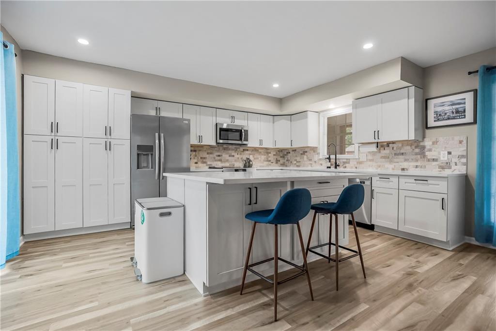 Prime Overland Park for this beautifully remodeled ranch home in the award-winning Shawnee Mission East School District. This home offers almost 3,000 sq. ft. of main level living space, and every detail has been thoughtfully renovated. As you step inside, you're greeted by a spacious open-concept living/dining room featuring refinished hardwood floors, black ceiling beams, & dual sliding doors that open to a large concrete patio – perfect for indoor-outdoor entertaining. The remodeled kitchen boasts: A large center island, stainless steel appliances, including an induction range with air fryer, Soft-close hardwood cabinetry, Stunning quartz countertops, A see-through fireplace connecting the kitchen and dining area. This true ranch offers 4 generously sized bedrooms including primary all on main level, each with its own fully remodeled en-suite full bathroom featuring: Modern vanities, ceramic tile flooring & showers, Updated toilets & plumbing fixtures, Stylish light fixtures & black hardware. Additional main-level features include: A main level family/rec room (Could convert to 5th bedroom), main-level laundry, New solid core interior doors throughout, new carpet, new interior paint, unfinished walkout basement offers incredible potential for a future bedroom, home gym, or additional living space complete with a fireplace. Exterior highlights include: Oversized 2-car garage, Circular front driveway + 2 additional double car driveways, New HVAC system w/ 10 year warranty, New water softener & water conditioner system, Water Heater ( 3 years old), New 6-inch seamless gutters, newer plumbing lines (sewer & water), New windows in bedrooms & kitchen, Spacious patio w/ access from primary bedroom, living room, & kitchen, This home could also be great multi-generational family, plus near shopping, restaurants, freeways & lots of entertainment.