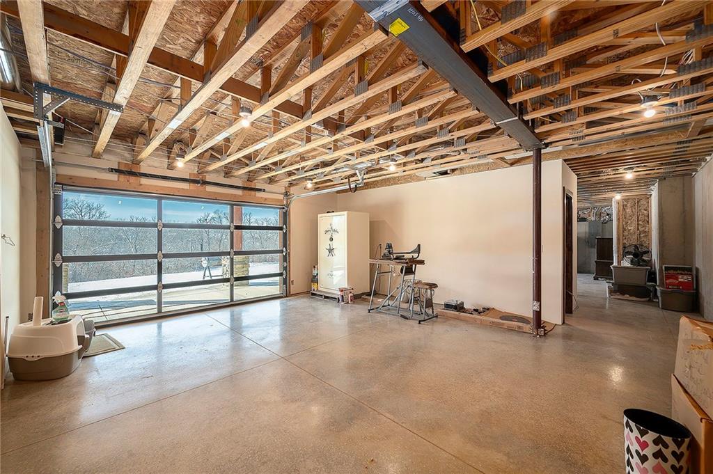 Exceptional custom-built, lodge-inspired home situated on approximately 60± scenic acres, offering privacy, panoramic views, and quality craftsmanship throughout. The home features a striking great room with vaulted ceilings, exposed timber beams, tongue-and-groove pine walls and ceilings, and a floor-to-ceiling stone fireplace with custom built-ins. The kitchen is thoughtfully designed with high-end stainless steel appliances, custom cabinetry, and generous workspace. The primary suite offers a private retreat with a spa-like bath featuring a copper claw-foot soaking tub. Warm wood tones, stone accents, and expansive windows create a seamless connection to the surrounding landscape. Outdoor living includes a covered deck and patio overlooking rolling terrain and timber. The property includes two outbuildings and a mix of open ground and wooded acreage, ideal for hunting, recreation, and nature enjoyment.