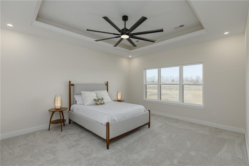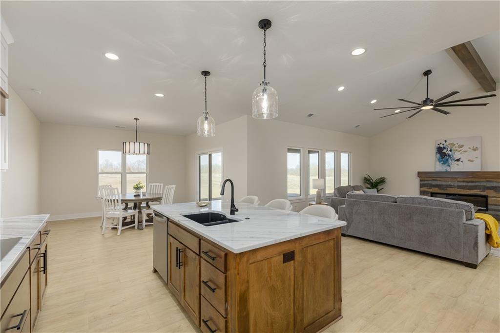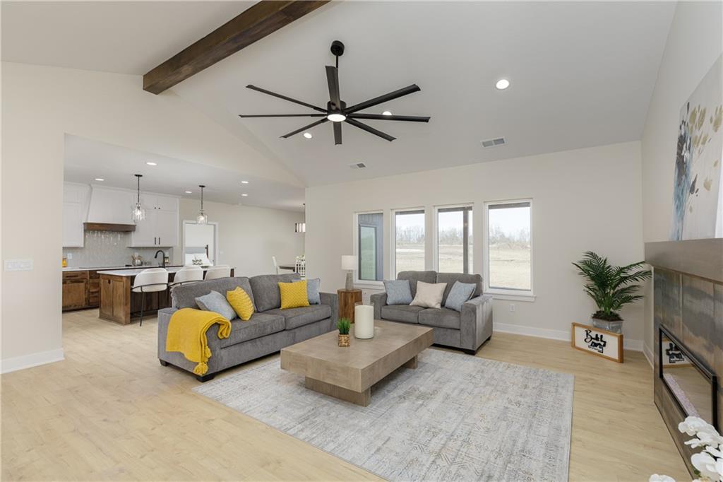 New Price! Come get your piece of country living just outside city limits! Beautiful new construction by Evolution Homes LLC situated on 5.47 scenic acres. This home offers main-level living at its finest with exceptional curb appeal, featuring black windows, attractive stone accents, and a side-entry garage. Step inside to vaulted ceilings with a striking beam and a spacious living room highlighted by a wall of windows and an electric fireplace. The open layout flows into a large dining area, perfect for gatherings. The kitchen is a showstopper with custom cabinetry, marble countertops, stainless steel appliances, a custom hood, and a huge walk-in pantry. The primary suite is generously sized and features a tiled shower with dual shower heads, a relaxing soaker tub, double vanities, and a walk-in closet. Two additional bedrooms and a full bathroom complete the home. Enjoy peaceful country living just outside the city while still being close to everything. Relax on the massive covered back patio—perfect for morning coffee or unwinding after a long day—while taking in the beauty of your 5.47 acres. Owner/Agent.