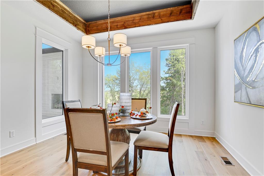 Experience refined luxury in the stunning Bayberry by JFE Construction. From the moment you enter through the impressive 8’ double front doors, you are welcomed by soaring ceilings, dramatic wood beams, and walls of windows that flood the great room with natural light. Expansive sliding doors open to a covered deck with a stone fireplace, perfectly positioned to capture serene greenspace views—an ideal setting for both relaxation and entertaining. The designer kitchen is thoughtfully curated with a large quartz island, stainless steel appliances, rich wood flooring, and an oversized walk-in butler’s pantry, offering both beauty and functionality. The primary suite is a private retreat, featuring a freestanding soaking tub, double vanity, zero-entry shower, and a spacious walk-in closet. A second main-level bedroom or office provides flexible living options. The finished lower level extends the living space with a family room, bar area, game space, two additional bedrooms, and a full bath—perfect for hosting guests. Throughout the home, you’ll find exquisite trim details, wood accent walls, striking black accents, and architectural elements that elevate every space. Located in Canyon Creek Forest, a luxury maintenance-provided, free-standing villa community. Lawn care and snow removal are included, allowing for a truly carefree lifestyle while enjoying all the amenities Lenexa has to offer. Estimated completion April 2026. Still time to make select design choices to personalize this exceptional home. Photos are of a former model and may include upgrades not included in the price.