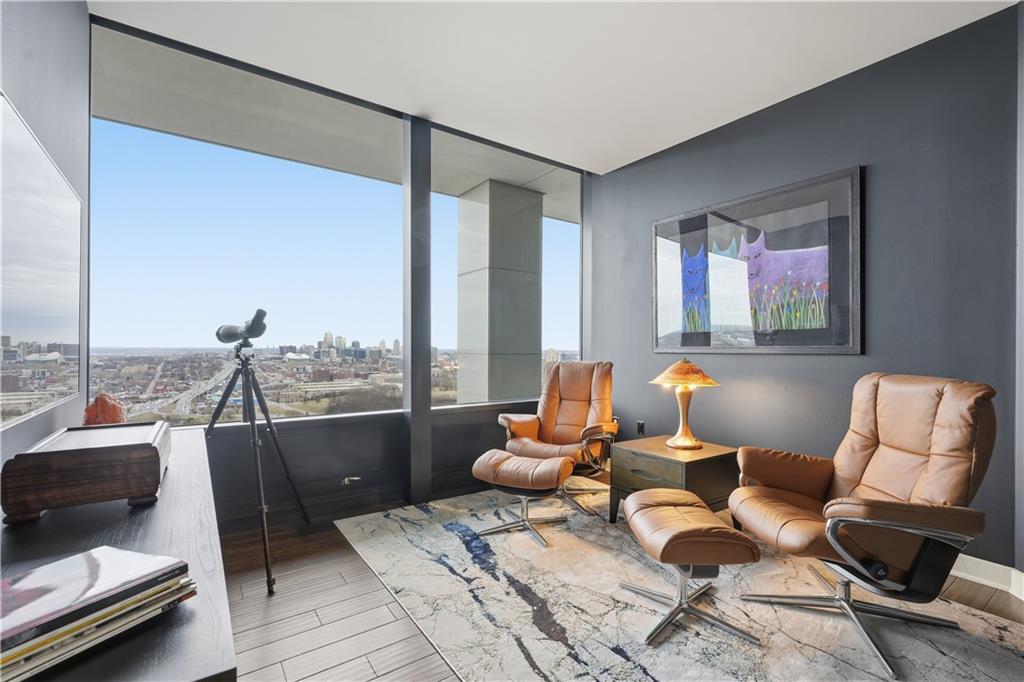Fully Furnished!!! Truly Turn key! Breathtaking views from this 15th floor North facing Condominium at One-Park Place! Floor to ceiling windows provide the most incredible views that you will find anywhere in Kansas City. Condo features open floor plan designer finishes throughout, updated lighting and kitchen hardware, New Refrigerator and Water heater, hardwood floors, Chef's kitchen with expansive island that is great for entertaining, Two generously sized bedrooms with on-suite bathrooms and walk-in closets, addition half bath, den is perfect for an office/study, media room or play room, remote controlled blackout shades on all windows. Resort style amenities include 24/7 concierge, indoor an outdoor salt water pools and hot tubs, Cigar lounge, wine cellar with wine tasting room, golf simulator, fitness center with yoga room, steam rooms, massage therapy suite, event space with full kitchen, game room, billiards table, plaza level outdoor space with putting green, private dog park, self-service dog spa, outdoor grilling and entertaining spaces. Furnishing include all furniture items, area rugs and televisions. Sellers are willing to sell un-furnished, but will leave the TVs and reduce sell price by $35K if buyer does not want furnishings. Orange chairs and lamp in den are excluded from furnishings.