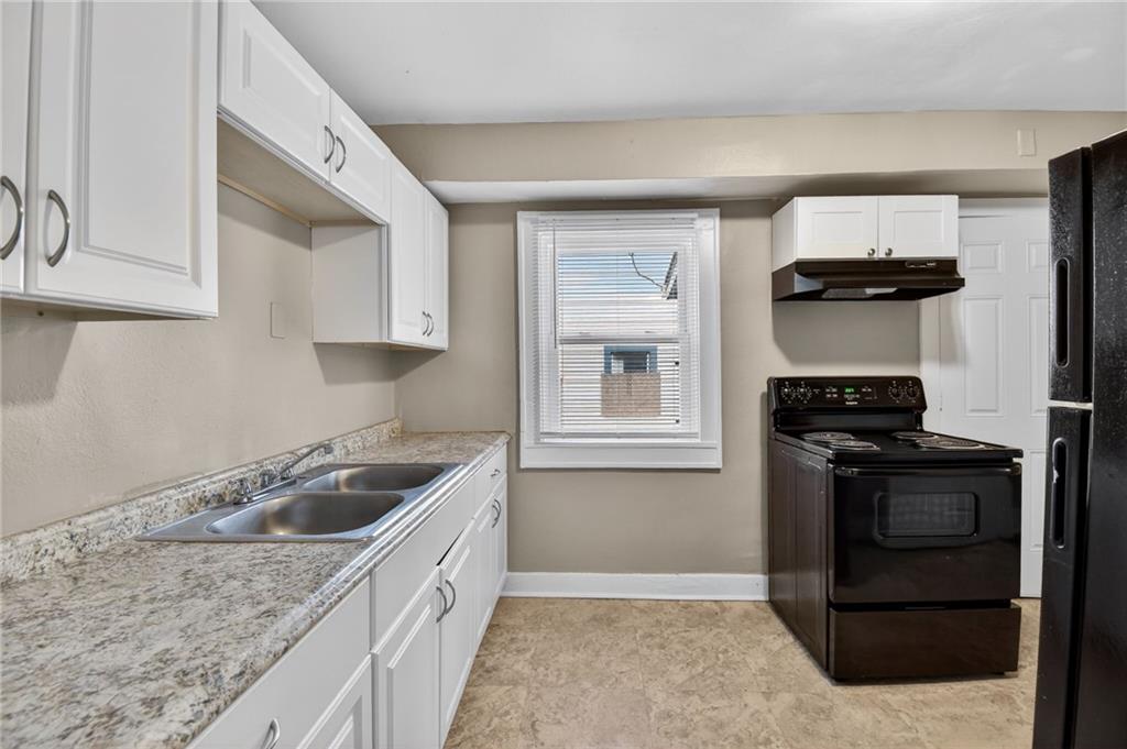 This charming bungalow blends classic character with modern touches, featuring a welcoming front porch and a spacious driveway with ample off-street parking. Inside, rich wood-style flooring and neutral tones create a warm, inviting atmosphere throughout. The living room offers built-in shelving and abundant natural light, flowing into a bright dining area. The kitchen is equipped with white cabinetry, granite-look countertops, and tasteful black appliances. Three comfortably sized bedrooms offer flexibility, while the full bathroom showcases tiled walls and a decorative inlay. A full unfinished basement provides generous storage or workspace potential. Set on a deep lot with a partially shaded backyard, this home offers both indoor comfort and outdoor space to enjoy.