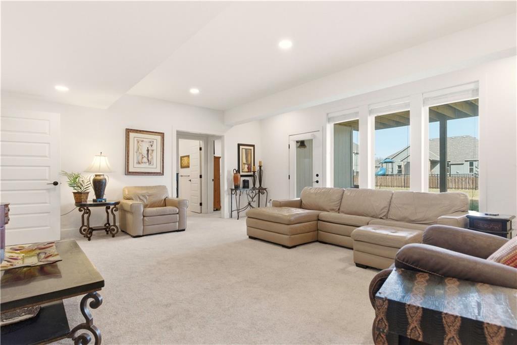 Better than New! Gorgeous Ranch home with Finished Walkout on Large Fenced Yard. Prepare to be impressed with this nearly new home with soaring 13' Ceilings, an Open Floorplan, Abundance of Windows, Amazing Wide Plank White Oak Floors on Main Level, Eye Catching Wood Beams in Great Rm Ceiling, Beautiful Wood Accents such as Windows Seats, & Plantation Shutters. Curb Appeal & the Exterior is Awesome with Timber Entrance, Huge Covered Deck, Large Patio and fully Fenced Yard. You will love the Kitchen with a Huge Quartz Island, Custom Cabinetry, Pantry,6 Burner Gas Cooktop; which opens to a lovely Breakfast area. This true Ranch is home to the Primary Bedroom and 2 additional Bedrooms on the Main Level. The Primary Bathroom will not disappoint with Quartz Counters, Large Soaking Tub, Spacious Tile Shower, and Real Stone Floors. Your Entertaining space greatly expands with a Finished Walkout offering a Large Family Room and 2nd Kitchen with Quartz Counters and areas appointed for a mini Refrigerator and Dishwasher. Note very nearby storage allows space for a Full Sized Refrigerator. 2 Spacious Bedrooms and Bathroom with adjoining exterior Patio complete the Lower Level that is perfect for a Separate Quarters. Here is your chance to skip the building process and enjoy all the perks of a nearly new home that already has the landscaping, window treatments, and all those needed home owner adds once you first move in while enjoying all the amenities of Lee's Summit and nearby Legacy Park!