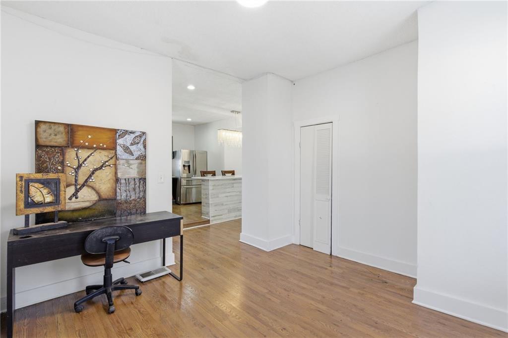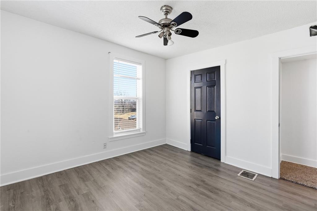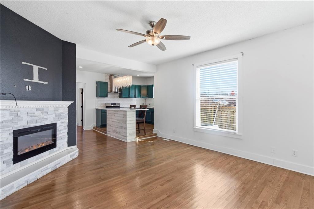 Enjoy your mornings or evenings from the inviting front porch of this charming home. Inside, you’re welcomed by beautiful hardwood floors that flow into the living room, where a stone fireplace creates a warm and cozy ambiance. The kitchen features painted cabinets, a tile backsplash, granite countertops, and a functional island. A formal dining room provides ample space for a full-size table, while a convenient laundry room with half bath is located on the main level. Upstairs, the spacious primary bedroom includes built-in shelving for added character and storage. The updated full bathroom offers a tiled shower, tile flooring, a newer vanity, and granite countertops. The attic space presents exciting potential for additional bedrooms or living space if desired. Outside, enjoy easy alley access at the rear and a nearly completed fenced yard. Located in a highly central area close to shopping and dining, this home offers comfort, charm, and opportunity all in one.